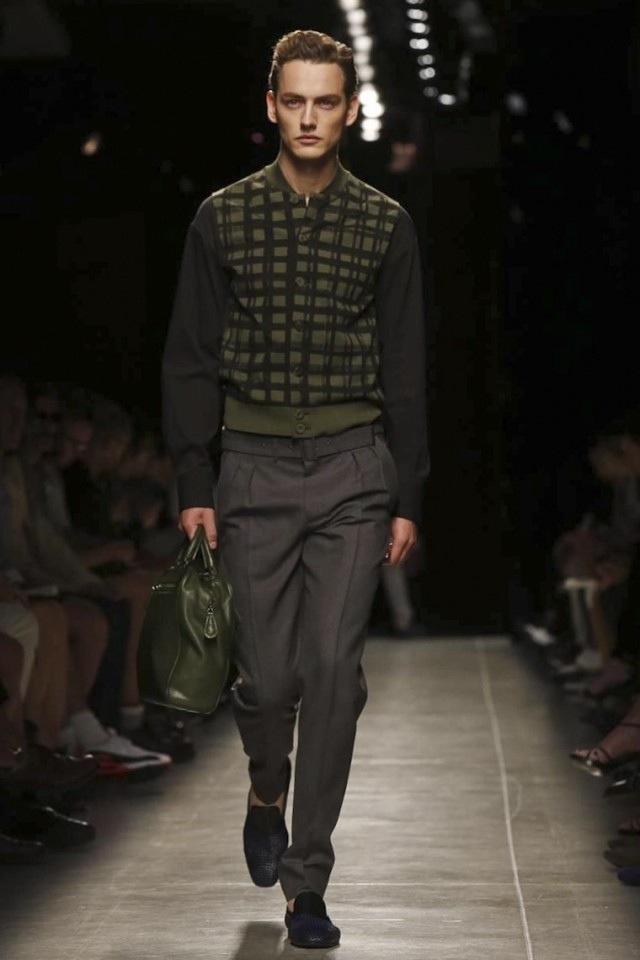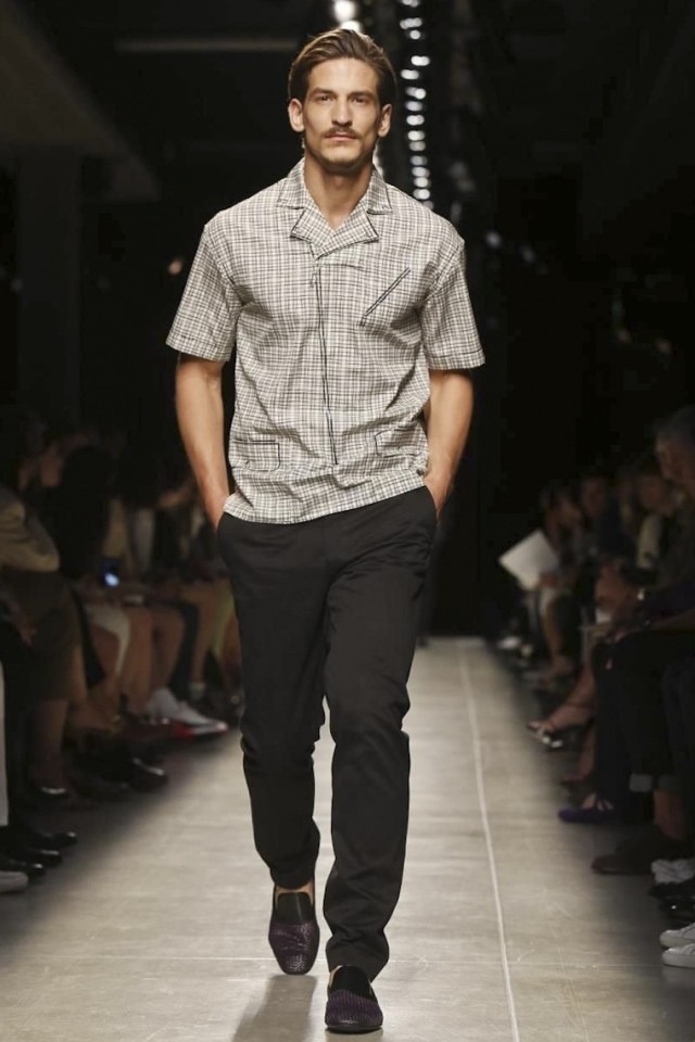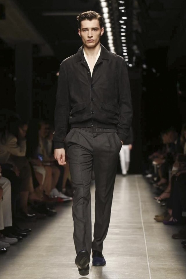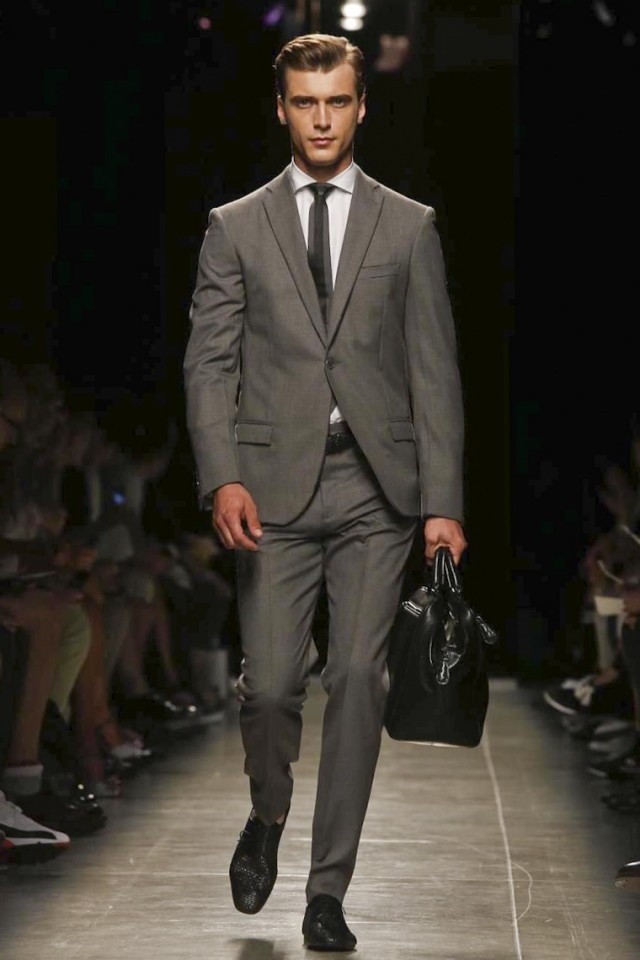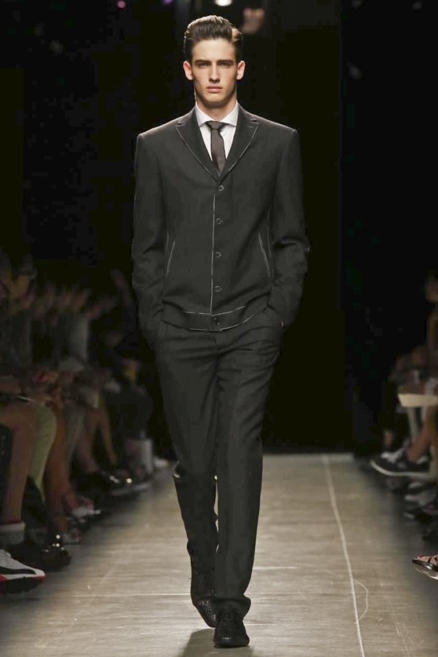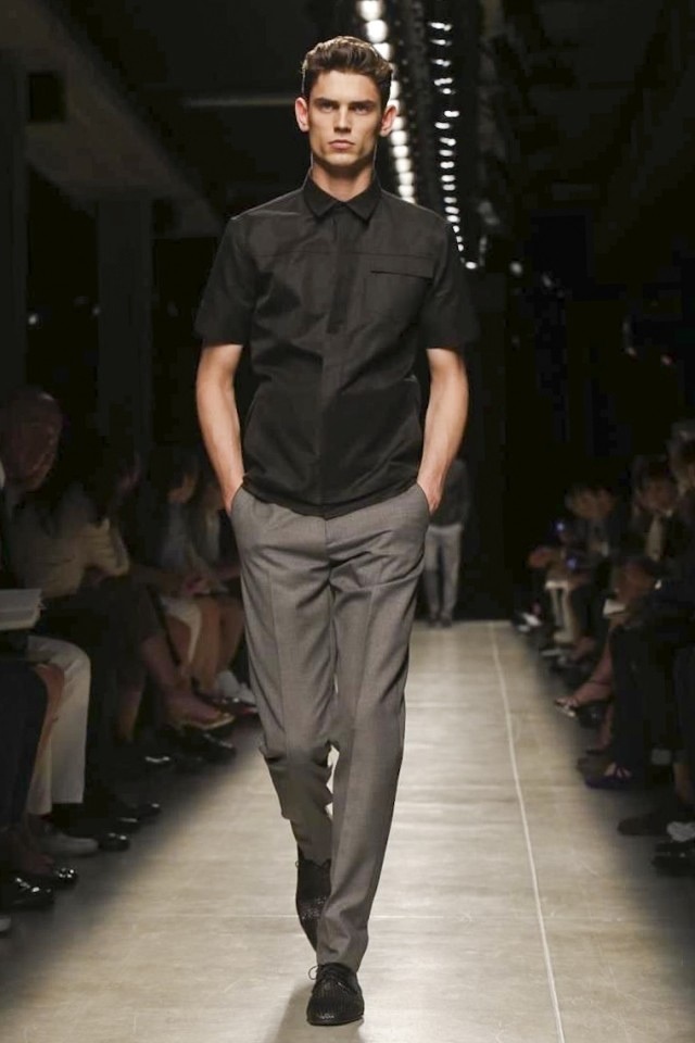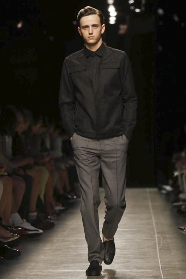 Le défilé s’ouvre avec Clément Chabernaud et des looks orientés business : costumes, cravates et chaussures en cuir tressé font partie de l’uniforme de l’homme Bottega Veneta. Gris, noir, beige : l’à-propos est la simplicité et la modestie pour cette collection printemps/Été 2014. Les vêtements sont d’ailleurs construits de sorte à décortiquer le processus de création et on retrouve des marquages similaires à ceux des patrons.