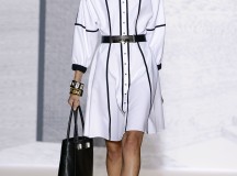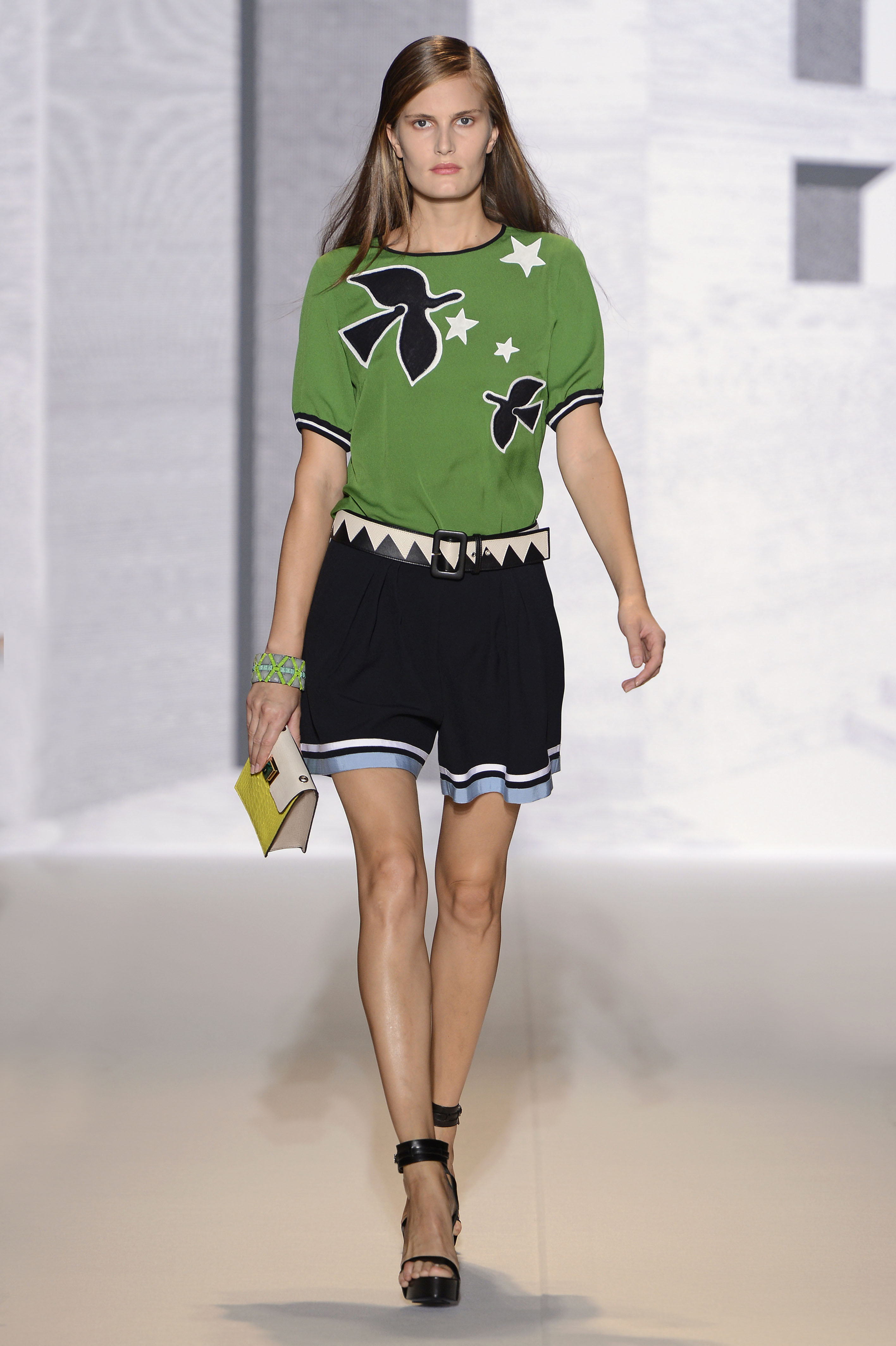 Robes fourreau, superposées de python noir et dentelle. Ruban noir sur short de soie menthe verte ou noir. La pièce phare de la collection est une robe bleu intense brodée d’un profil cubiste. Robe fluide fourre-tout en cuir noir, rayé de cognac et applique en serpent. Marinière sans manche, jupe patchwork de soie. Haut de soie aux colombes d’inspiration Braque, short de sport bleu ciel et blanc. Top manches chartreuse d’insiration « guitare » de Fernand Léger…
