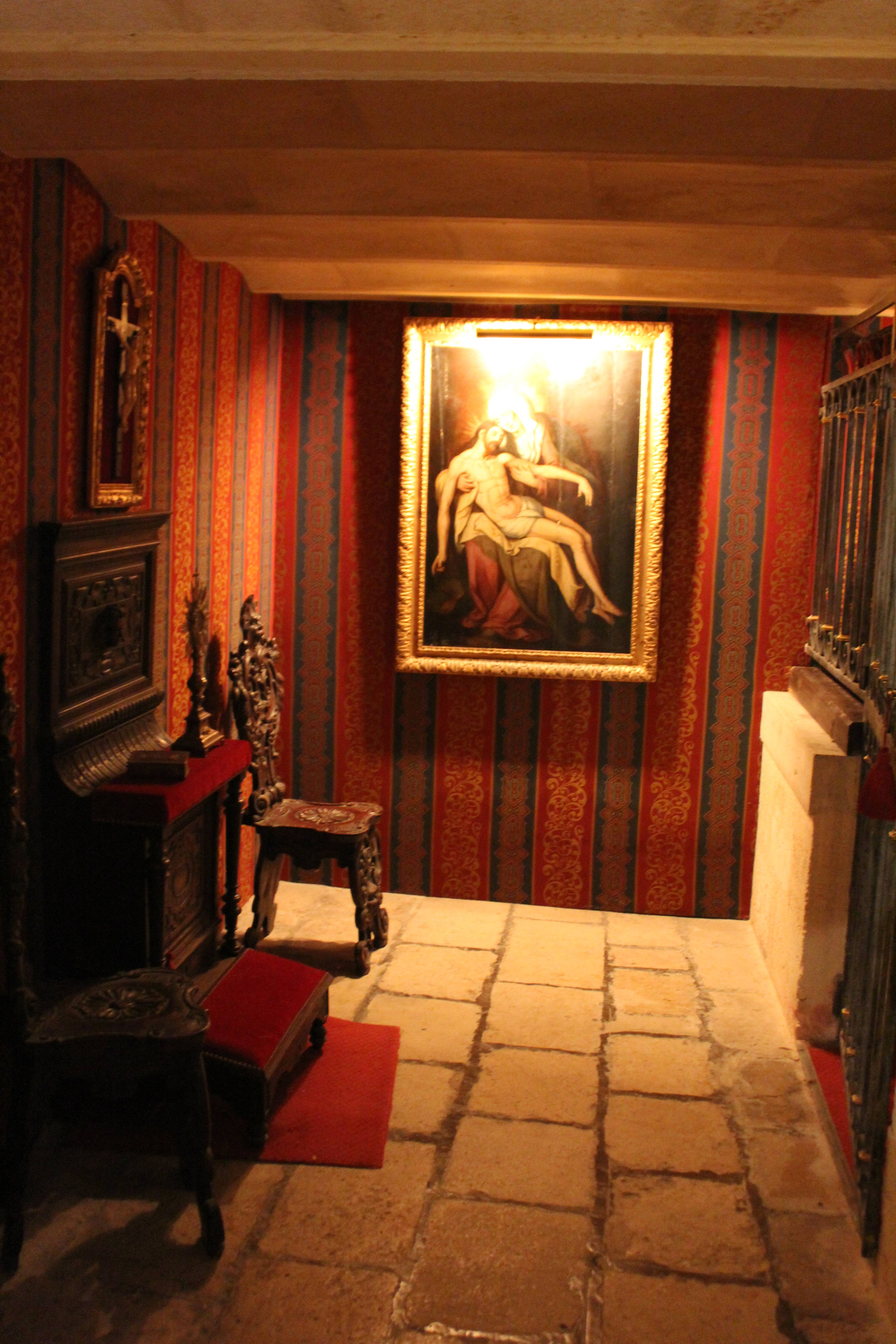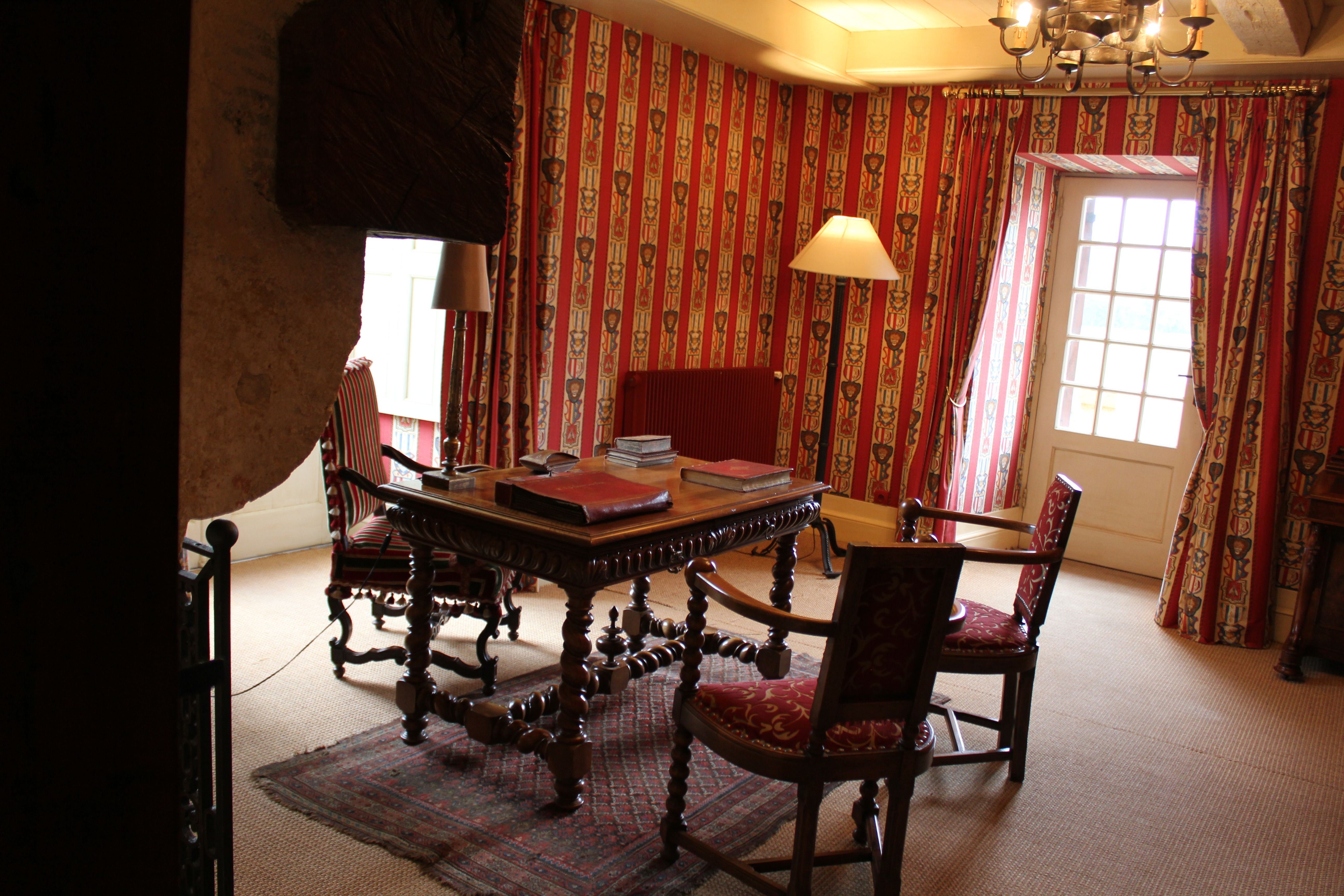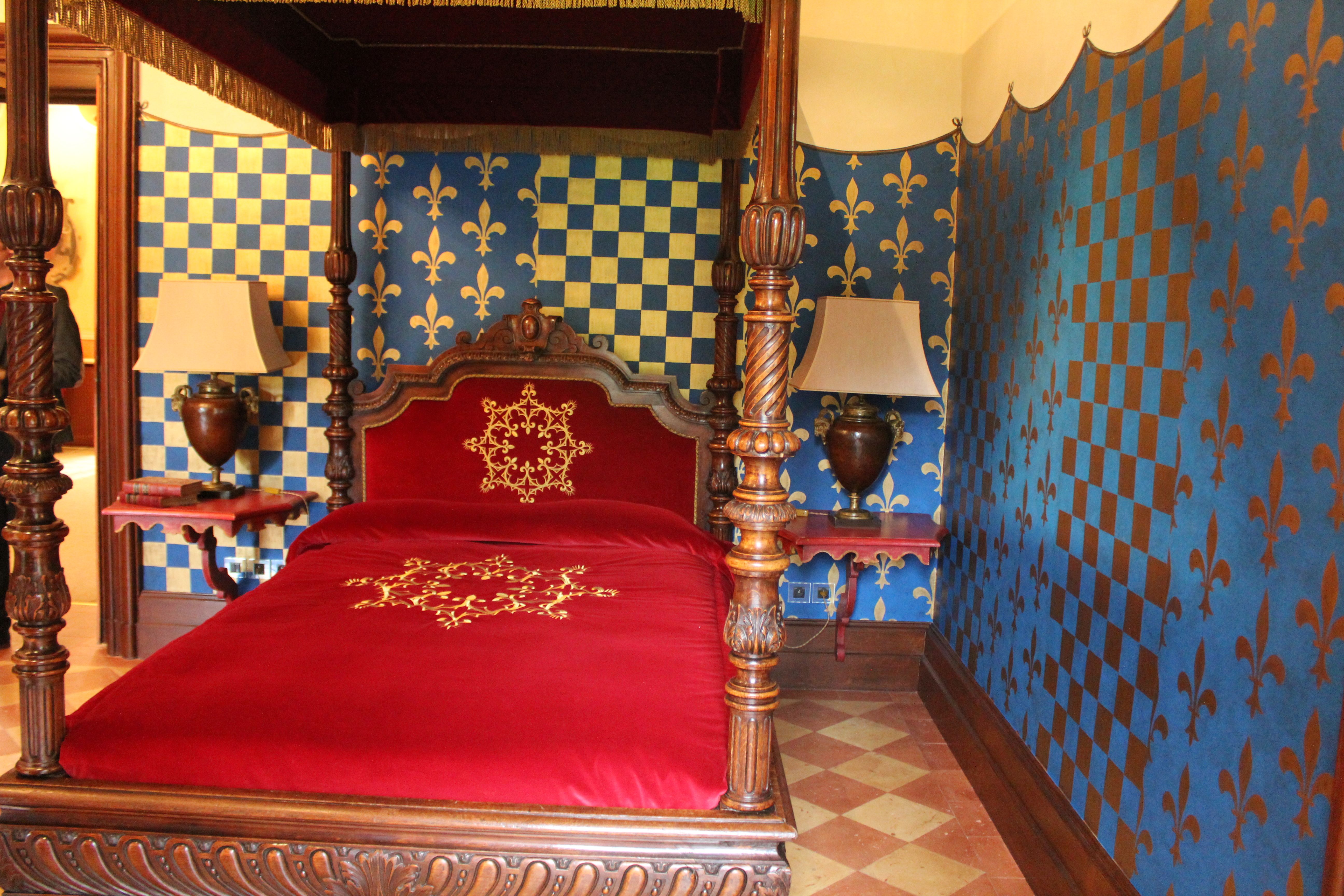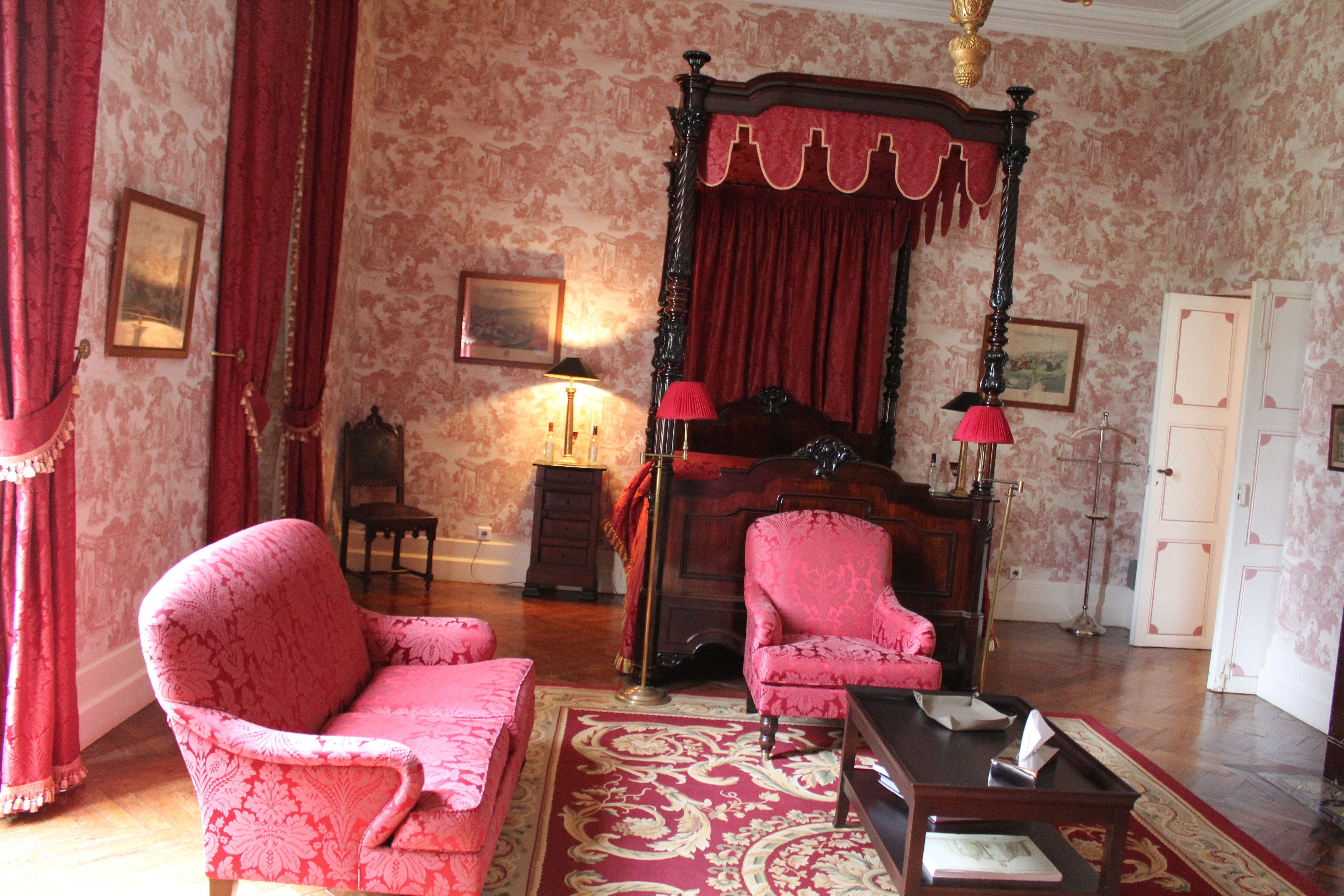 S’offrir le luxe d’un séjour dans cette chambre médiévale c’est rejoindre le lit à baldaquin Renaissance en chêne sculpté en évoluant sur un sol en terre cuite artisanal. L’esprit s’évade dans la magie du moyen-âge où la nature enchanteresse, la tradition du bestiaire des contes anciens et la souveraineté règnent. Lions qui ornent le ciel de lit au feuillage doré, béliers de bronze siégeant sur les lampes de chevet, et fauteuils de style aristocratiques en velours rouge et brodés d’or de chaque côté de l’ancienne cheminée aux feuilles de houx, le décor est posé. Derrière les drapés bleus Roy, les étoffes rouges et les broderies en fleurs de Lys se perpétue l’histoire d’une mémoire médiévale.