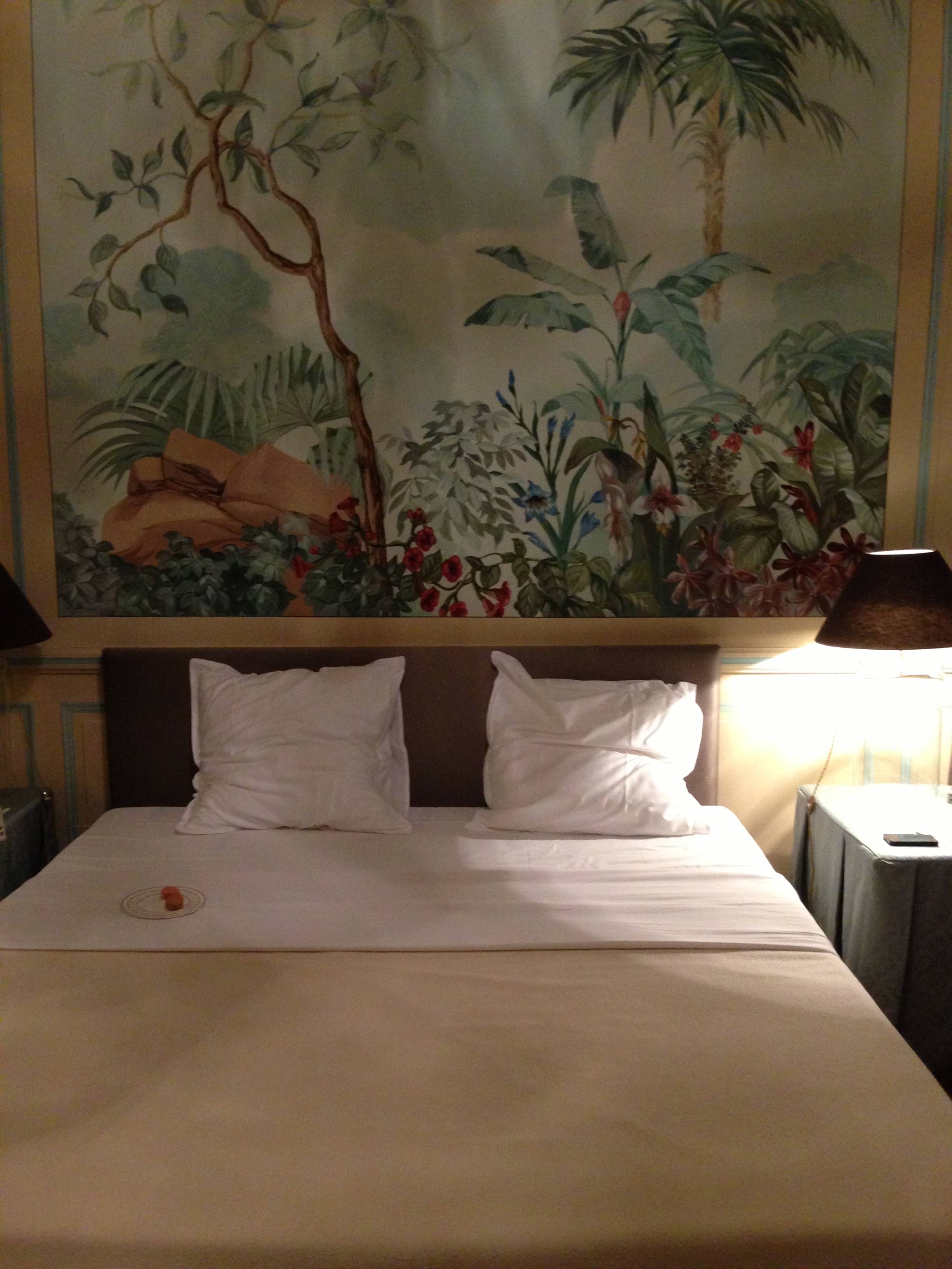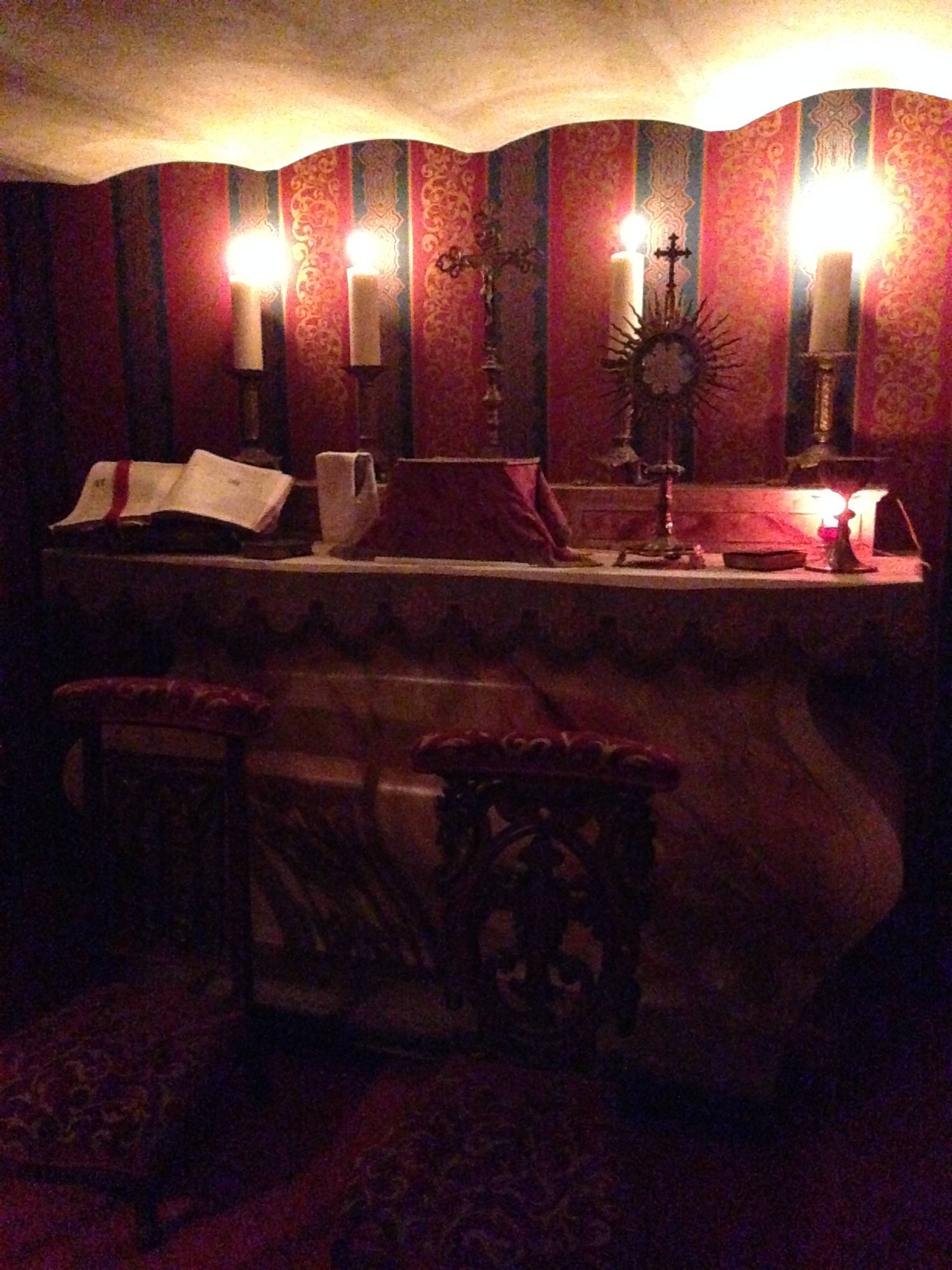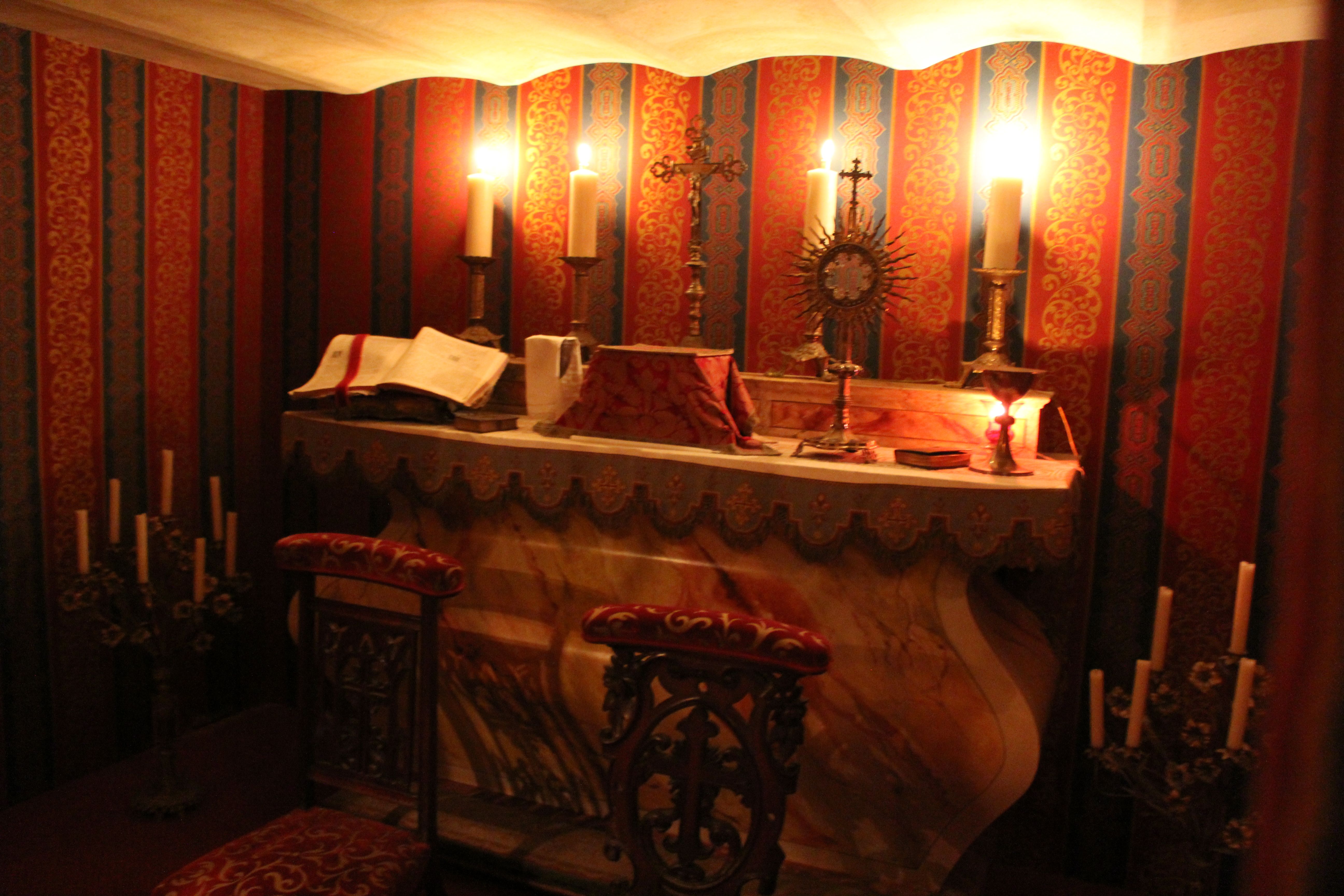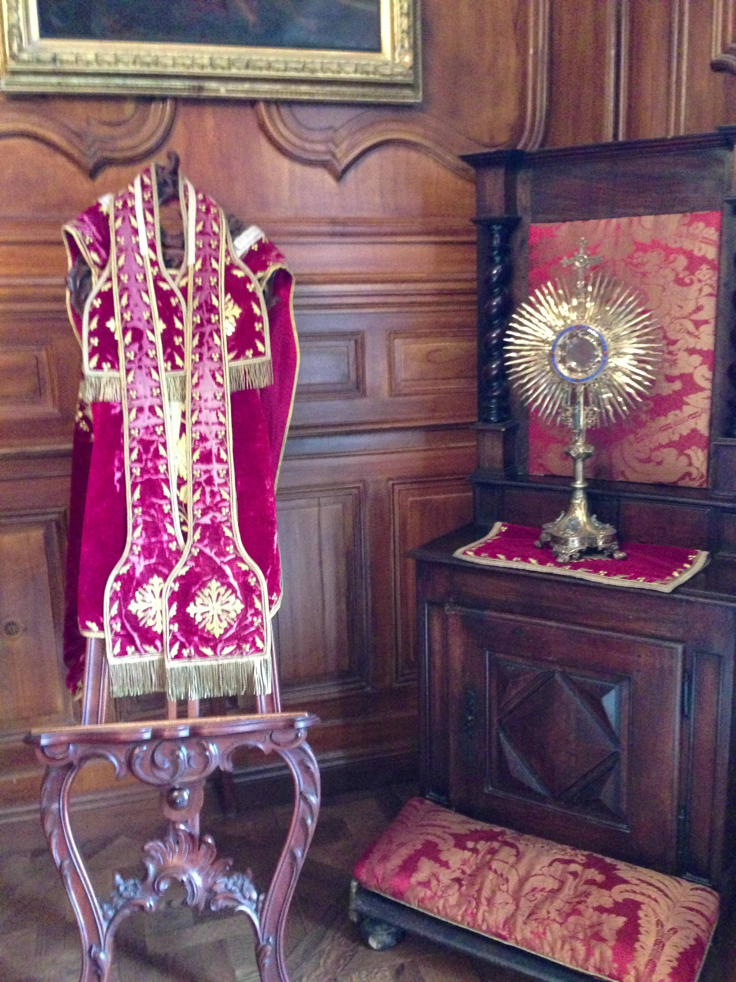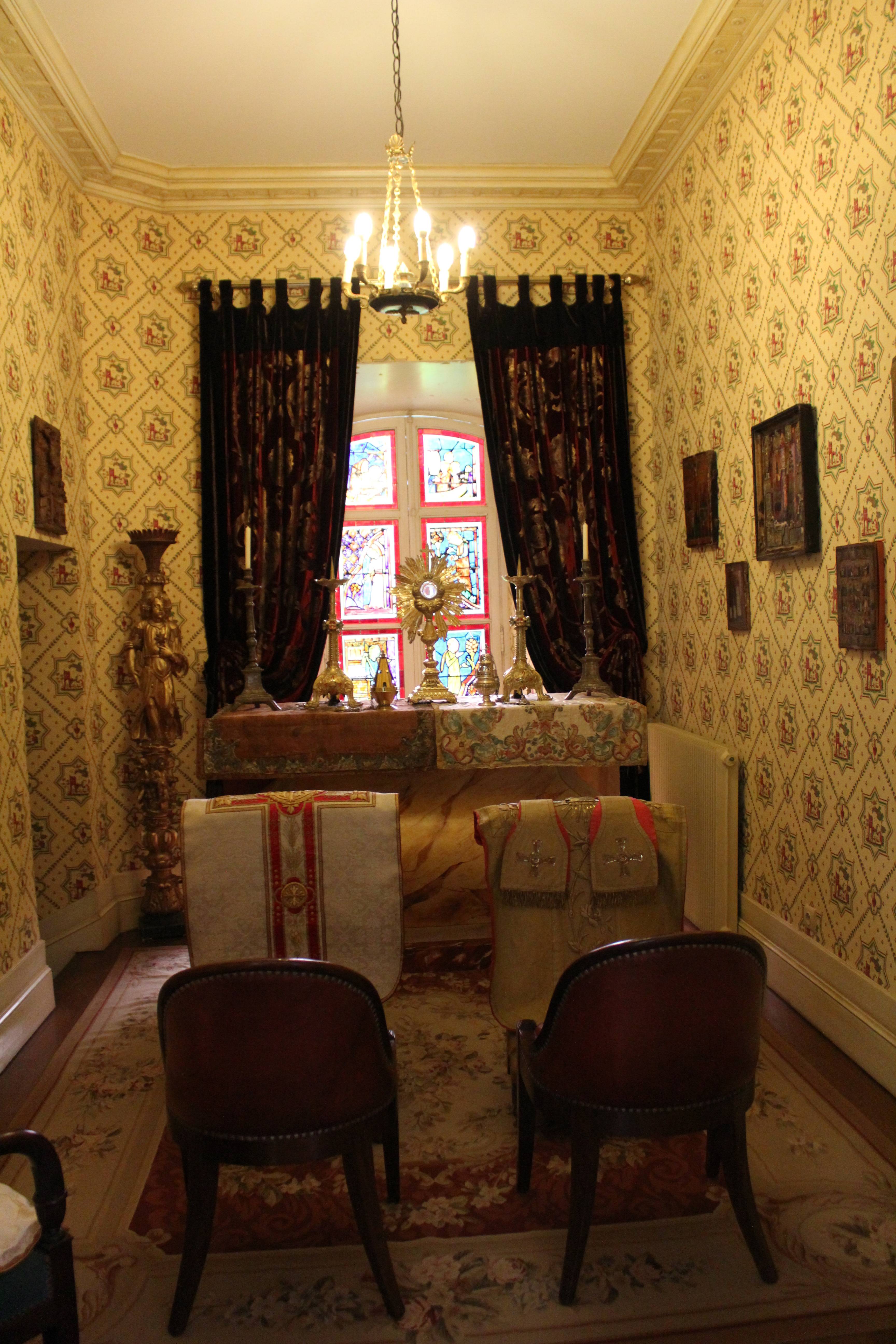 S’offrir le luxe d’un séjour dans cette chambre médiévale c’est rejoindre le lit à baldaquin Renaissance en chêne sculpté en évoluant sur un sol en terre cuite artisanal. L’esprit s’évade dans la magie du moyen-âge où la nature enchanteresse, la tradition du bestiaire des contes anciens et la souveraineté règnent. Lions qui ornent le ciel de lit au feuillage doré, béliers de bronze siégeant sur les lampes de chevet, et fauteuils de style aristocratiques en velours rouge et brodés d’or de chaque côté de l’ancienne cheminée aux feuilles de houx, le décor est posé. Derrière les drapés bleus Roy, les étoffes rouges et les broderies en fleurs de Lys se perpétue l’histoire d’une mémoire médiévale.