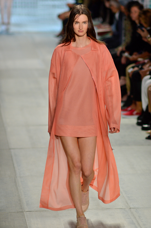 Lacoste confirme années après années son renouveau créatif. Pour cette saison printemps eté 2014, Felipe Oliveira Baptista est parti de la ligne blanche, celle qui délimite le terrain de tennis ou qui tranche avec la couleur sur un vêtement. Ce sens de la coupe et de la ligne, inspiré par l’architecture et le trompe l’oeil, se retrouve sur l’ensemble de la collection qui revisite avec modernité les classiques de la maison comme les polos, manteaux et robes fluides. L’esprit est lifestyle et léger et magnifie le sportswear.