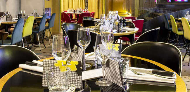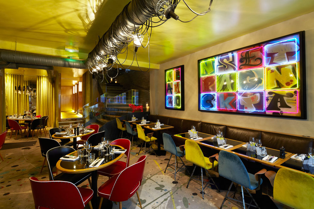 Le restaurant Le 107 à Neuilly, reprend le design des sixties et a été pensé par Gilles Guillot, architecte du restaurant le Floreal dans le 11ème arrondissement de Paris. Il a imaginé un lieu simple et convivial où l’on se sent bien. Murs en briques noires cirées, mobiliers créées spécialement pour le lieu et la fameuse mascotte du 107 : un puzzle à grand échelle. Un lieu se veut cosy et intimiste.