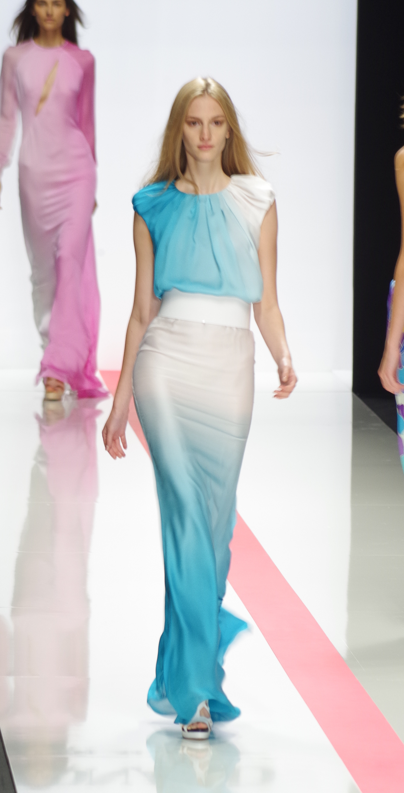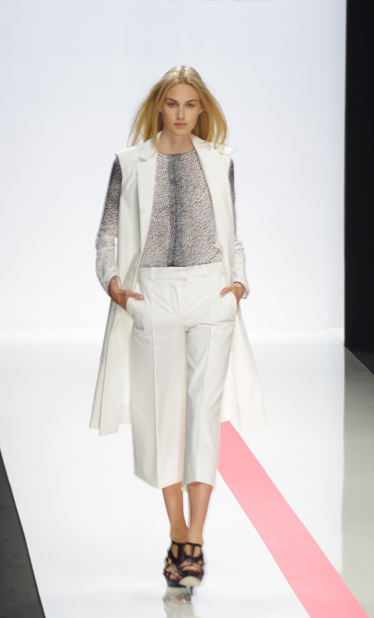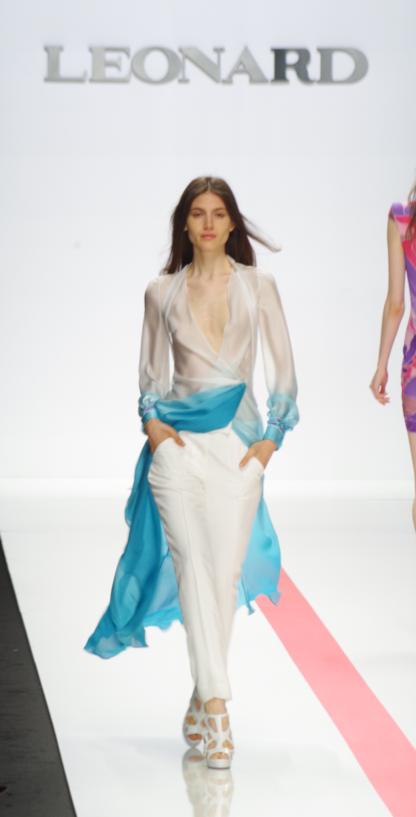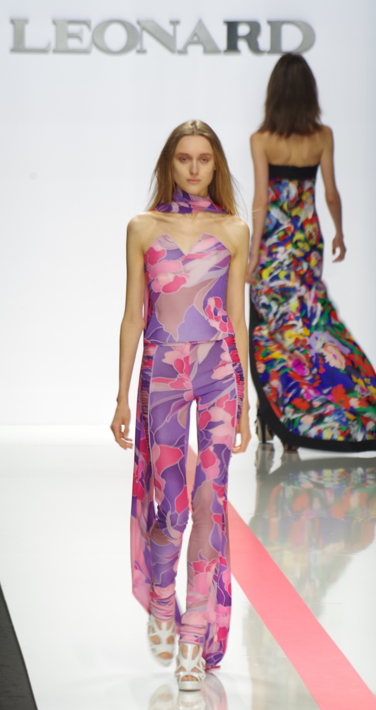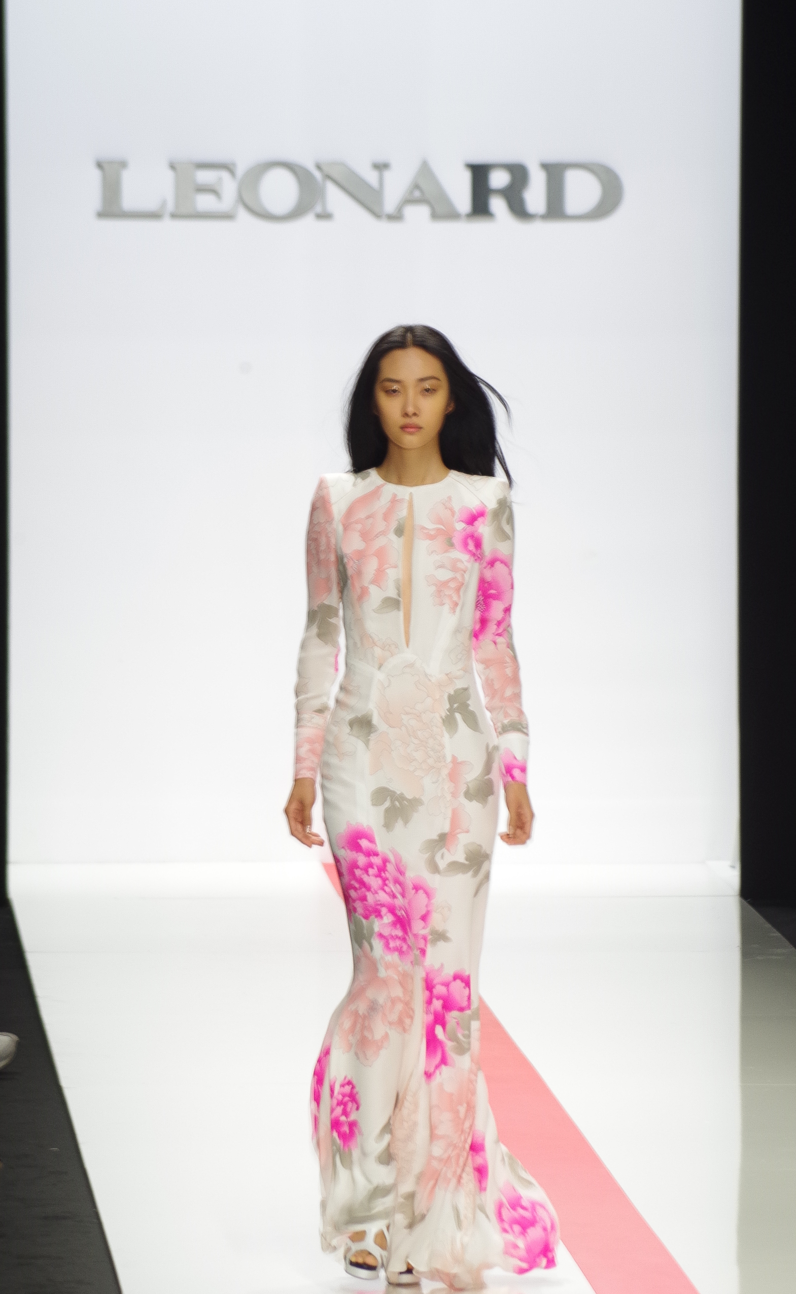 La femme Léonard de l’été 2014 est sophistiquée, espiègle et dynamique. Elle mixe une aisance élégante et une allure plus sportive. Fidèle aux classiques de la maison, ce sont les imprimés qui sont au cœur des débats. L’inspiration de cette saison est eighties. Urbaine et libre, la femme Léonard conjugue des jupes asymétriques à un blouson bleu roi et jersey de soie imprimé, elle devient une oeuvre d’art grâce à des imprimés forts et inspirés de l’Art Nouveau et des vitraux Tiffany. La nuit, elle se pare de noir et blanc aux effets pointillistes. Elle devient sensuelle et féline en robe smoking ou body.