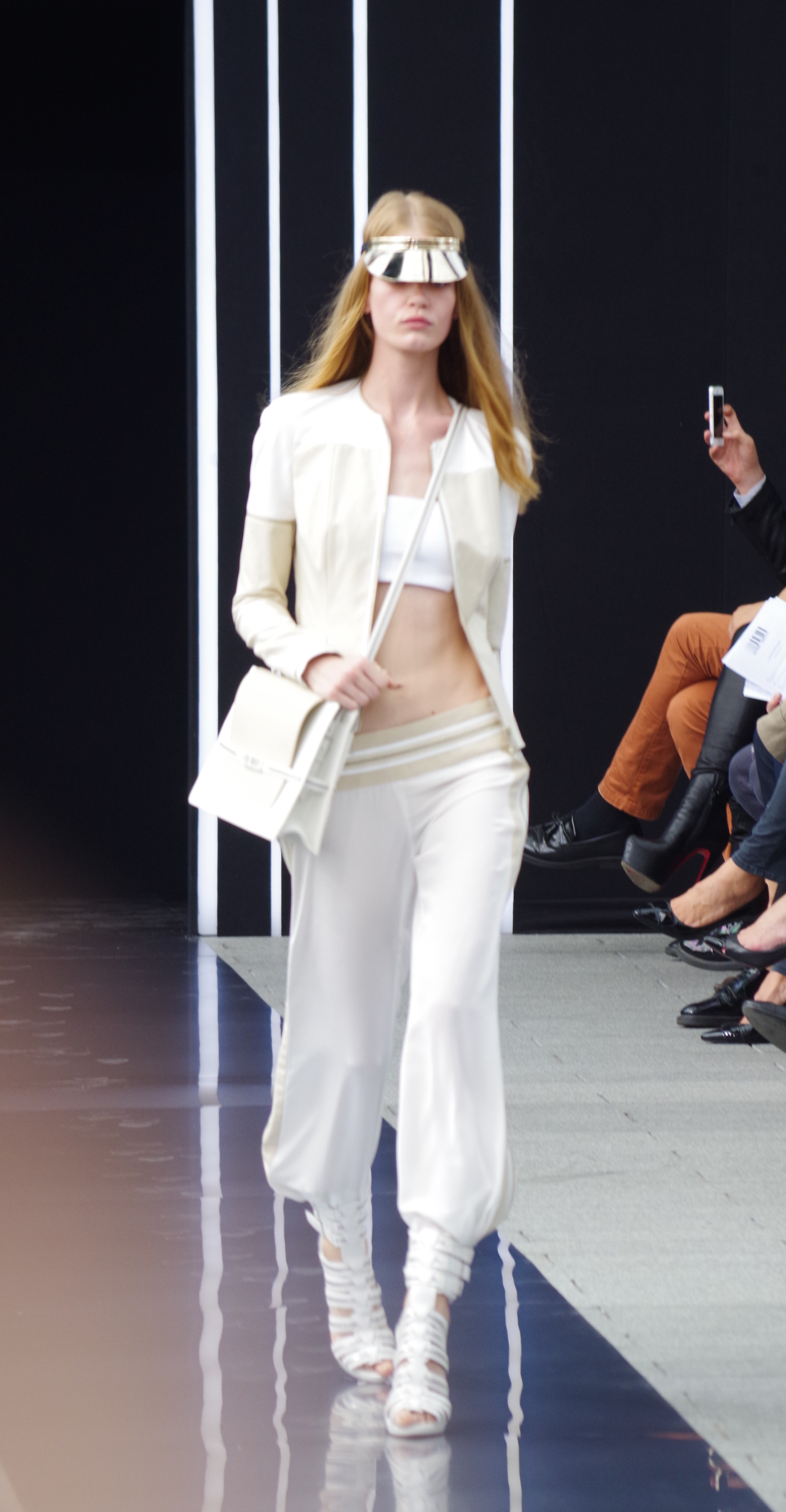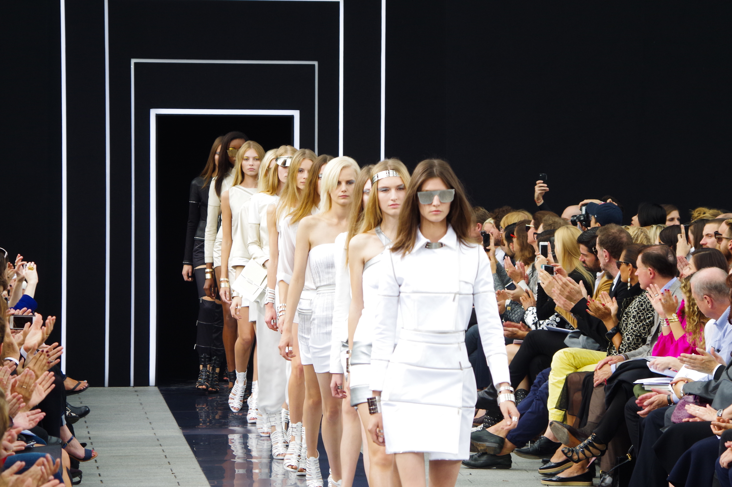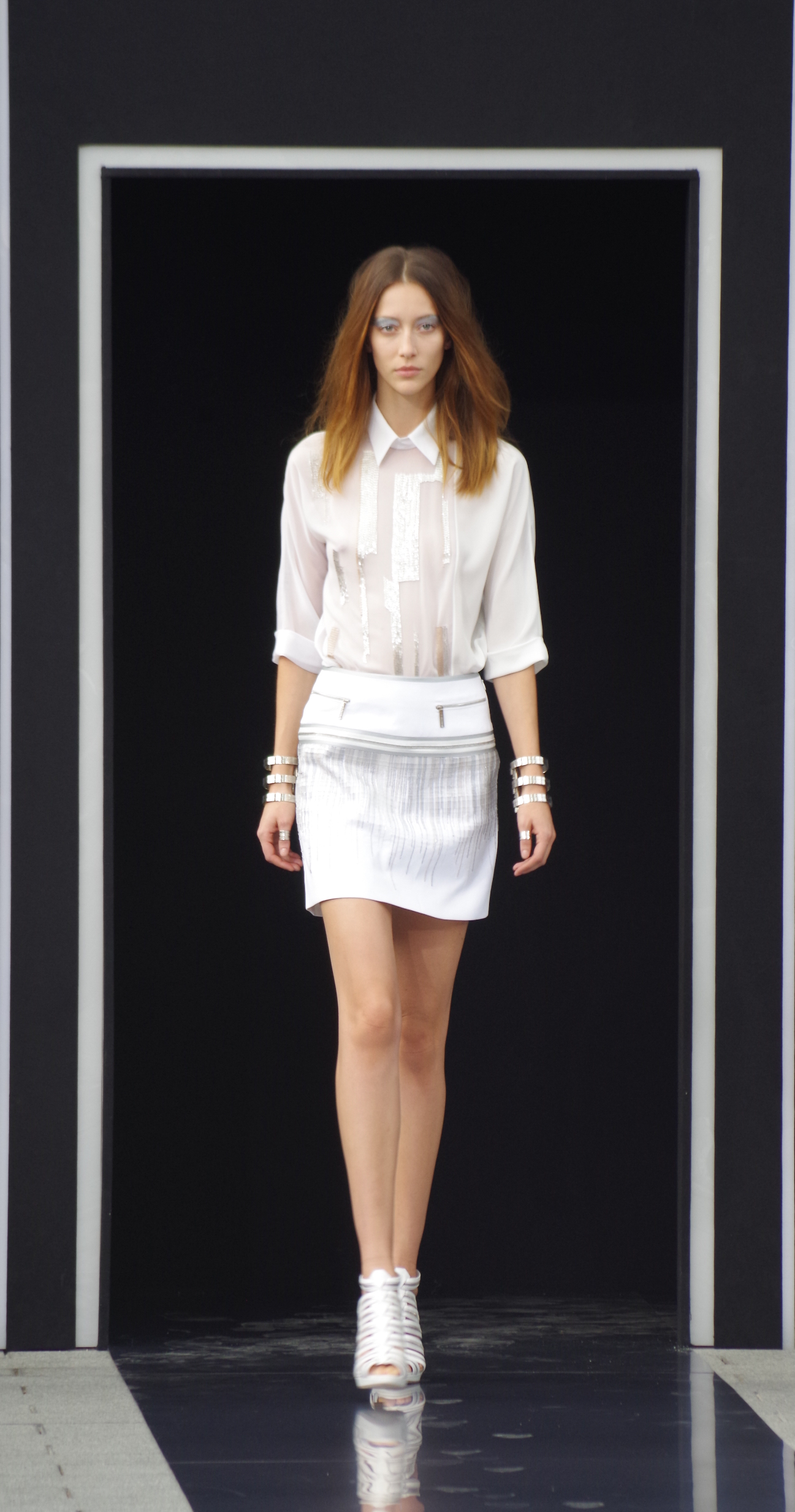 Maxime Simoens présentait dans l’enceinte de l’Orangerie du Parc André Citroën sa collection Printemps Été 2014, une collection moderne, étincelante, éléctro et métallique.