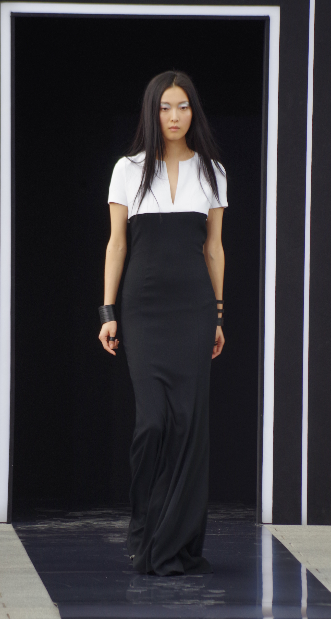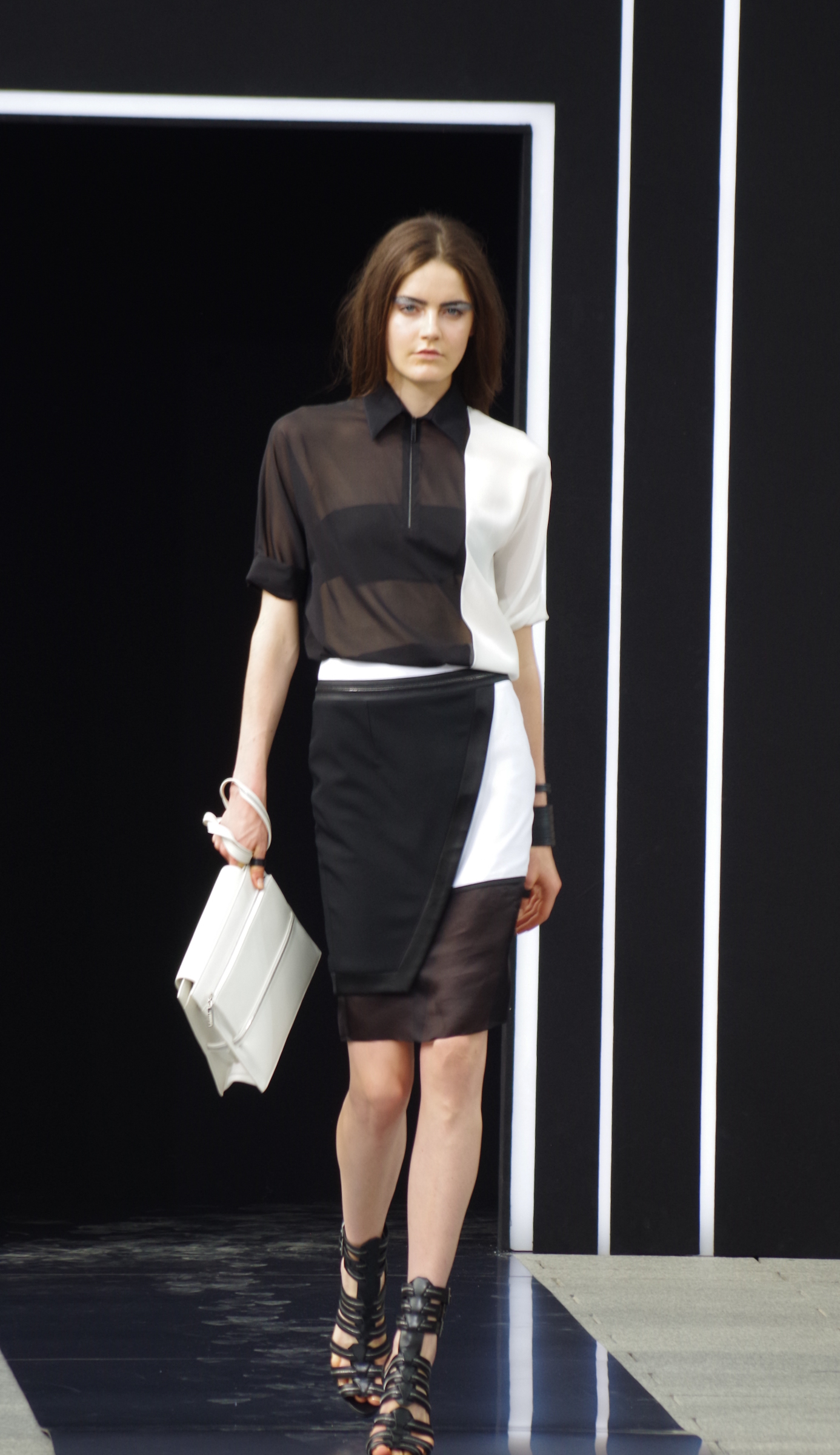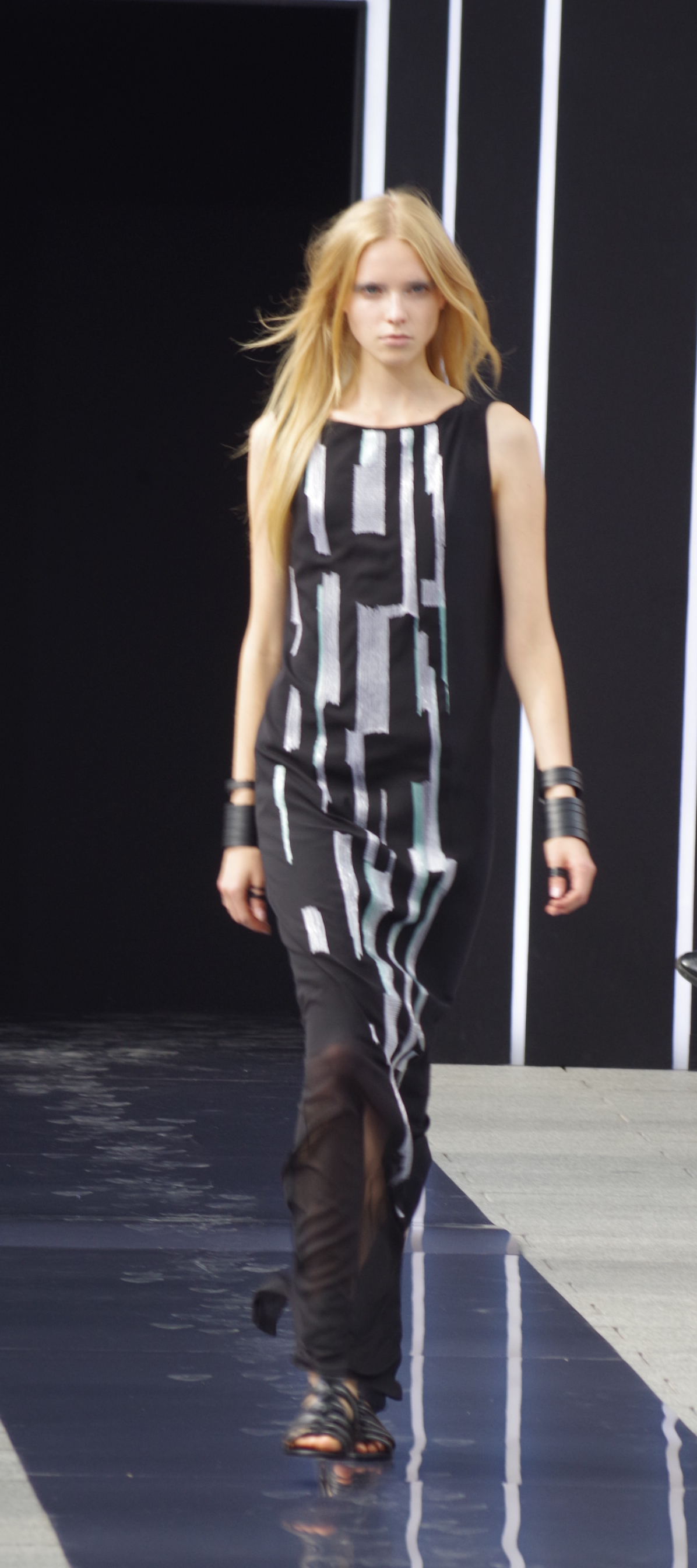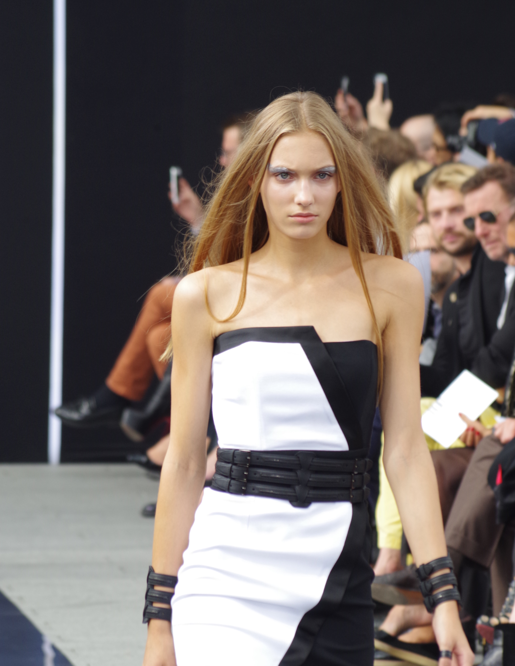 La femme Simoens est zippée, moulée, les tenues sont courtes millimétrées. On remarque l’absence de couleurs puisque les noirs et les blancs sont omniprésents, laissant parfois apparaître un gris ou turquoise magnifique.