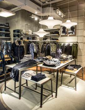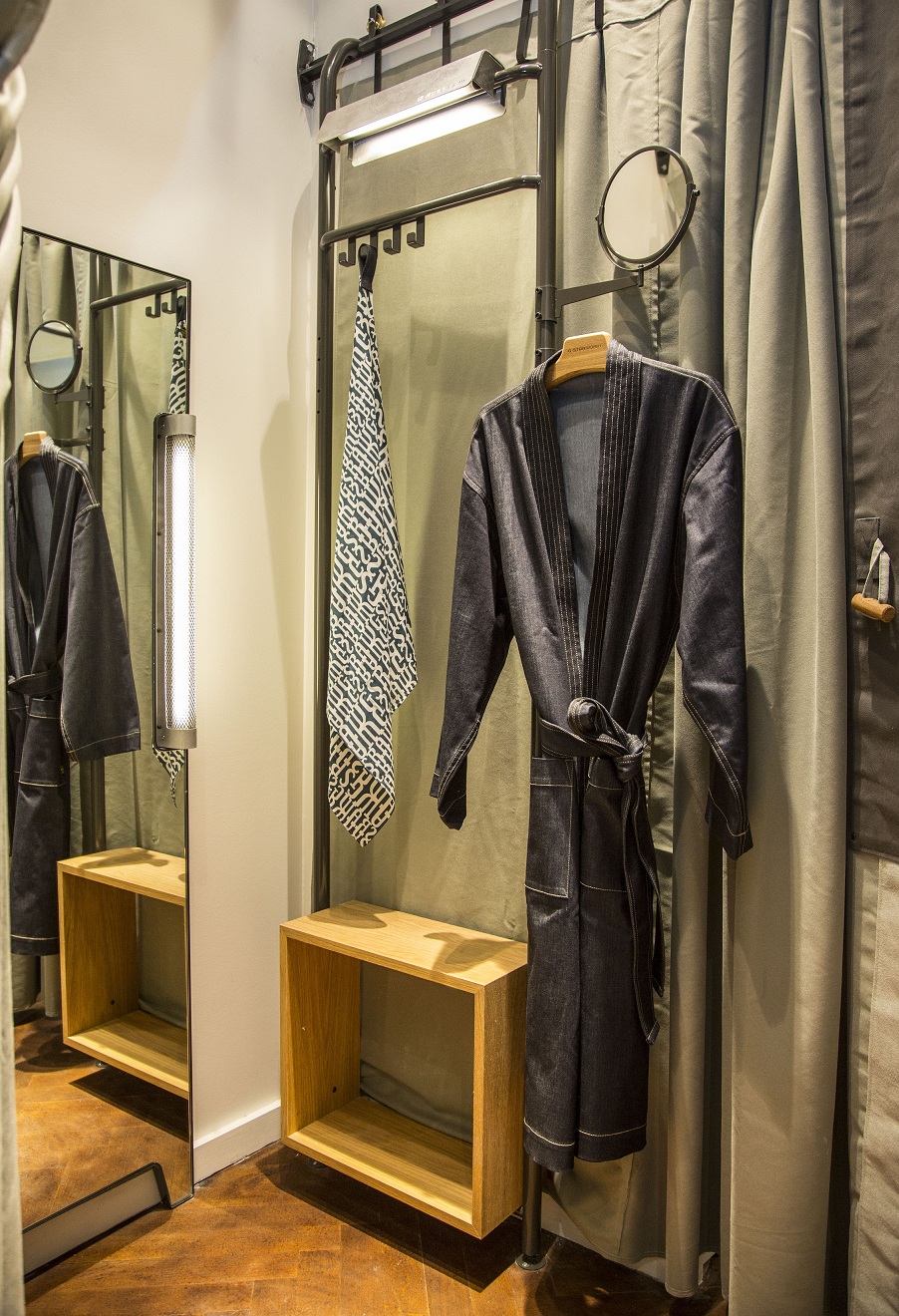 Une boutique de 96m2 entièrement dédiée à la femme au design fort, composé de matériaux épurés, élégants mais aussi très bruts. Le béton se mélange au coloris blanc, de longs rideaux céladon, en tissu industriel dense, sont gansés de cuir créant ainsi des cabines d’essayages intimes, modernes et chics où des kimonos en denim sont mis à la disposition des clientes. Afin de créer une ambiance chaleureuse, un puits de lumière en trompe l’œil est intégré au plafond de la boutique, le sol est habillé de béton et d’un parquet arête de poisson en chêne et les collections sont suspendues toutes à la même hauteur. Ce nouveau concept, à la mise en scène innovante, raconte l’histoire de la femme G-Star qui recherche la praticité, le confort et la confiance en soi. Elle aime ce qui est cool, pertinent, original, raffiné et féminin.