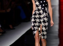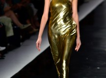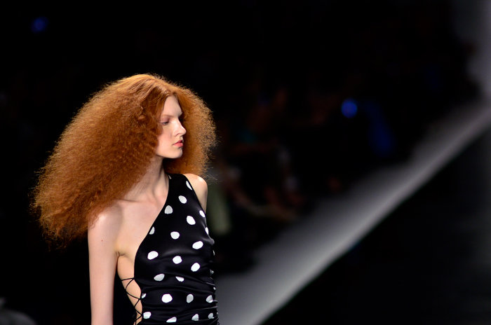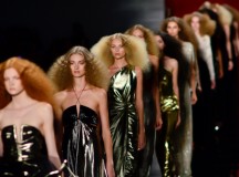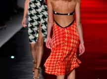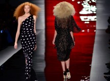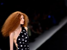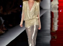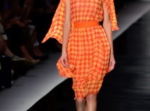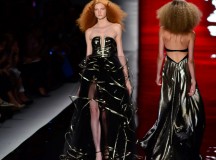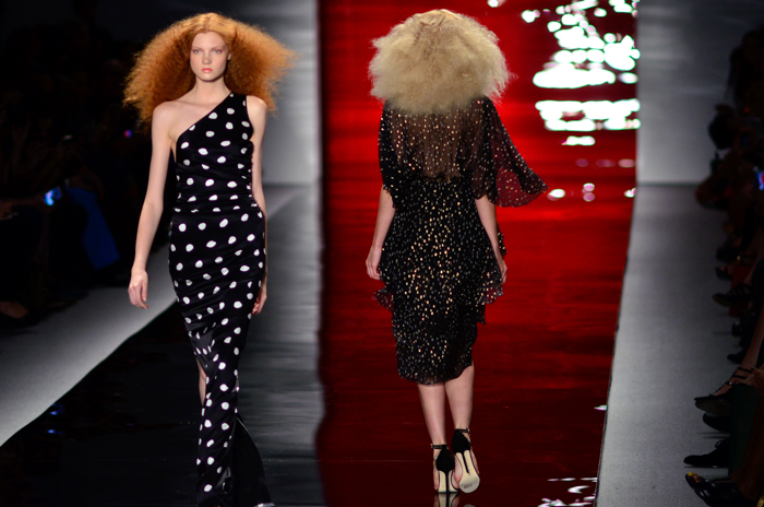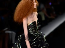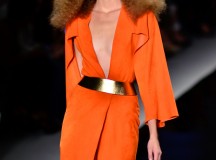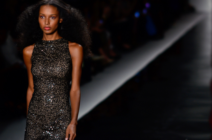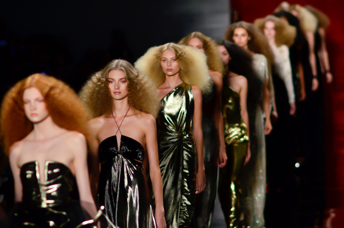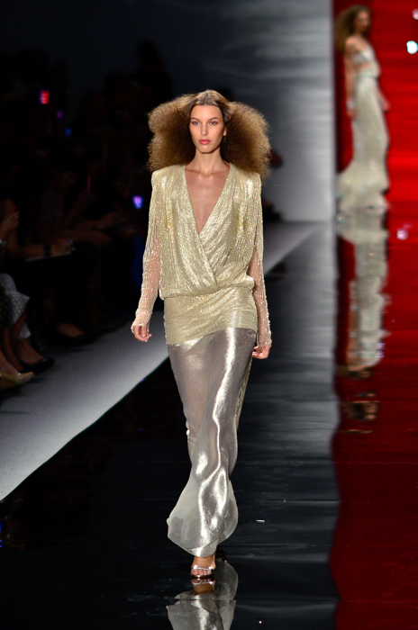 Reem Acra nous a présenté à New York une collection printemps été 2014 très disco, dominée par une coiffure et un make up volant la vedette aux vêtements. Des vêtements moulants, orangés ou scintillants de milles feux hommages aux reines de la nuit.