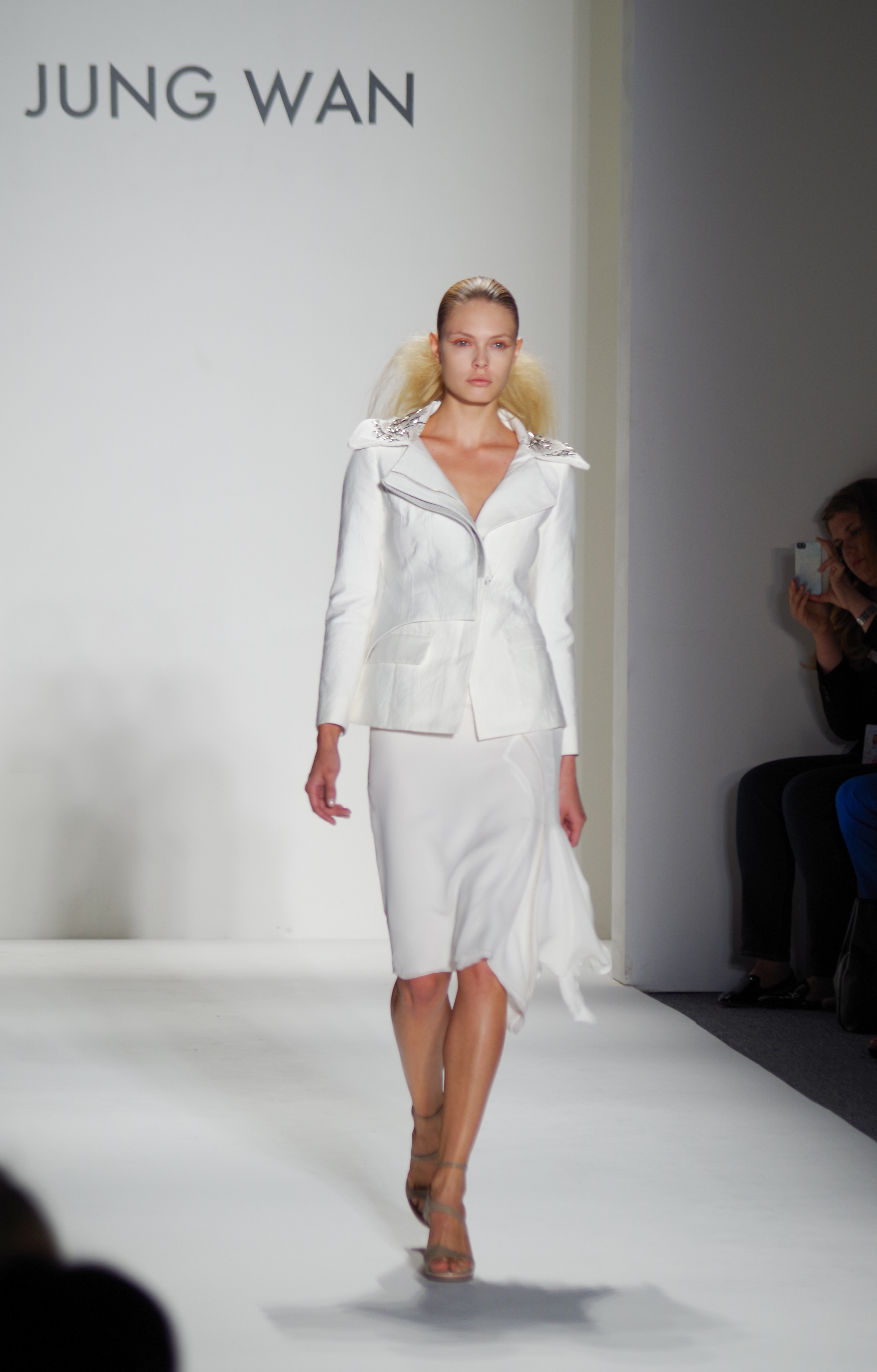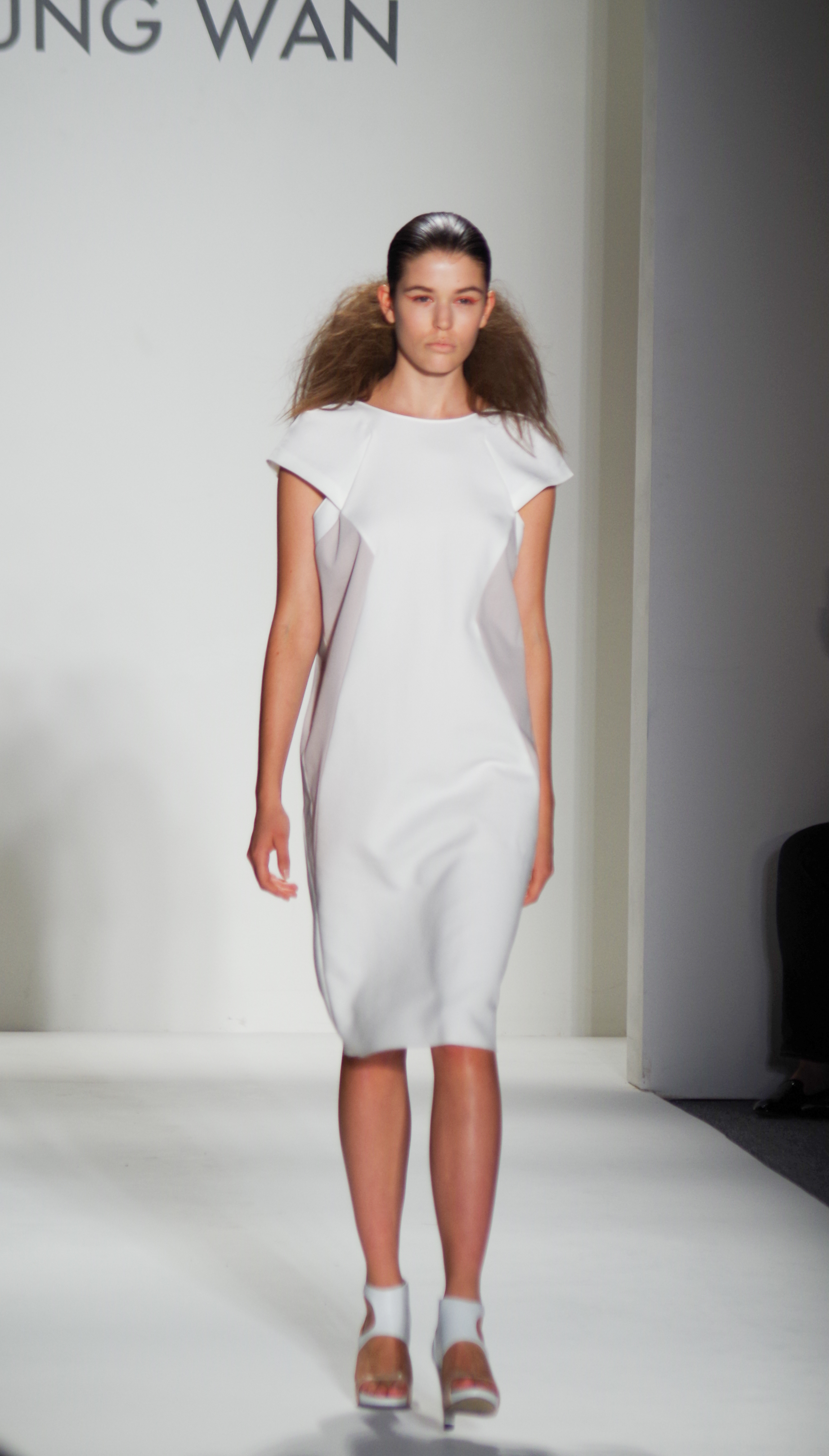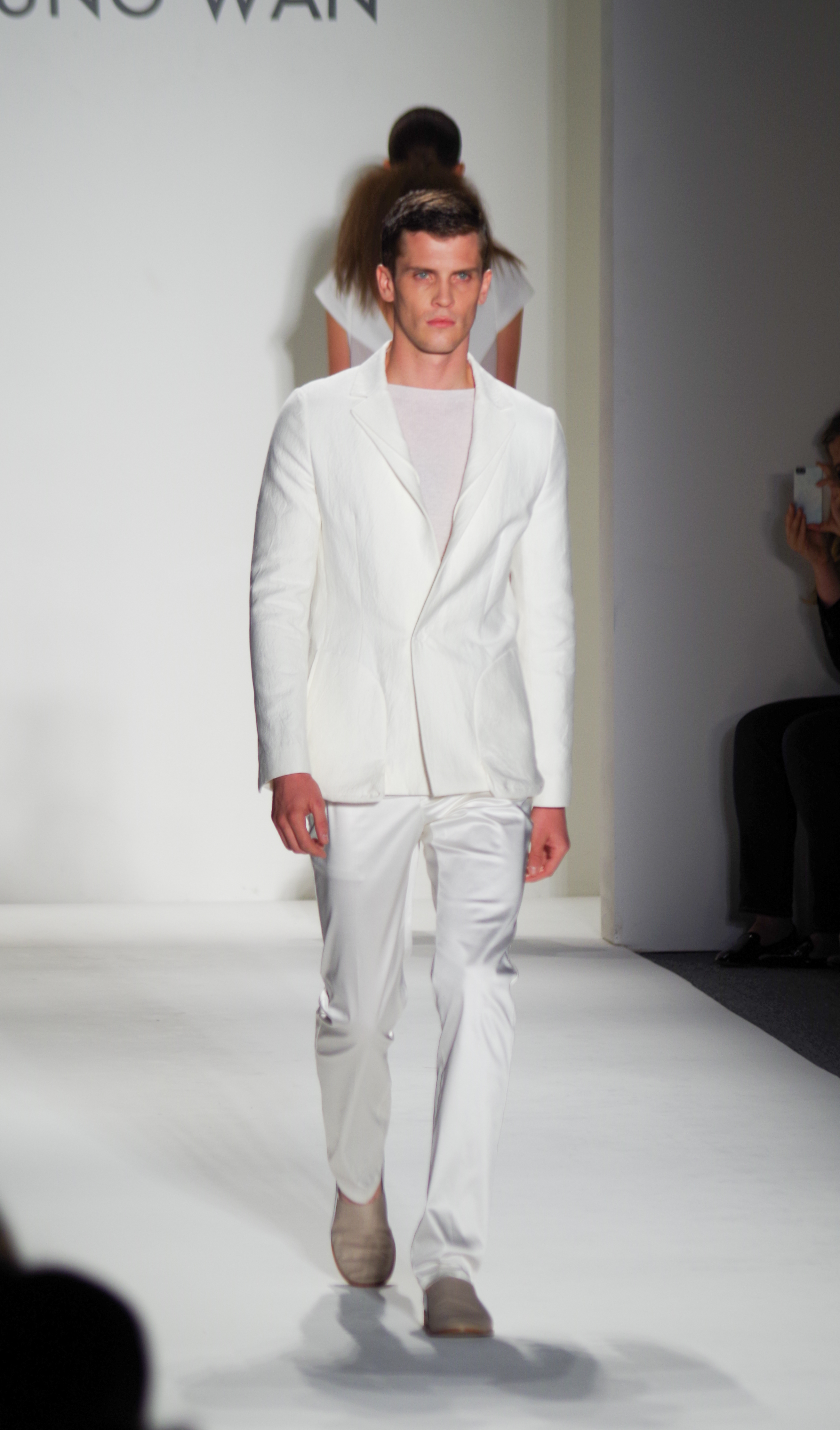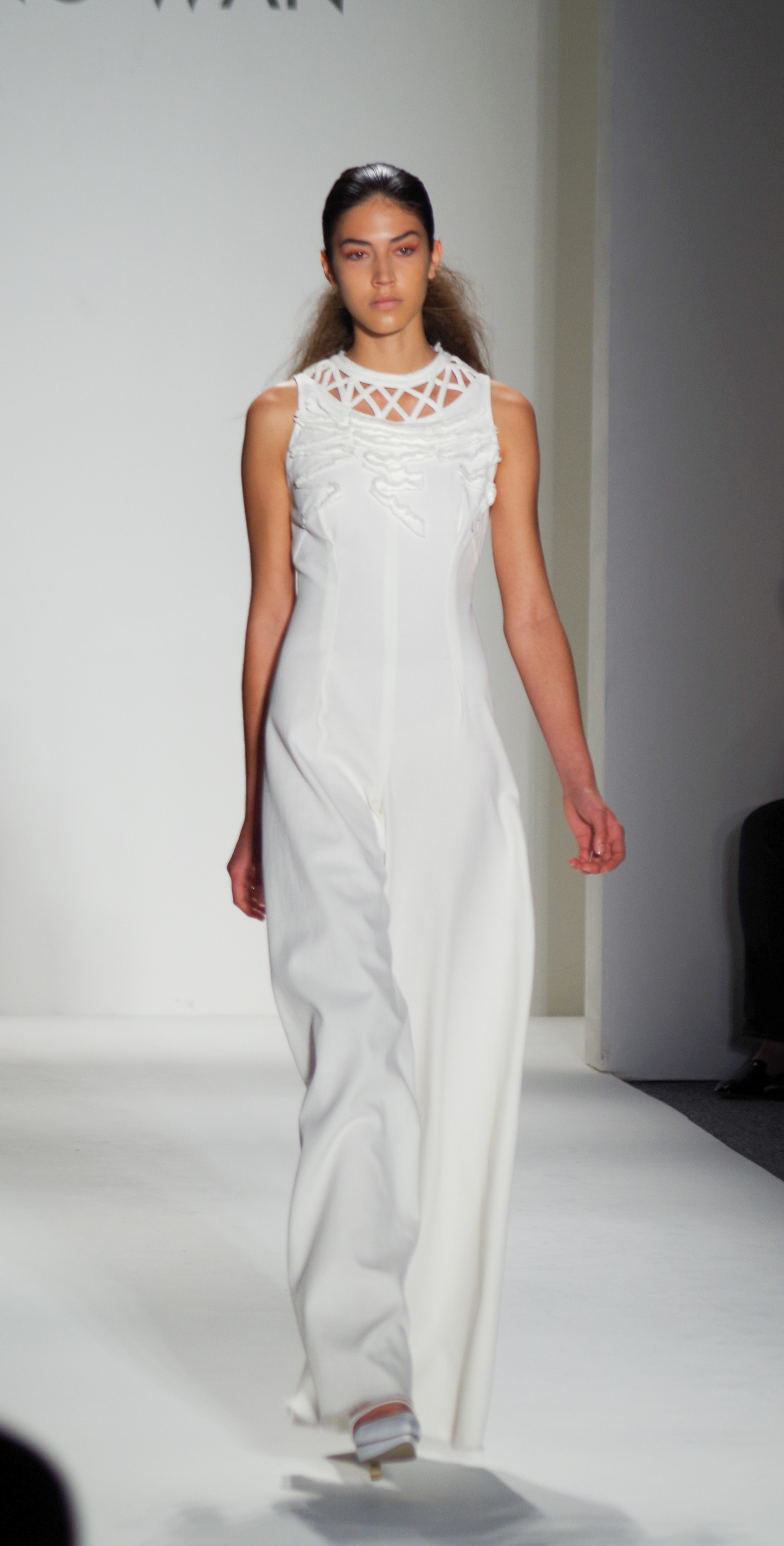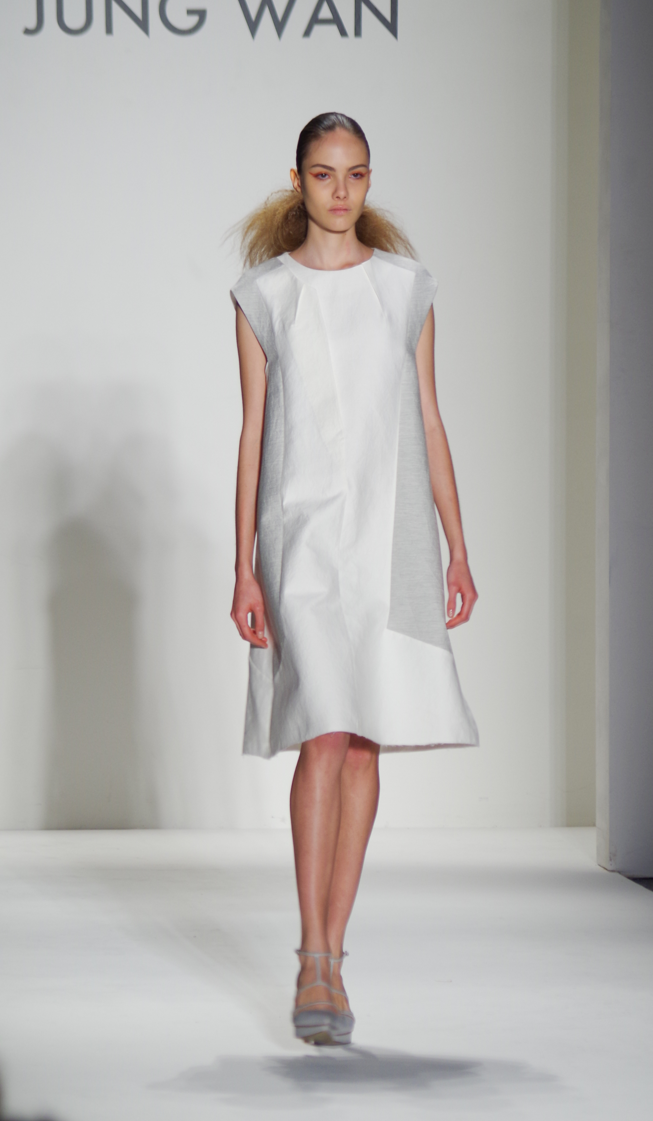 Son Jung Wan nous invite au voyage avec sa collection appelée Away hommage au Maroc. Il présente une collection où minimalisme et asymétrie sont les maîtres mots. Une collection pure tel le blanc omniprésent et les quelques teintes pastels viennent égailler, une pureté qui ne fait pas oublier la féminité et la sensualité.