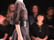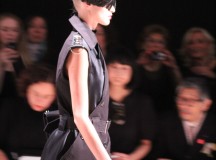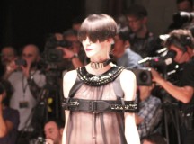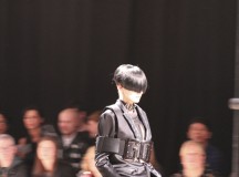 La femme, chez Undercover, revendique fièrement son côté « électron libre », avec des pièces asymétriques fortes en transparence et néoprène, mêlant deux des quatre éléments : l’Air et la Terre.