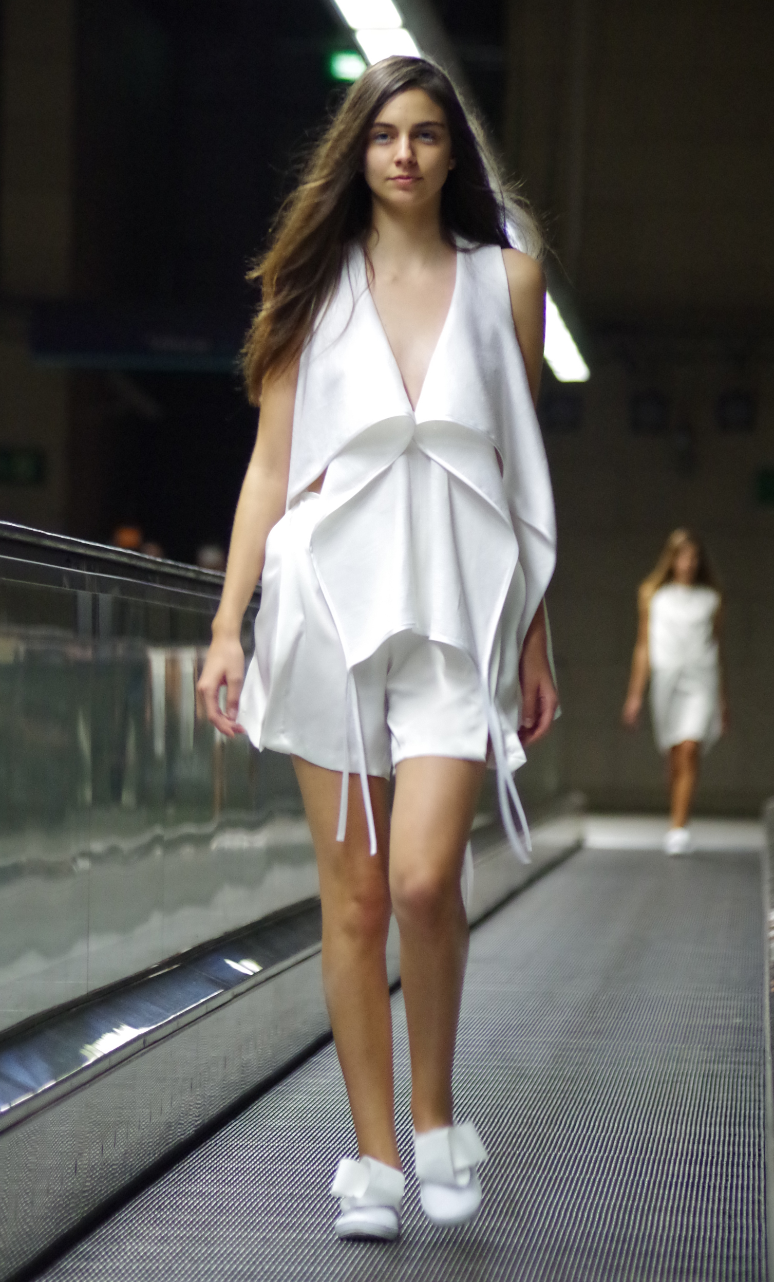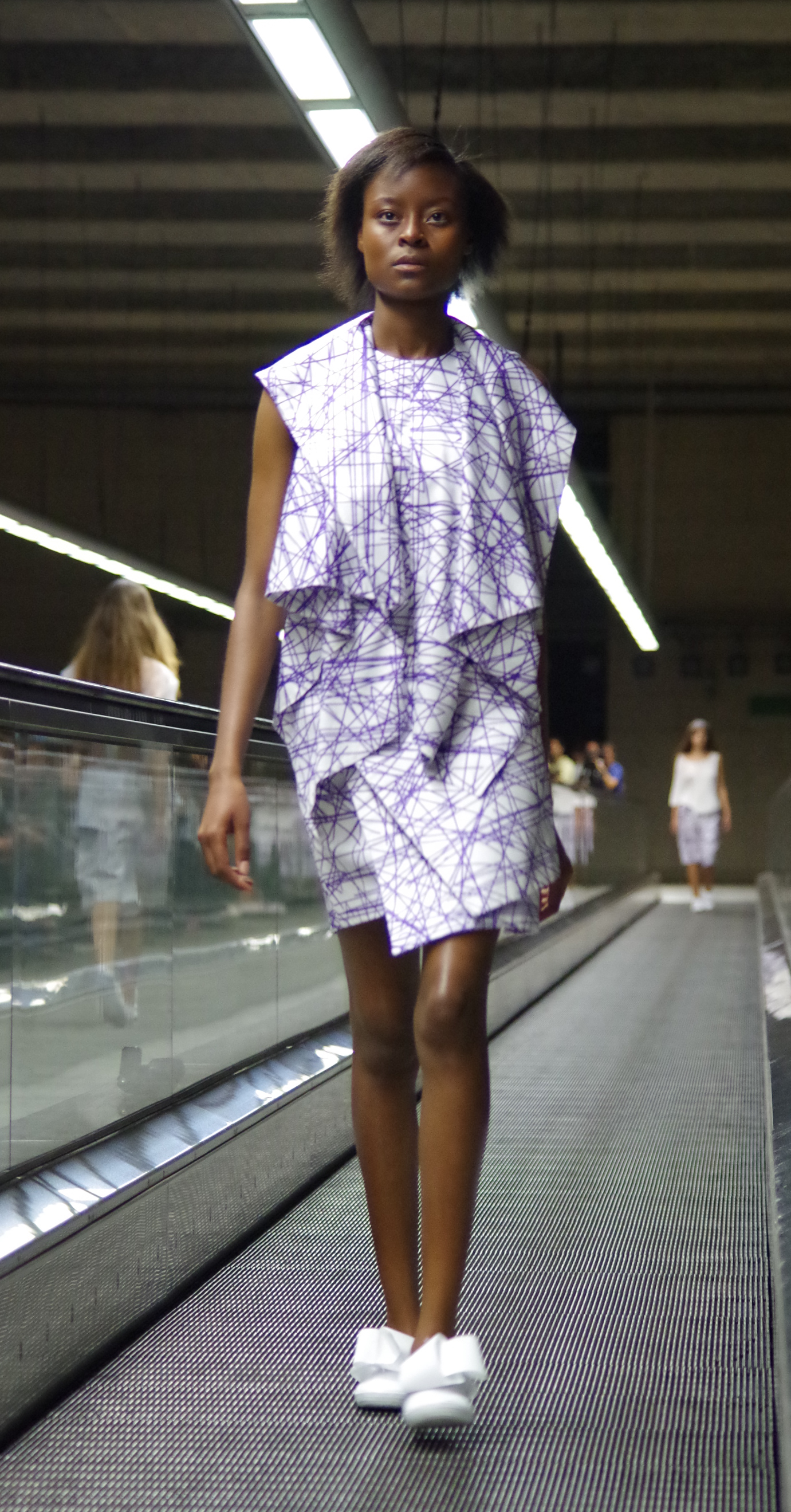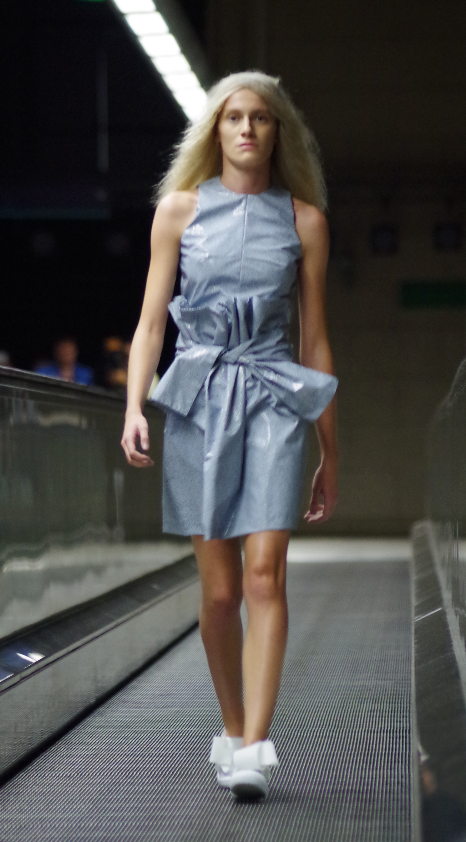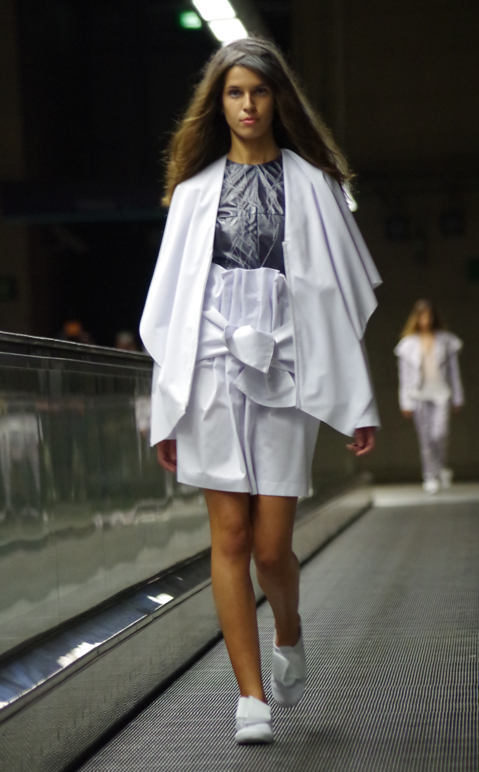 Andreia Lexim, jeune créatrice talentueuse présentait à Lisbonne sa collection Printemps Eté inspirée par les livres. Papier, livres, pliages, gribouillages sont à l’honneur. « turn the page » regroupe ainsi des pièces 3d en papier qui ont ensuite été transposé à des moules réels. On assiste alors à une confrontation entre matières rigdes et matières fluides.