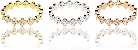 Par sa légèreté, sa transparence et son mystère, la dentelle a toujours été synonyme de féminité. Elle peut tout aussi bien révéler et provoquer en attirant l’attention sur des parties du corps qu’il convient habituellement de soustraire aux regards. IO&ES s’en inspire pour sa collection et l’utilise ici en ornement. Lucia Ariotti a imaginé des bagues toutes en finesses et légèretés, mélangeant le thème de son myosotis emblématique à l’imaginaire de la dentelle. Nous découvrons donc, telle une tiare de fleurs brodée d’or jaune, rose ou blanc et sertie de pétales de diamants, les bagues « Fleur la dentelle ». Des bagues fines, délicates et harmonieusement qui s’accordent, se superposent, s’empilent aux grès des envies.
