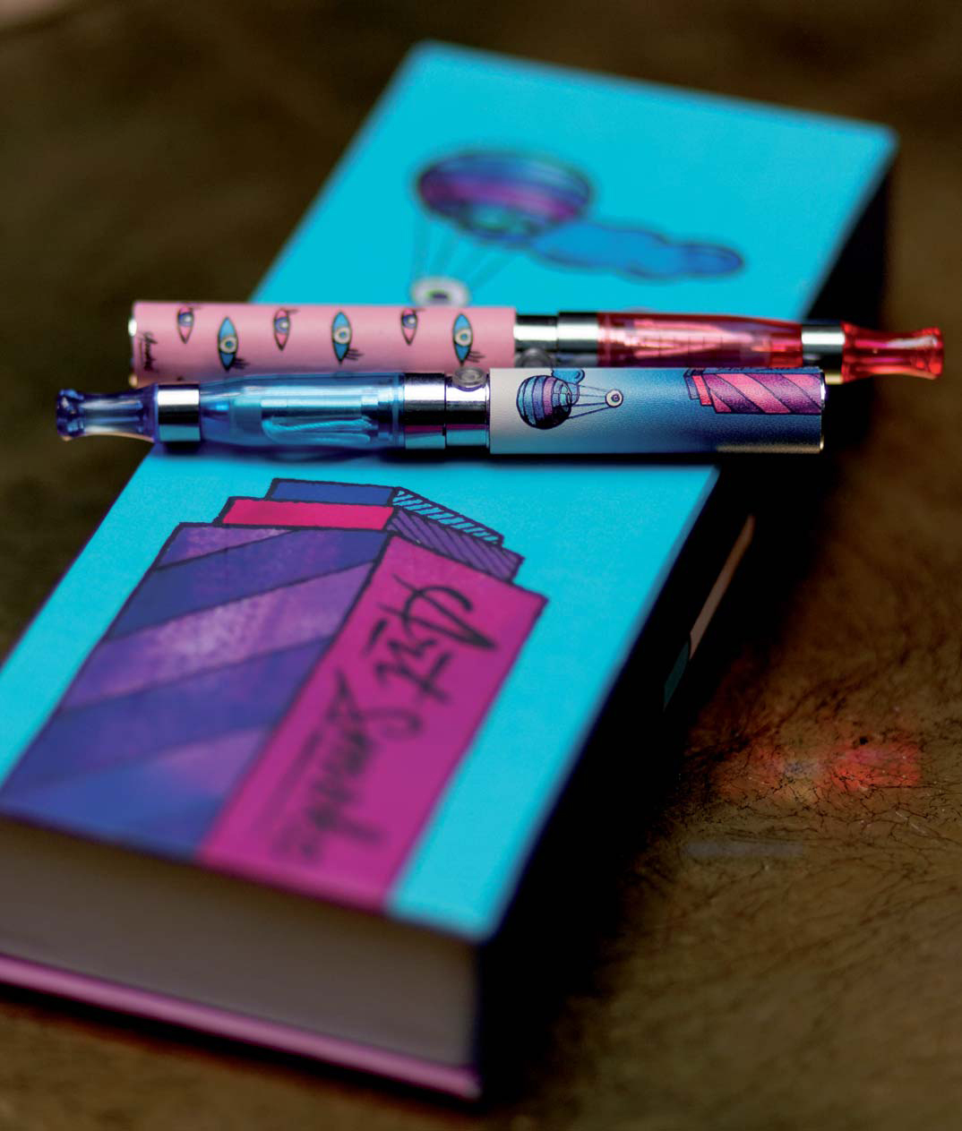 Pour ART SMOKE André a conçu un coffret collector laissant libre court à son imagination prolifique pour designer un packaging et un support pour la cigarette électronique dans un univers toujours coloré et surréaliste qui lui est cher. Un coffret qui comprend deux cigarettes électroniques, une en rose et une en bleu, accompagnées de leurs chargeurs USB et mural.