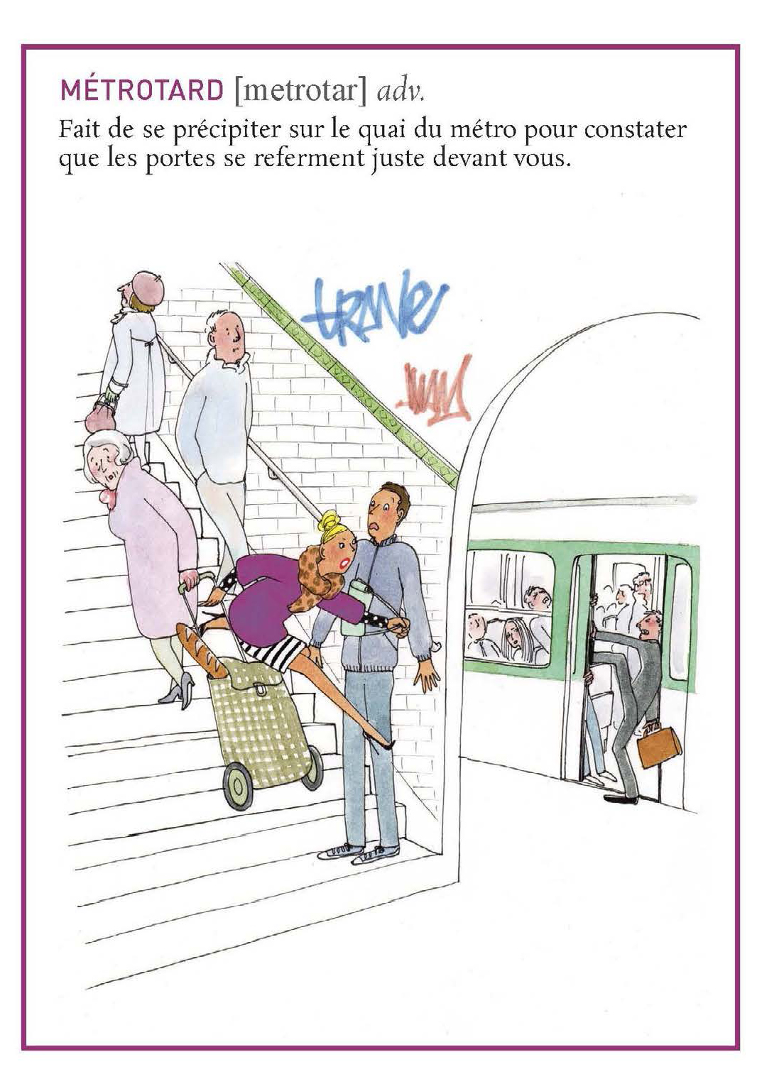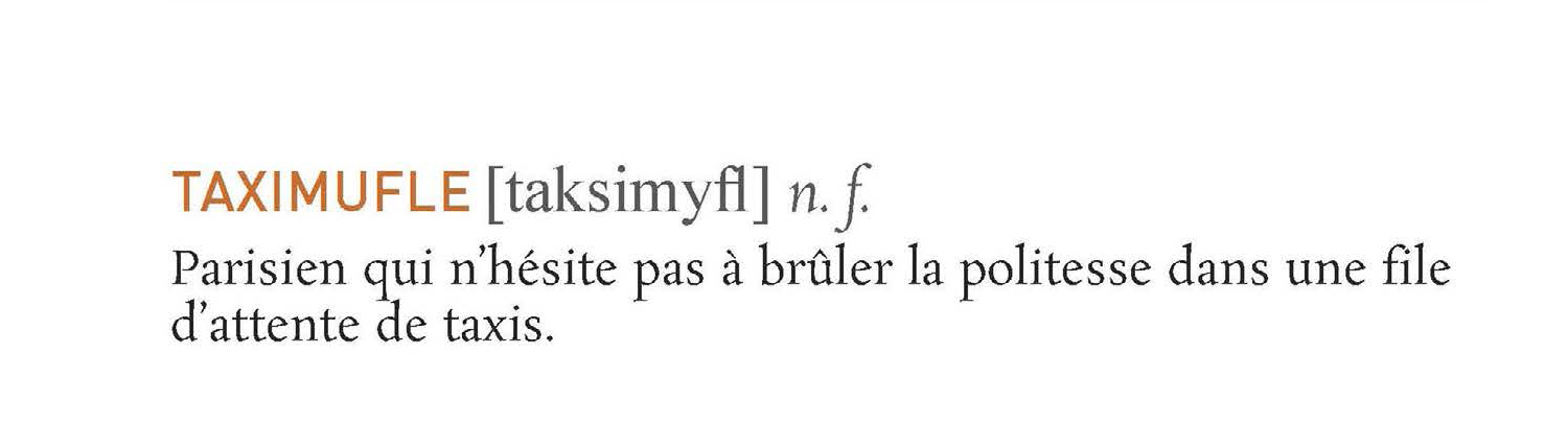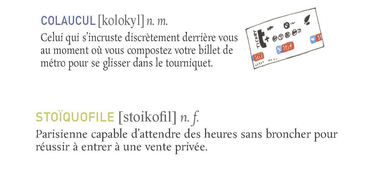 Jean-Loup Chiflet, spécialiste du genre et Amandine Péchiodat, la rédactrice en chef de mylittleparis.com ont imaginé quelques 200 mots à ajouter au vocabulaire parisien. Classées par ordre alphabétique comme dans un véritable dictionnaire, tous ces mots inventés illustrent parfaitement toutes les situations que peuvent rencontrer les parisiens. Les aventures du métro, du vélib, du bus, la mauvaise fois Made in Paris, les hipsters et autres fashionistas. Tous ces travers grossis et caricaturés des vrais parisiens, caractérisés par des mots et beaucoup d’humour. Les dessins qui accompagnent ces définitions sont signées par Kanako Kuno qui a l’habitude de collaborer pour My Little Paris.