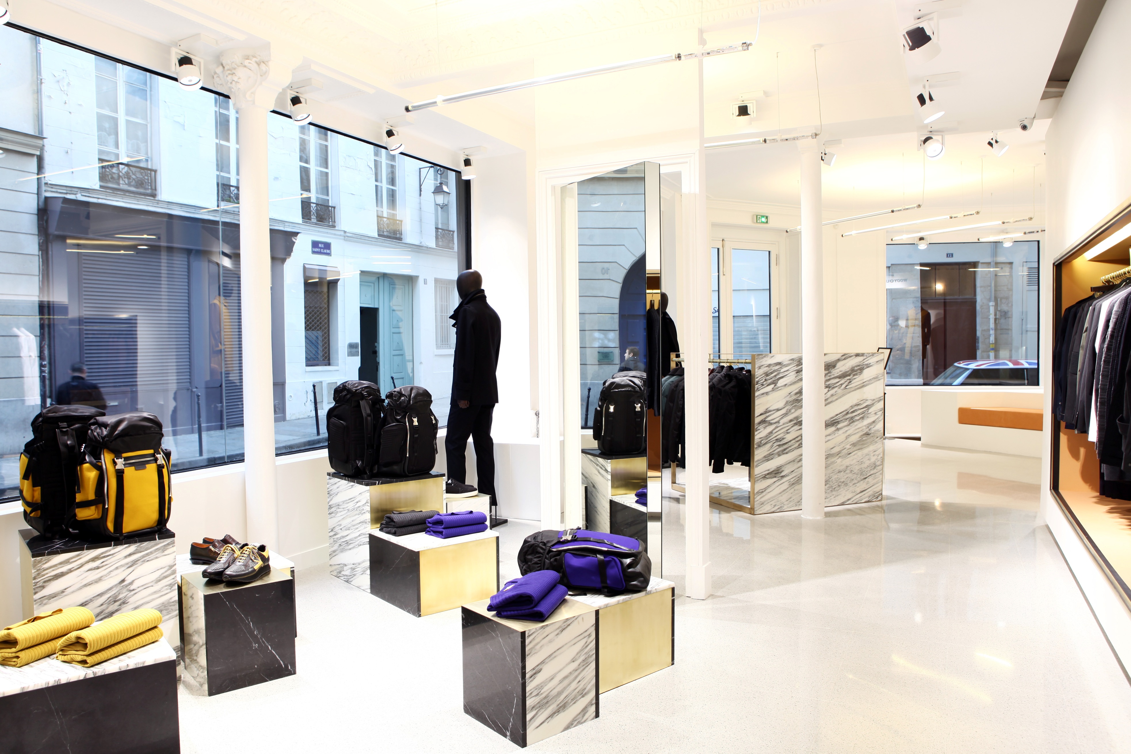 WOOYOUNGMI a ouvert sa première boutique flagship à Paris au coeur du “Haut Marais”. La boutique occupe un espace de 175 mètre carre au 5 rue Saint Claude, 3eme arrondissement, à cote de la vie trépidante du boulevard Beaumarchais. Le quartier est un endroit de choix autant pour faire du shopping que pour sortir avec son mélange étonnant de boutiques de luxe au sein de ses anciennes rues. La boutique présente un choix de prêt-à-porter, costumes, sacs, chaussures et accessoires. Un travail de collaboration avec une équipe d’architectes local a permis de refléter le concept de design intérieur cher à la marque, la gallérie d’art, tout en l’adaptant à son environnement parisien. Le concept joue en effet avec les codes habituellement utilisés dans une gallérie: cadres, vitrines et ameublements de marbre s’allient pour offrir au client une expérience calme et harmonieuse dans laquelle découvrir la collection.