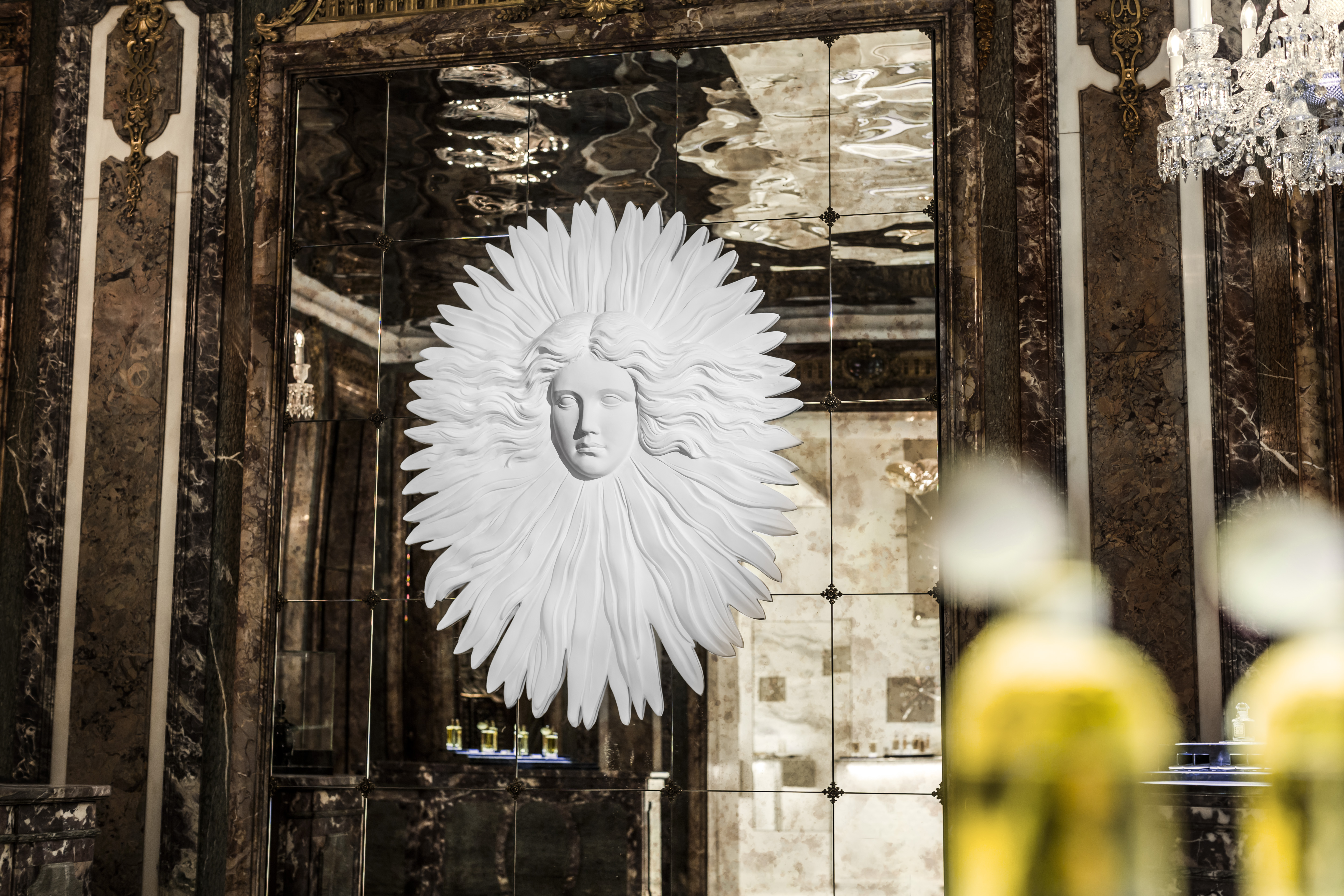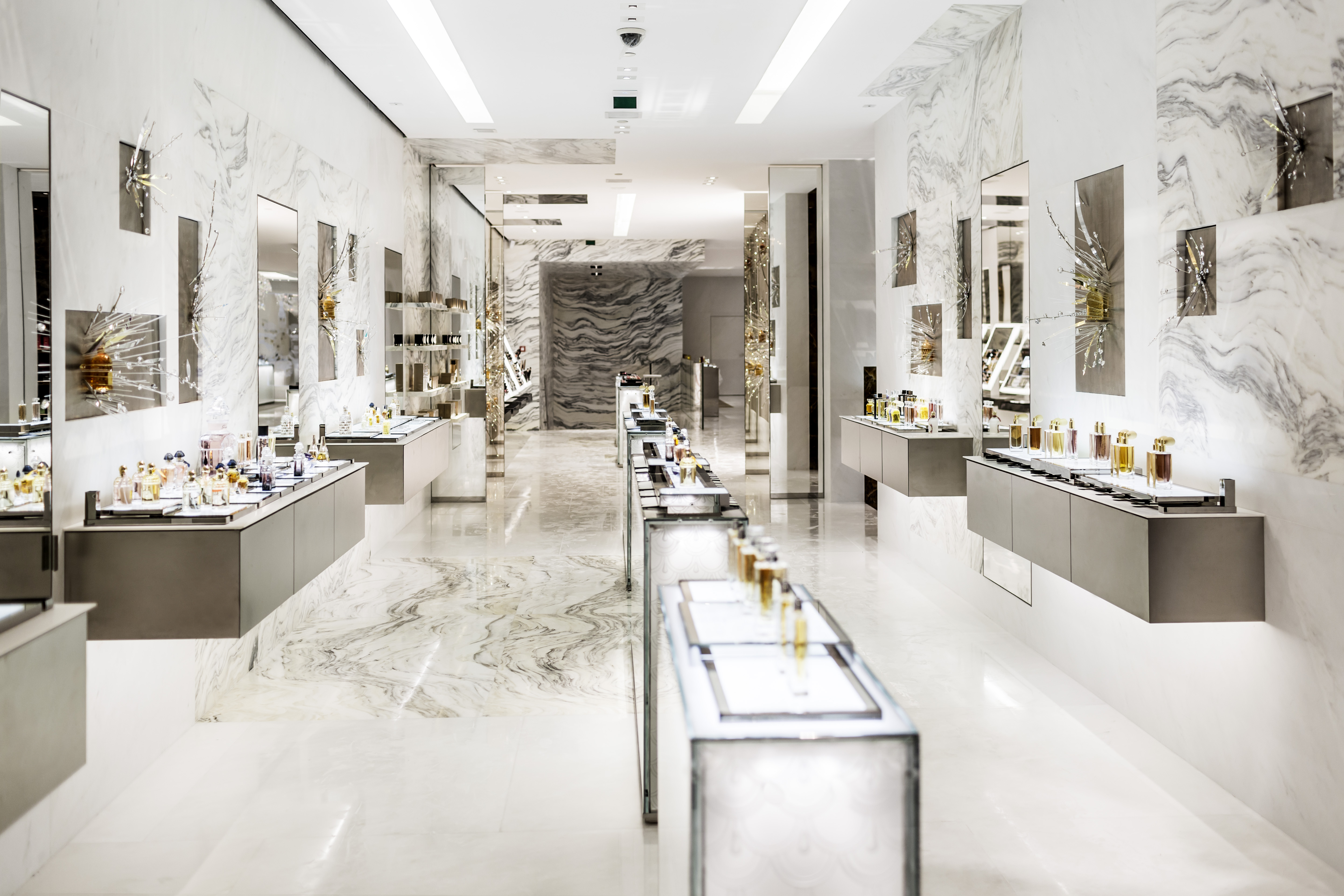 Dans une large entrée en marbre blanc, donnant sur les Champs Elysées, un puits de lumière de sept mètres de haut a été conçu pour servir d’écrin à l’installation composée d’abeilles dorées conçues par l’artiste Gérard Cholot, le Vol des Abeilles. Les visiteurs sont ainsi accueillis dans cet espace inédit par le symbole de Guerlain, cette abeille qui fait partie de l’histoire de la Maison depuis 1853.