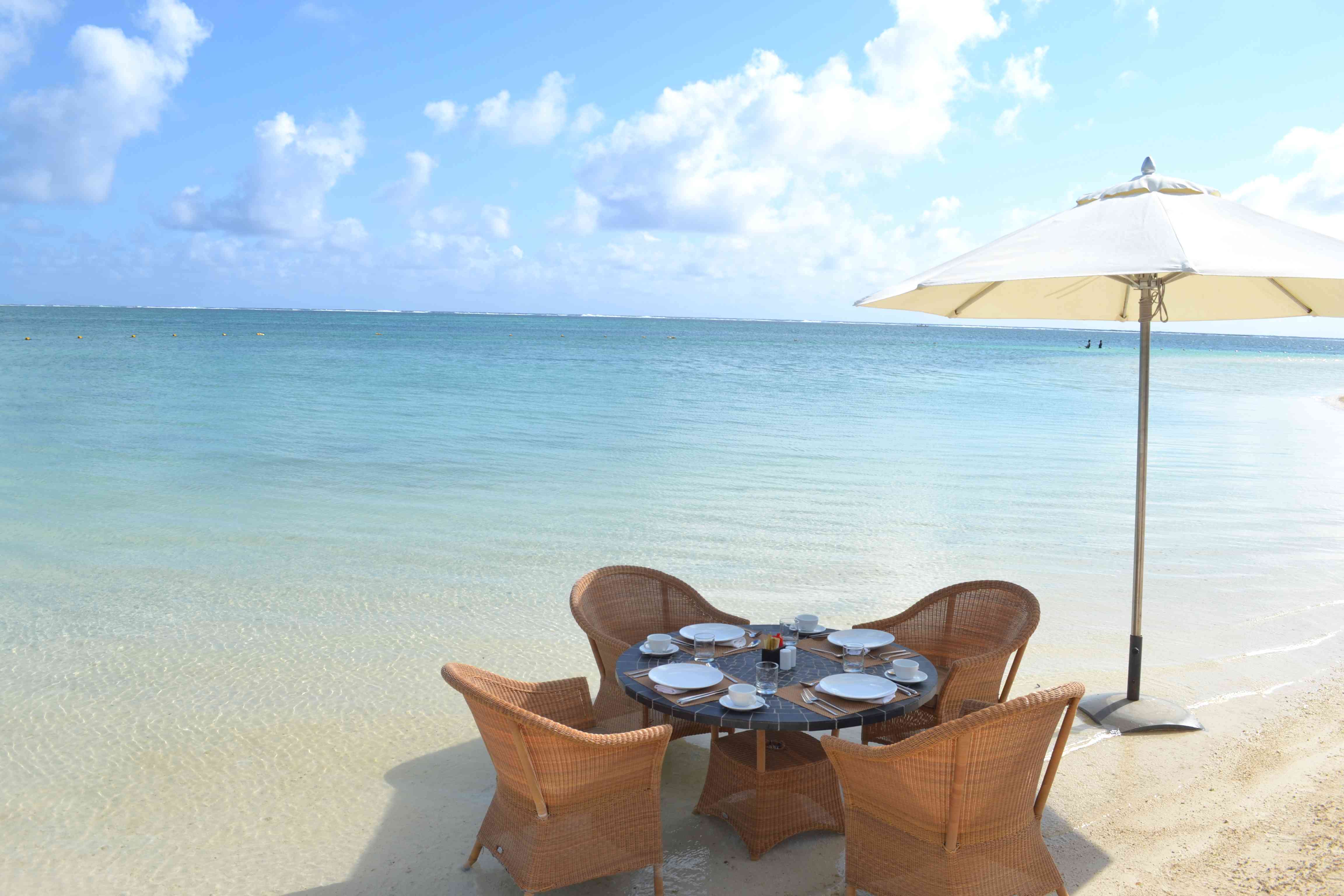 À notre arrivée, les employés vêtus de blanc des pieds à la tête viennent nous accueillir. Larges sourires et bonne humeur. La qualité du service mauricien n’est pas une légende. On découvre ensuite notre chambre. Elle est très moderne, confortable et mesure 60m2 comme la plupart des 174 autres suites de l’hôtel. Elle située dans un petit bâtiment de 2 étages avec une belle vue sur des jardins luxuriants et la plage.