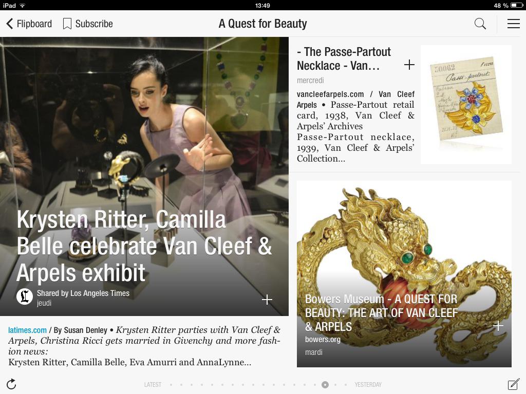A Quest for Beauty est, en France, le premier magazine de marque réalisé sur l’application Flipboard. A la manière de la visite digitale de ses ateliers, Van Cleef & Arpels confirme, avec ce nouveau dispositif, son envie d’ouvrir en grand les portes de son univers et de ses collections pour que les internautes s’approprient et s’échangent l’ensemble de ses contenus.