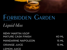 Nous reprenons notre périple pour le Bam Bou’s Red Bar, caché à la manière d’un speakers au troisième étage d’une maison londonienne bien ancienne transformée en temple des plaisirs culinaires asiatiques, ce bar est l’antre de Ladislaw Pillar qui nous propose un cocktail au titre onirique : Forbidden Garden. Composé de Remy Martin VSOP Mature Cask finish avec de la liqueur de mandarine Naopleon, du jus de citron, de bitters de sucre et de feuilles de basilic. Sublime !
