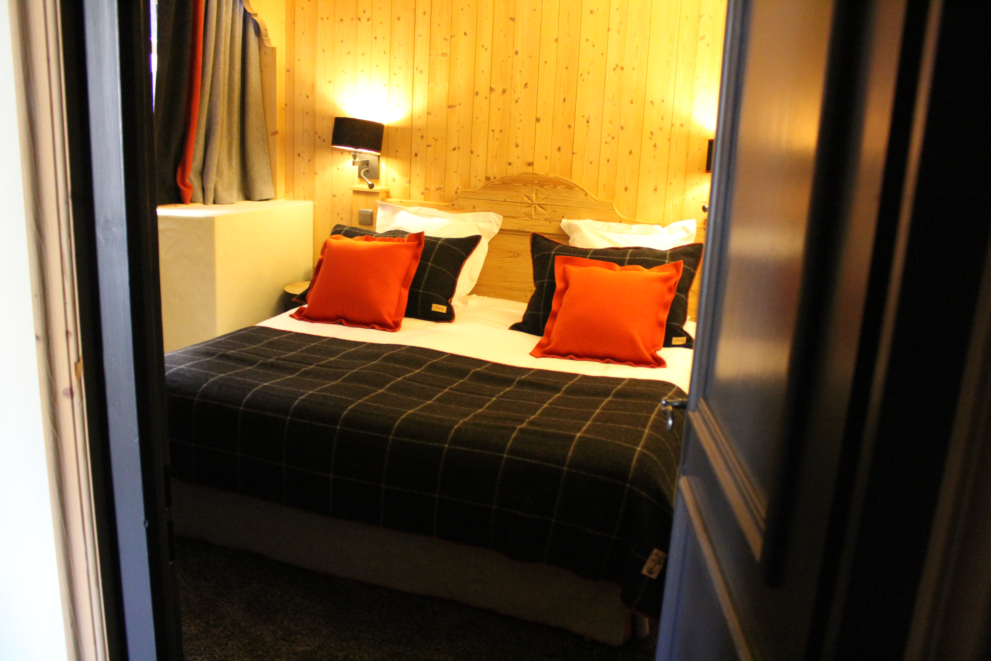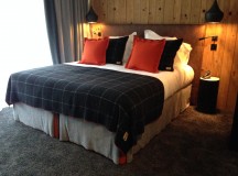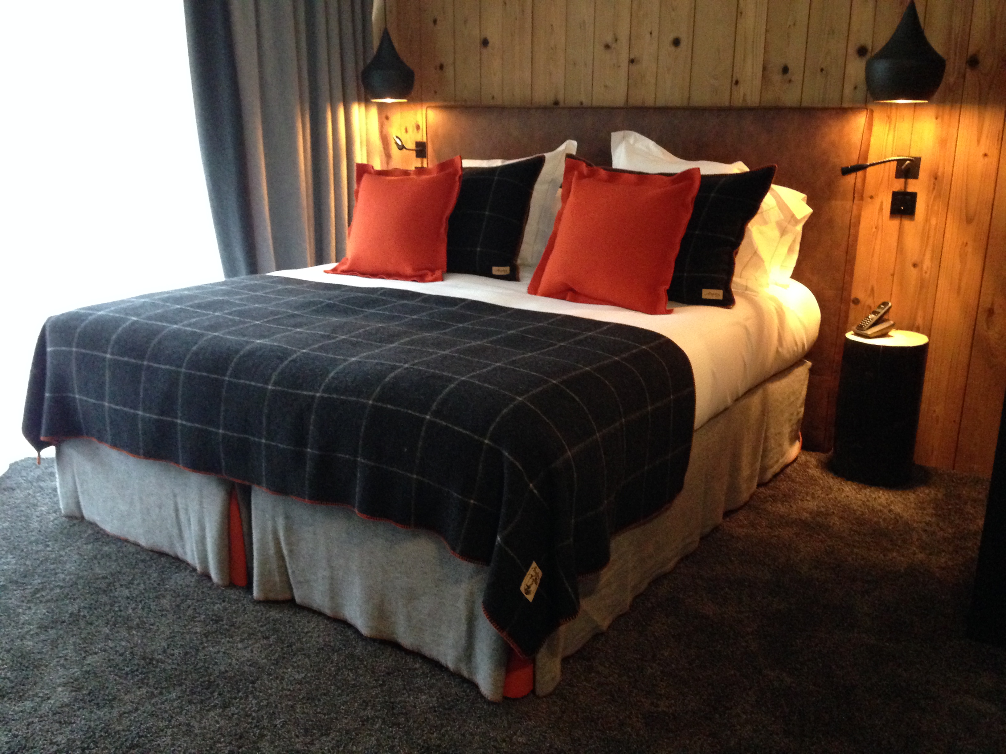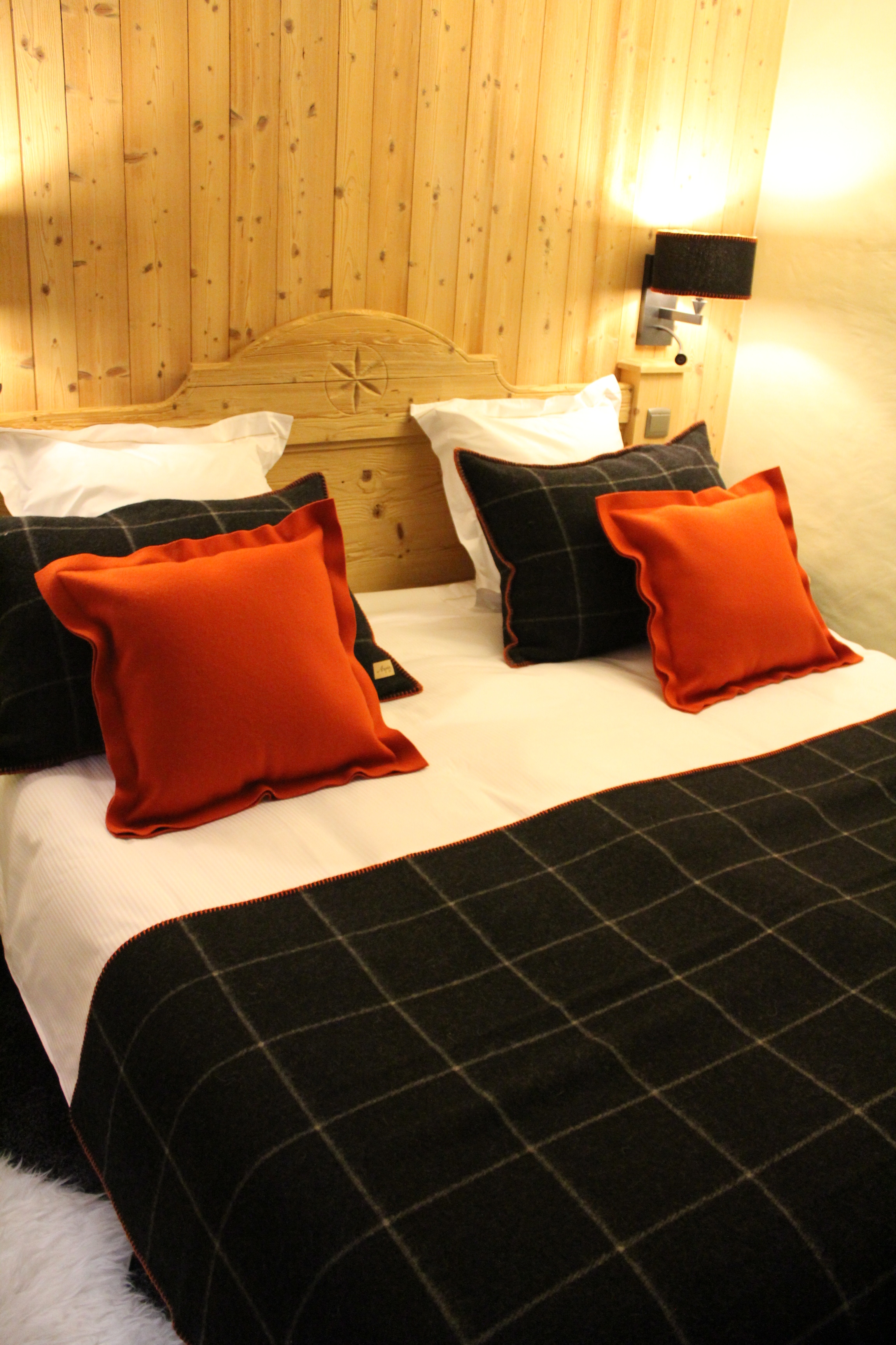 Pour le M de Megève, la Filature Arpin a imaginé un tissu original et exclusif qui reprend son fameux « surjet point échelle » et se décline pour les rideaux, les plaids et les coussins de l’hôtel avec toujours le même code couleur : potiron, anthracite et cendre, des chambres aux espaces de réception et de restauration.
