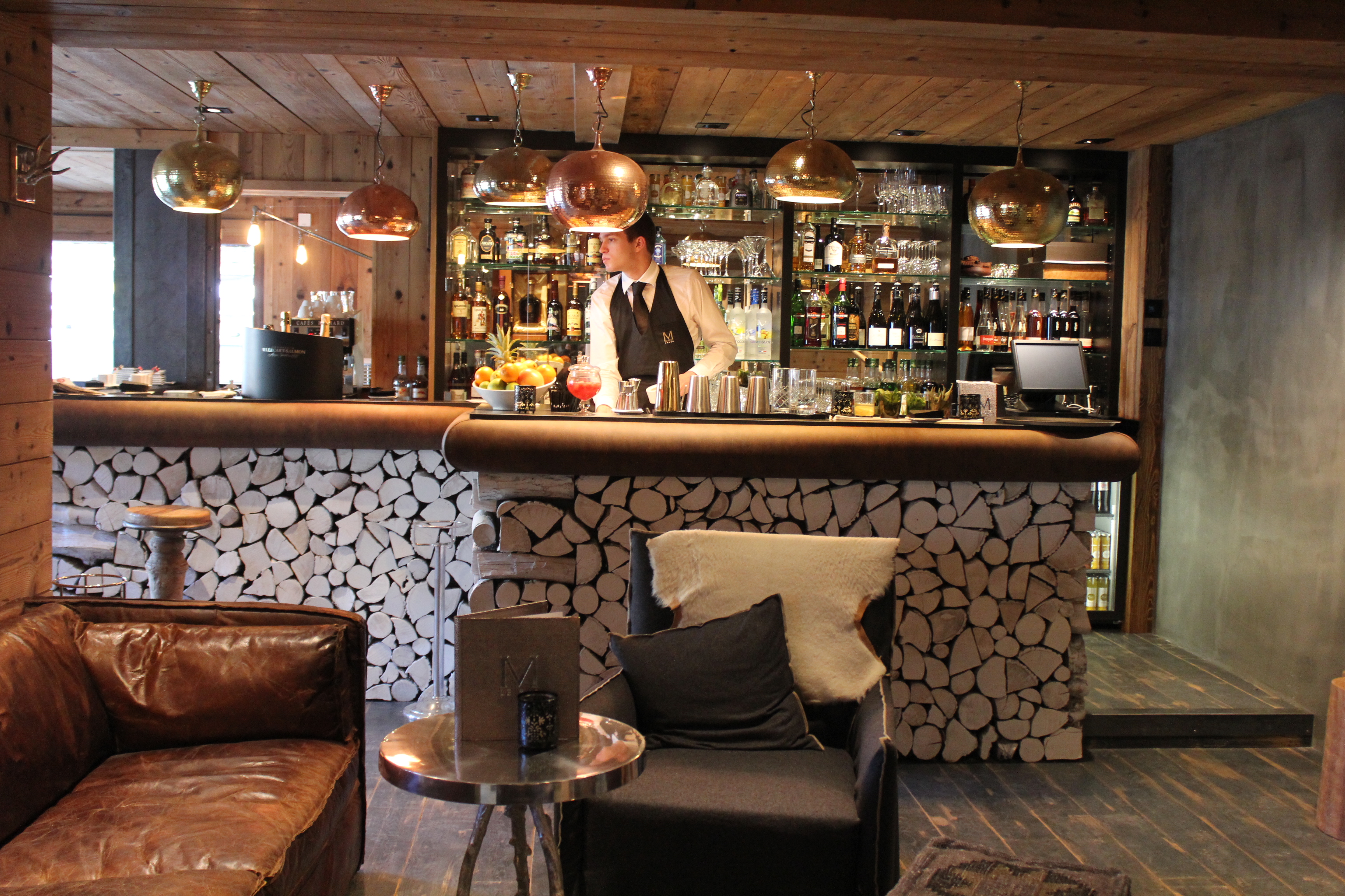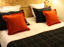 La Filature a tissé sur ses métiers Jacquard, classés au patrimoine national, le fameux tissu des Alpes, tissu original 100% en laine d’alpage locale utilisé traditionnellement pour les couvertures des refuges et décliné ici pour les rideaux. Presque bicentenaire, la Filature Arpin, implantée en Savoie depuis sa création, fabrique des draps de laine (tissus) connus dans le monde entier. Elle est l’héritière d’un savoir faire unique qui s’est transmis de génération en génération. Les coussins sont fabriqués en tissu Mûletier, utilisé autrefois pour les couvertures des bâts. La Maison Arpin a aussi imaginé et confectionné les uniformes du personnel de l’hôtel, afin de rester dans l’identité du M et dans le même esprit de qualité : des grands manteaux, des vestes trois-quarts, des gilets en laine, couleur taupe pour les femmes et anthracite pour les hommes.