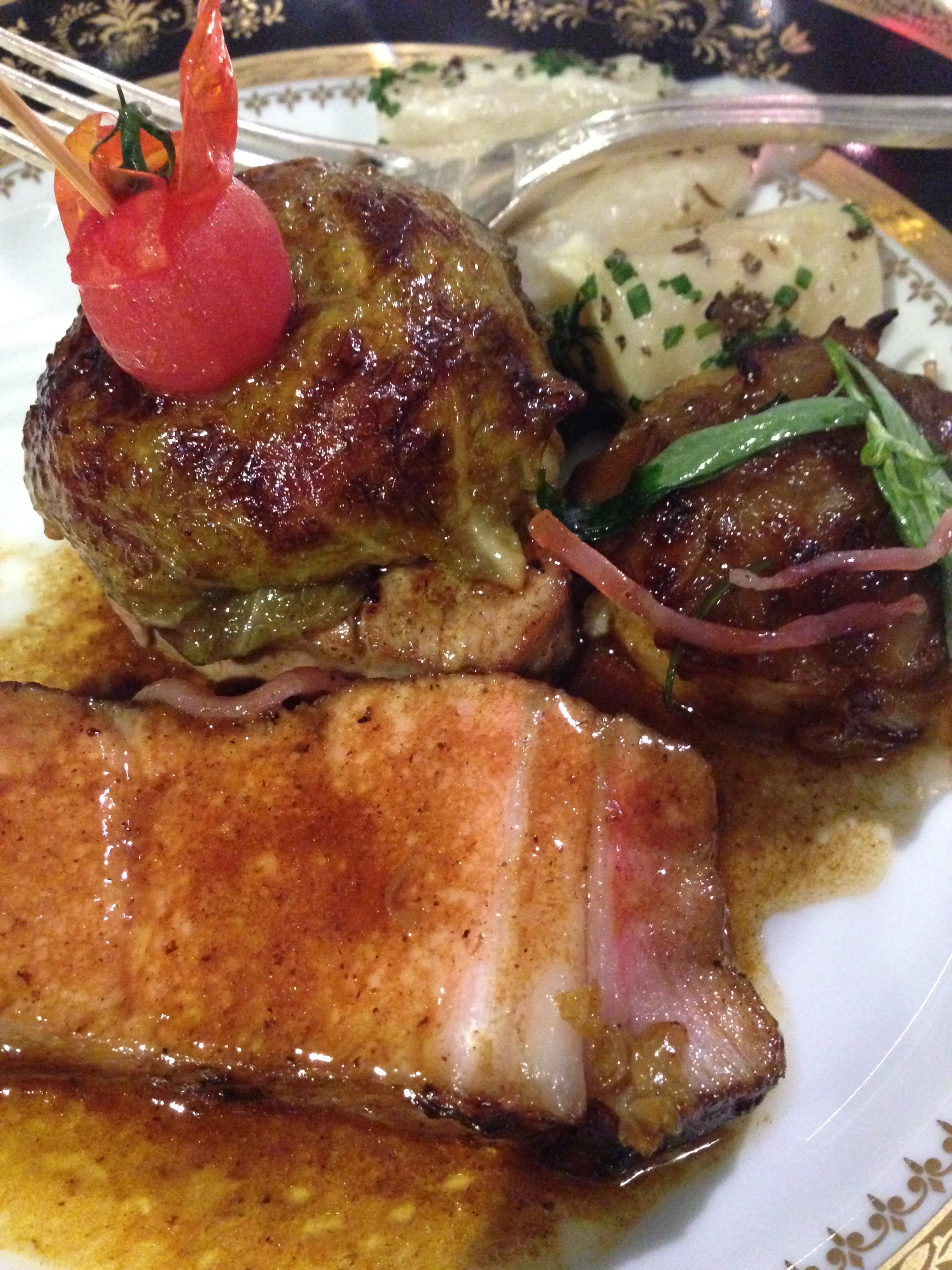 Les plats phares : pigeon à la rôtissoire, royale de petits pois à la française, salade à la truffe, ananas rôti accompagné d’un bostock… salle à manger du M ouverte le soir. Belle carte des vins.