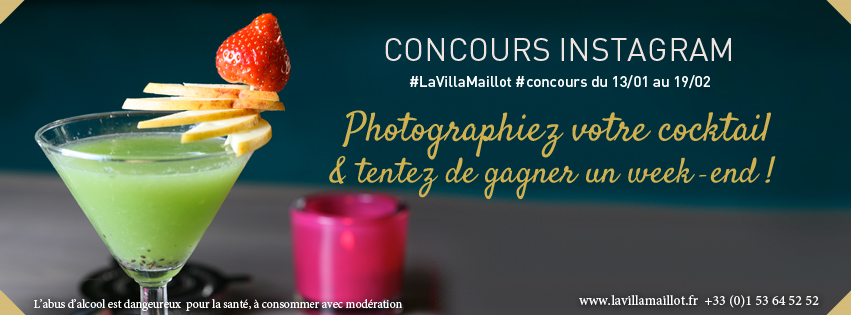 Ce concours prendra fin le 19 février 2014 à minuit. Chaque semaine, un jury sélectionne ses 2 propositions préférées. Les auteurs des cocktails gagneront 2 lots : un shaker à cocktail et une nuitée pour deux personnes à la Villa Maillot d’une valeur de 360 euros. Une nuitée supplémentaire sera offerte à la meilleure des deux propositions.