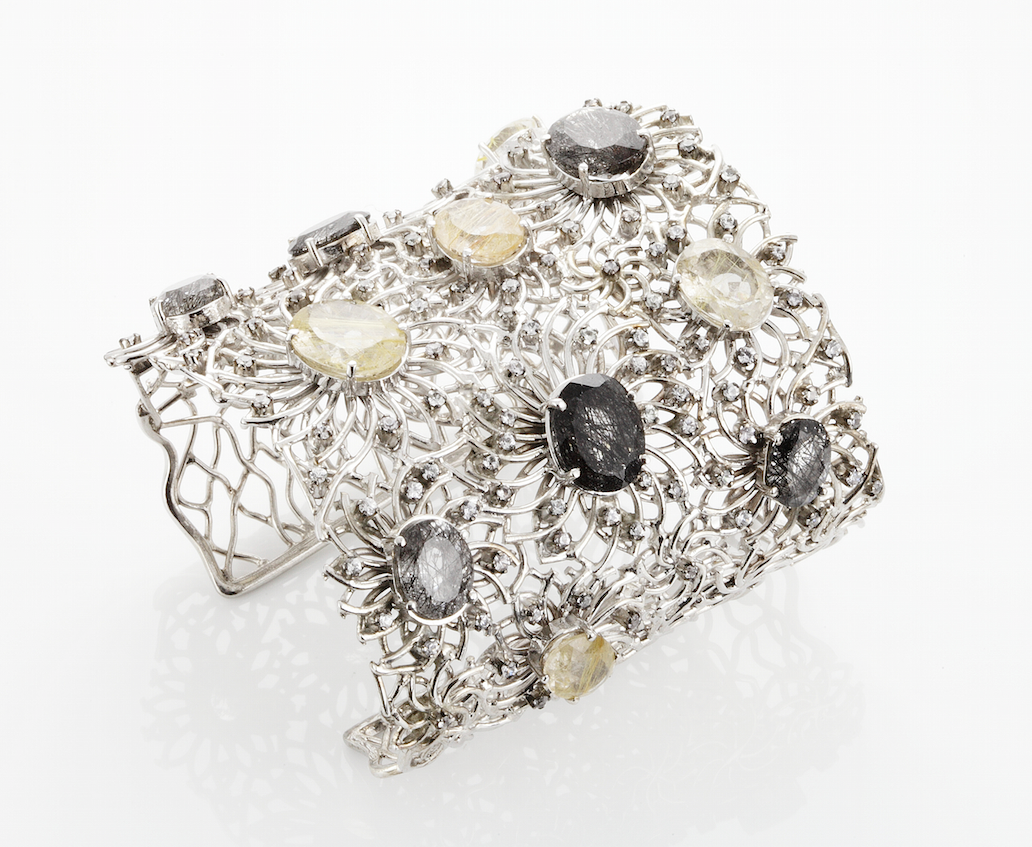 Aster, en saphirs blancs et rutiles montés sur une structure plaquée en rhodium