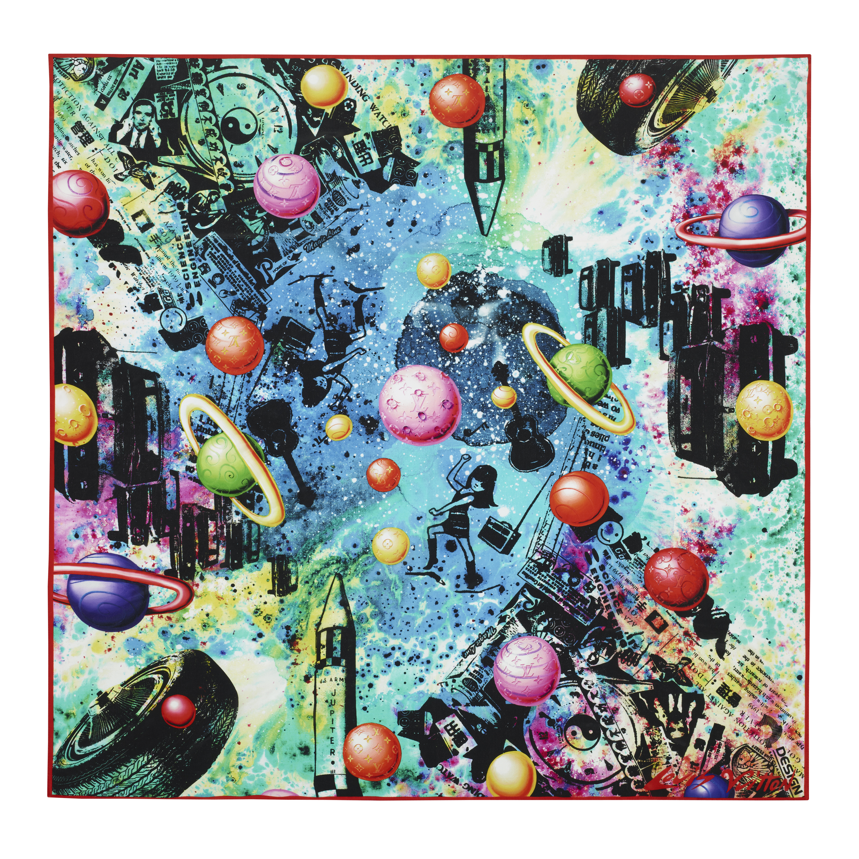 Un deuxième artiste revisite le carré de soie géant Louis Vuitton, il s’agit du californien Kenny Scharf. Ce peintre et sculpteur, recouvre le foulard d’un collage coloré. Ce collage mêle des motifs astronomiques et des symboles de la culture pop. Le tout sur un fond psychédélique flou. Depuis plus de 30 ans, l’artiste possède une approche originale de l’art. Son but : dépasser les frontières élitistes des beaux-arts pour renouer avec la culture populaire.