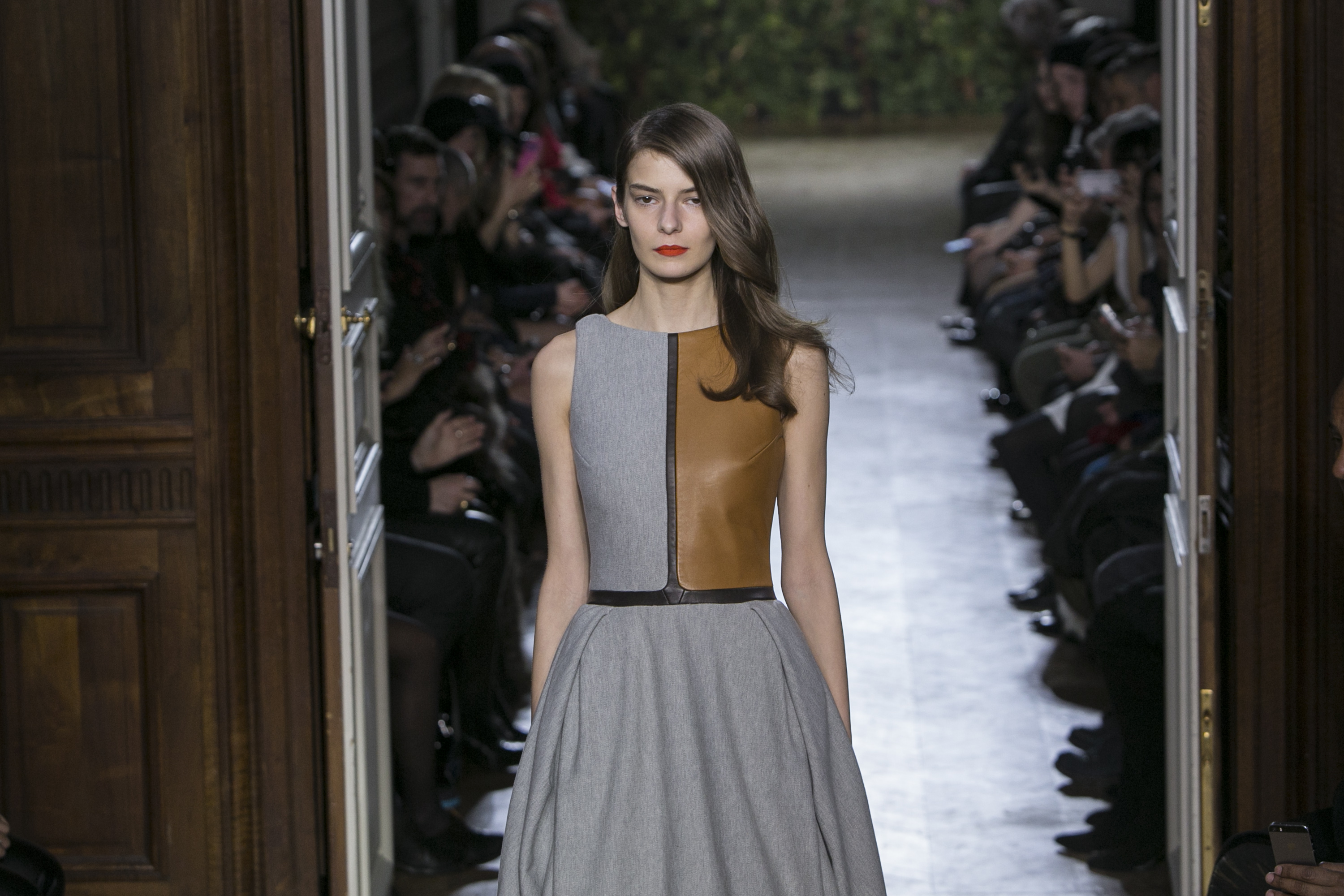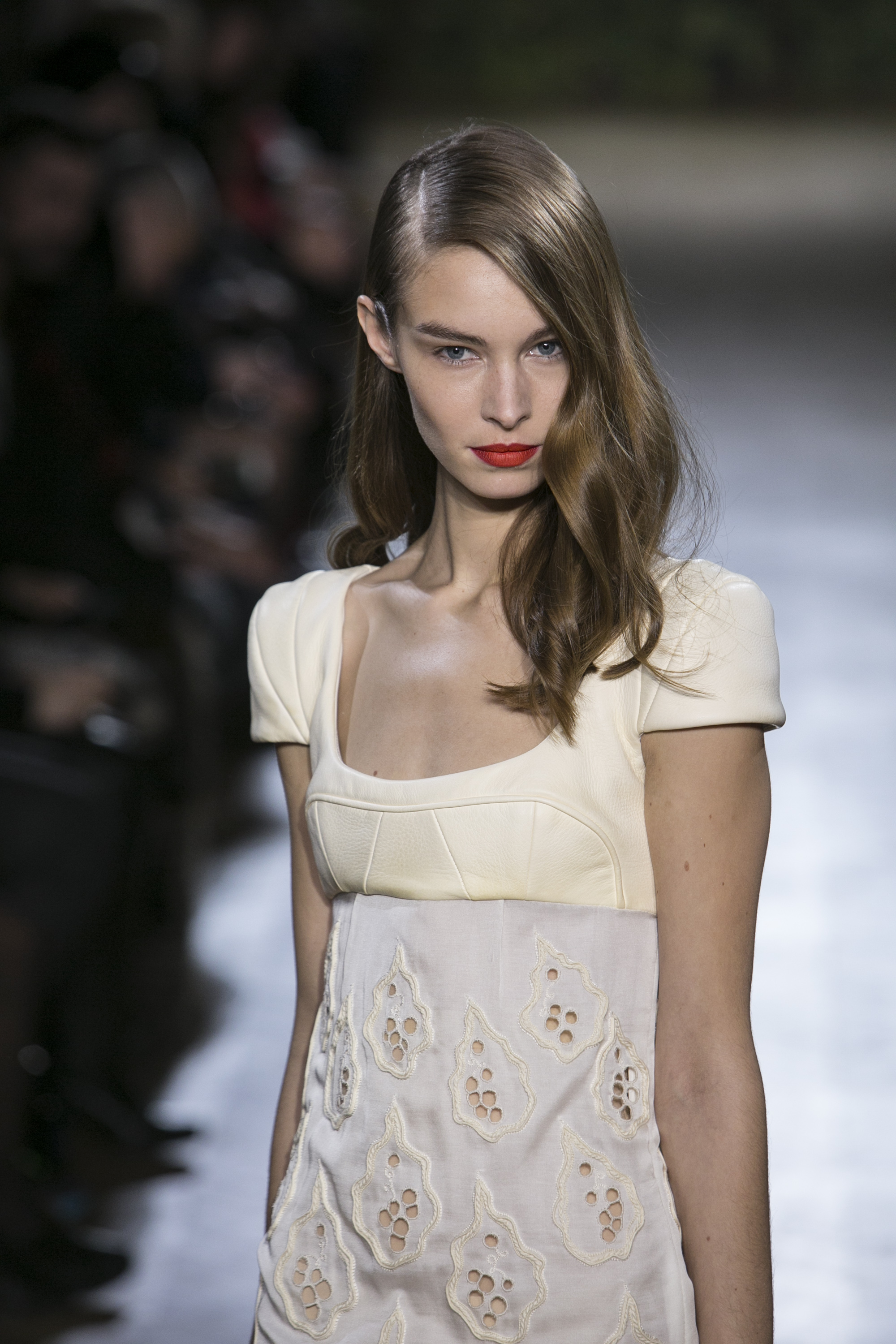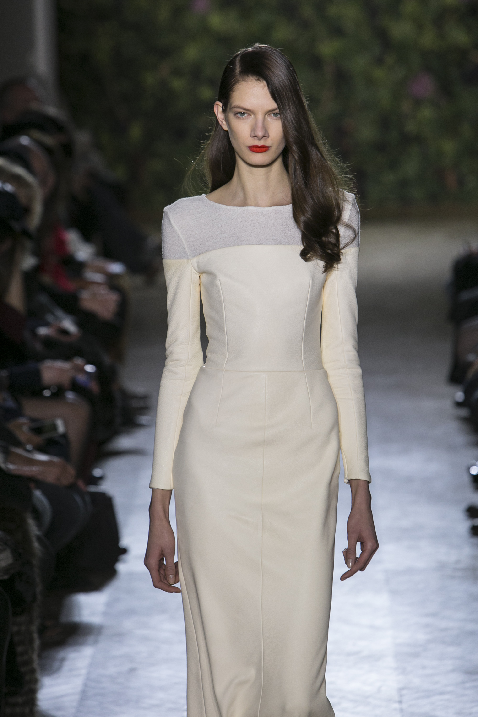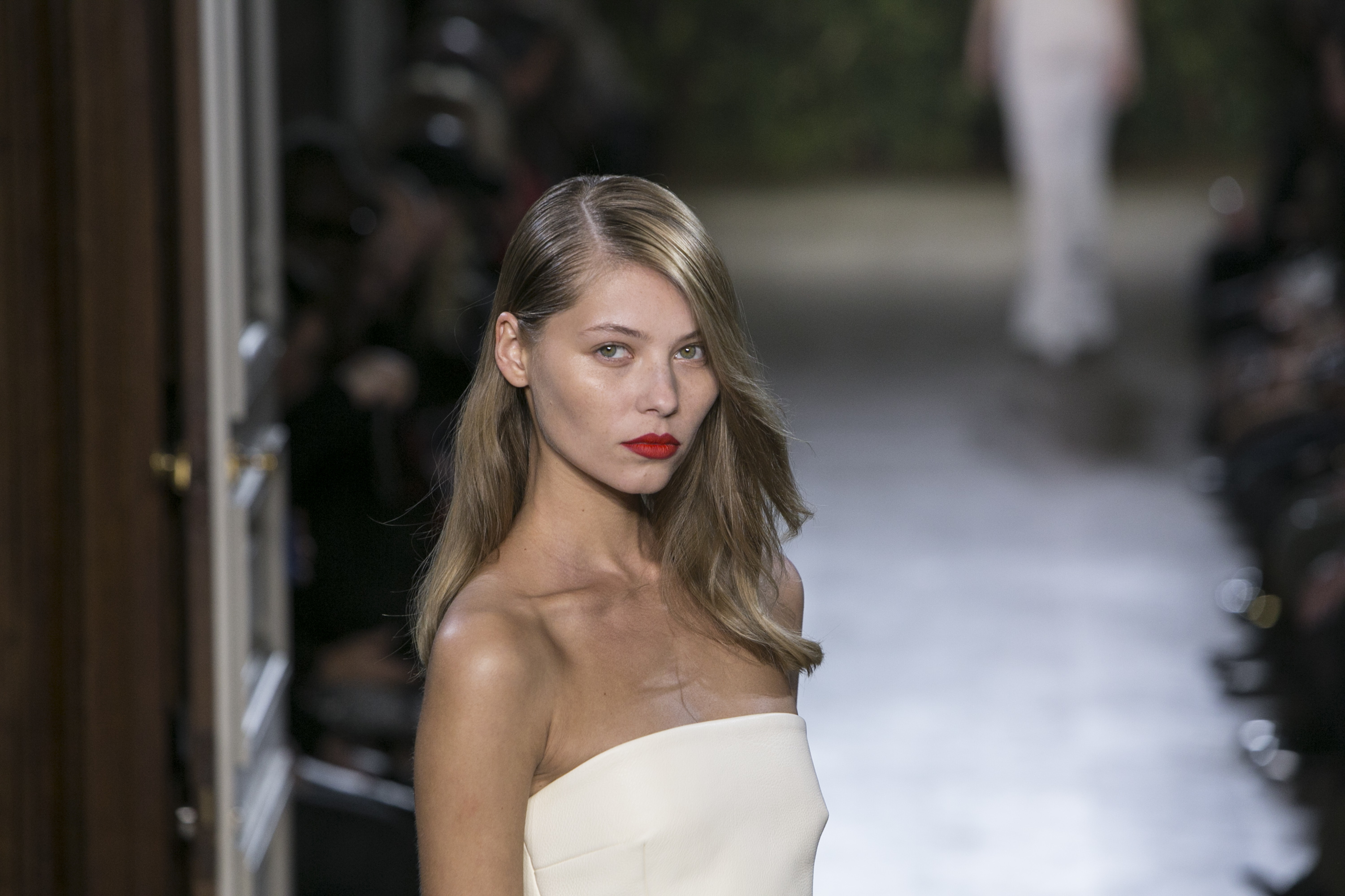 Il y a les épaules étroites, la taille marquée, la coupe au cordeau. Il y a la féminité à fleur de peau, la chair nue révélée au gré d’un décolleté, le volume d’une jupe trapèze légère comme un souffle. Qu’importe les réminiscences d’une décennie fifties ou les sensations d’une escapade à Napa Valley, les couleurs d’une saison californienne impriment subtilement cette couture parisienne affranchie de toute tentation vintage.