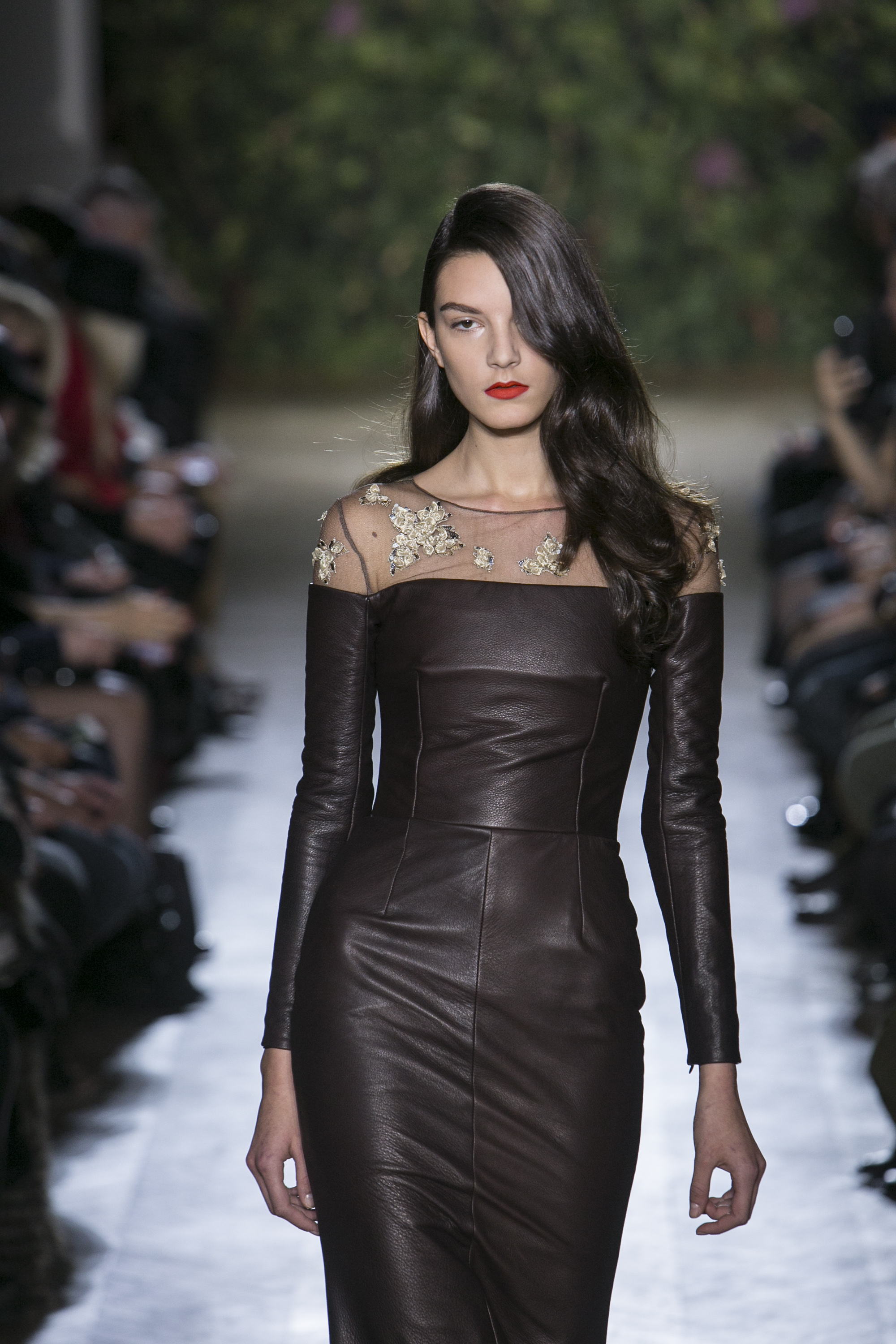 Lʼesprit d’un Old Hollywood se lit en filigrane au fil des décolletés drapés, celui d’un cardigan taillé dans un cuir souple ou bien cet autre d’une robe en molleton brodé couvrant le corps avec une élégance toute pudique. Il y a aussi la ligne A d’une robe féminissime en molleton façon crinoline dont le plastron asymétrique mixe le cuir dans un jeu de construction cher au couturier. Tandis que la beauté d’une robe interminable taillée dans le cuir vanille à la ceinture construite telle un corset exacerbe encore sa modernité.