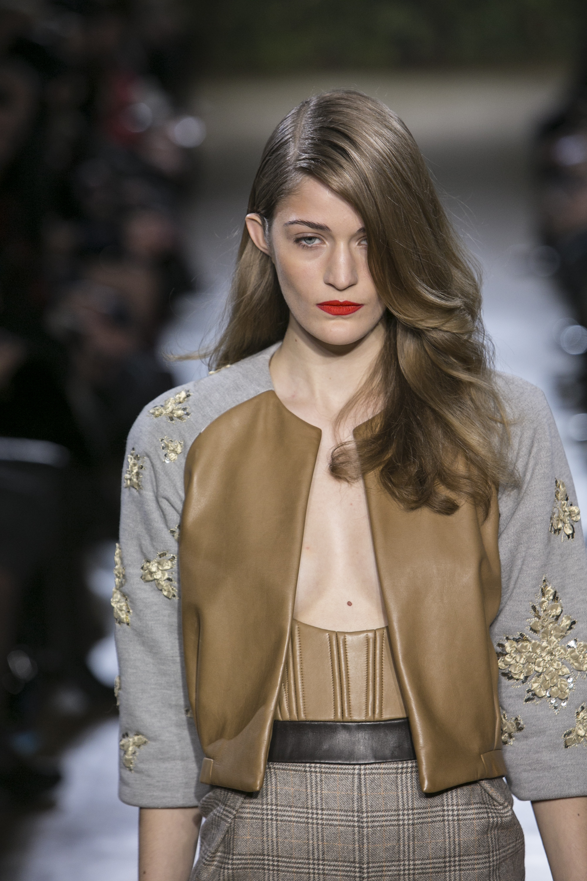 Perchée sur ses kitten-heels, la fille de Didit Hediprasetyo se coule dans ce mood sensible et sensuel plutôt qu’ouvertement sexy. Liane élancée dans un jumpsuit monté au chic, composé d’un plastron d’agneau et d’un pantalon tour à tour en Prince-de-Galles, en pied-de-coq en Songket (ce brocart traditionnel indonésien tissé main), elle s’enveloppe d’un bomber en molleton et cuir brodé de feuilles et de sarments. Le luxe s’immisce jusque dans l’inspiration sportive, le savoir-faire couture ne cède en rien au quotidien, les étoffes masculines donnent du chien au pantalon fitté prenant la taille et arrondissant à peine la