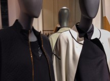 L’atmosphère, soutenue par une palette de gris colorés, féminins et élégants, est réchauffée par les luminaires – Tom Dixon- aux tonalités bronze. Partout, le sens du détail affleure : guéridons de présentation en bois et laque, tables gigognes en marqueterie, portants valet en métal laqué, châssis de toile en cuir, clin d’oeil au savoir-faire maroquinier de la maison.