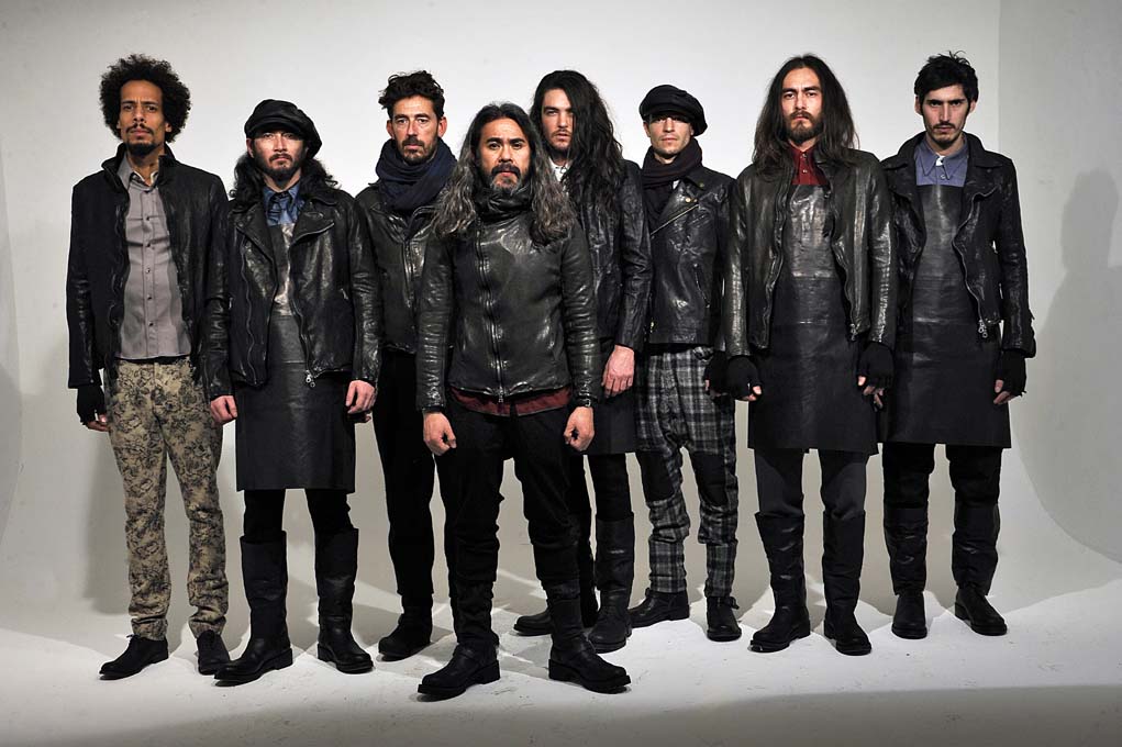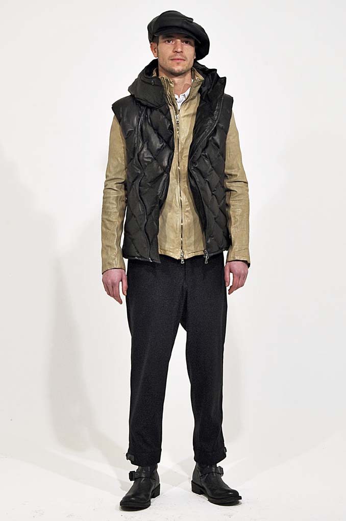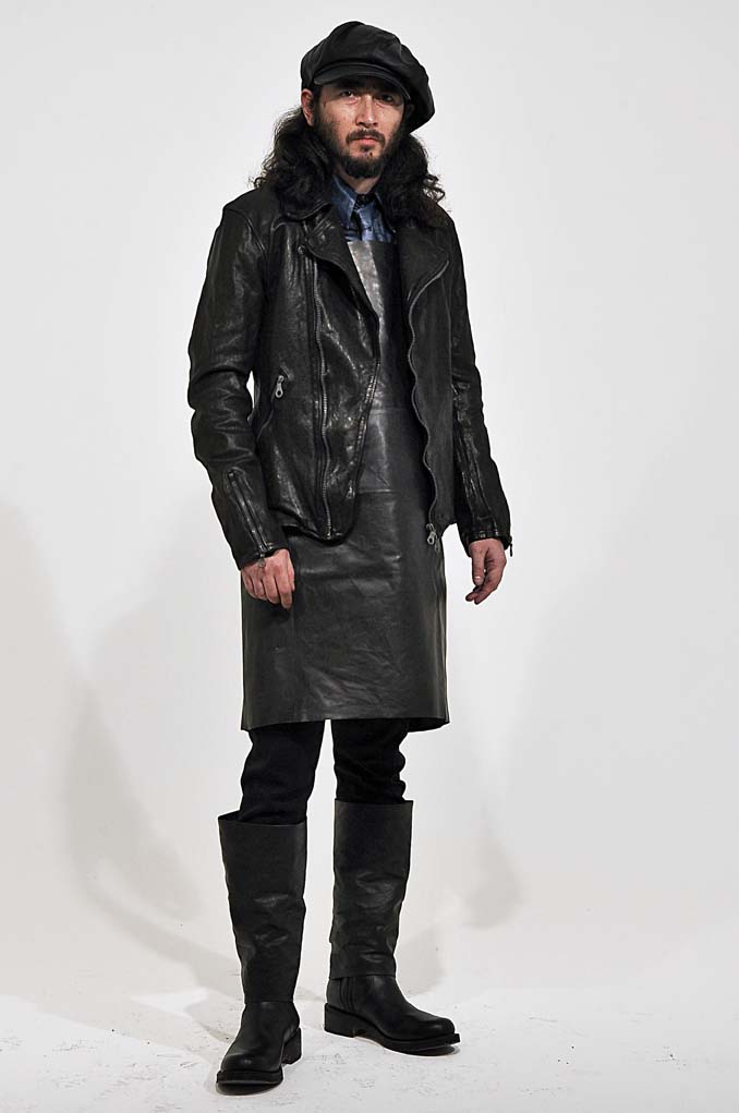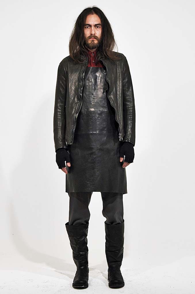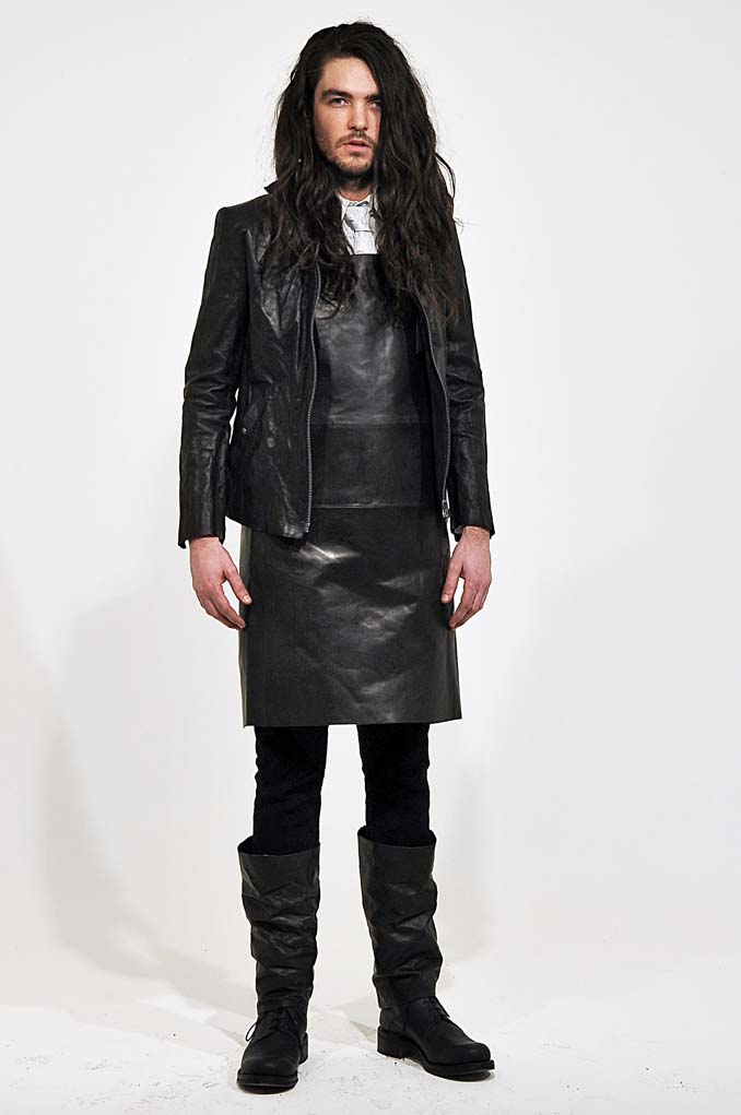 Chemises, cravates et tabliers de cuir sont portes sous des ensembles de laine, la laine est mélangée au lin et cuir teint.