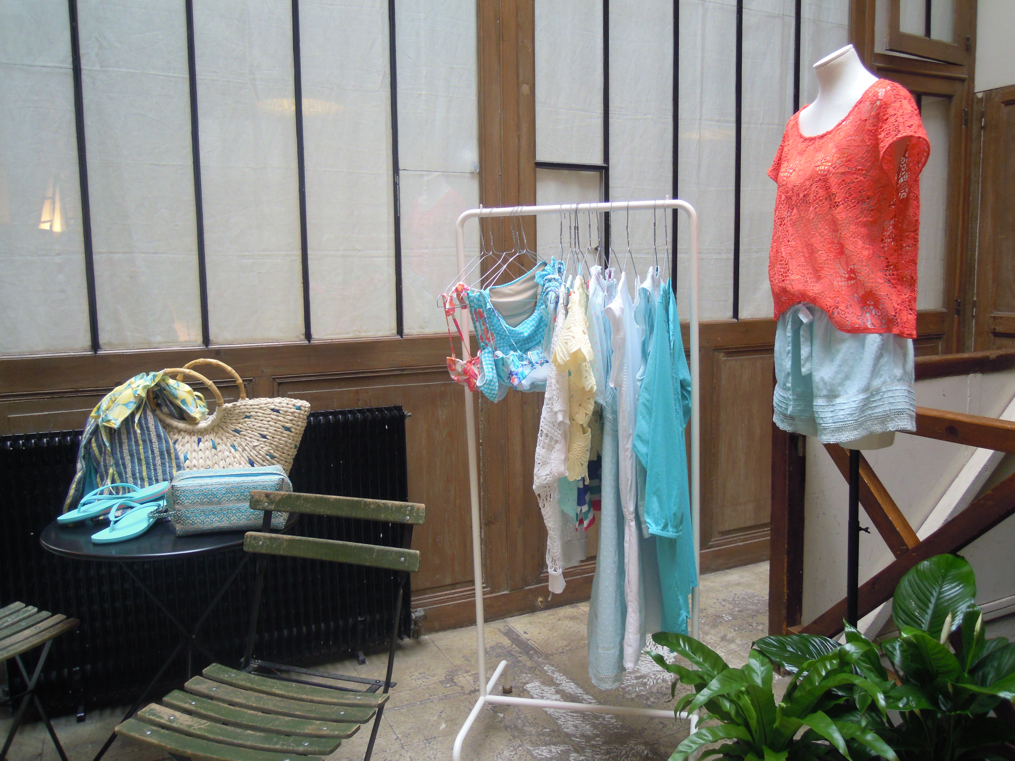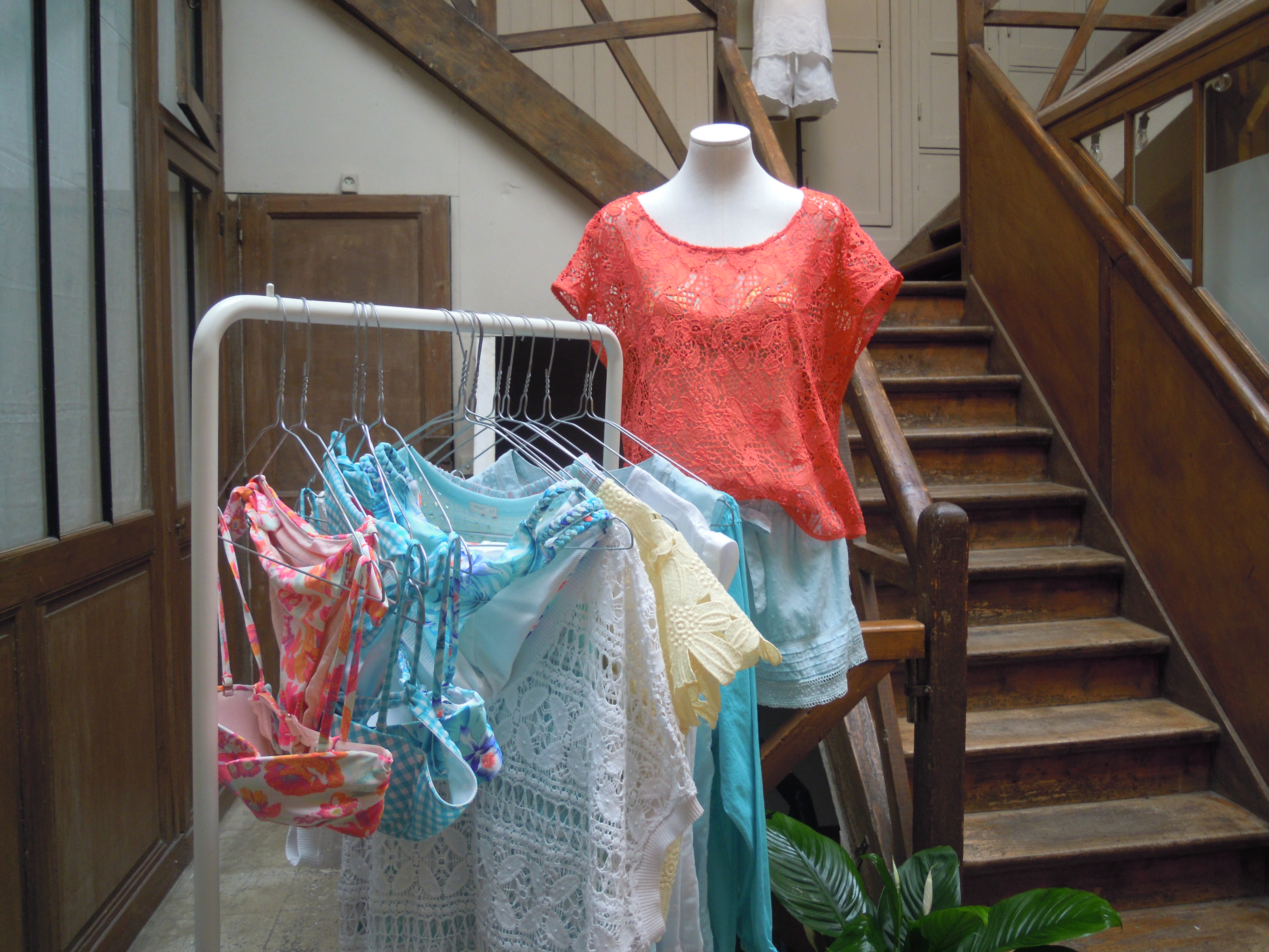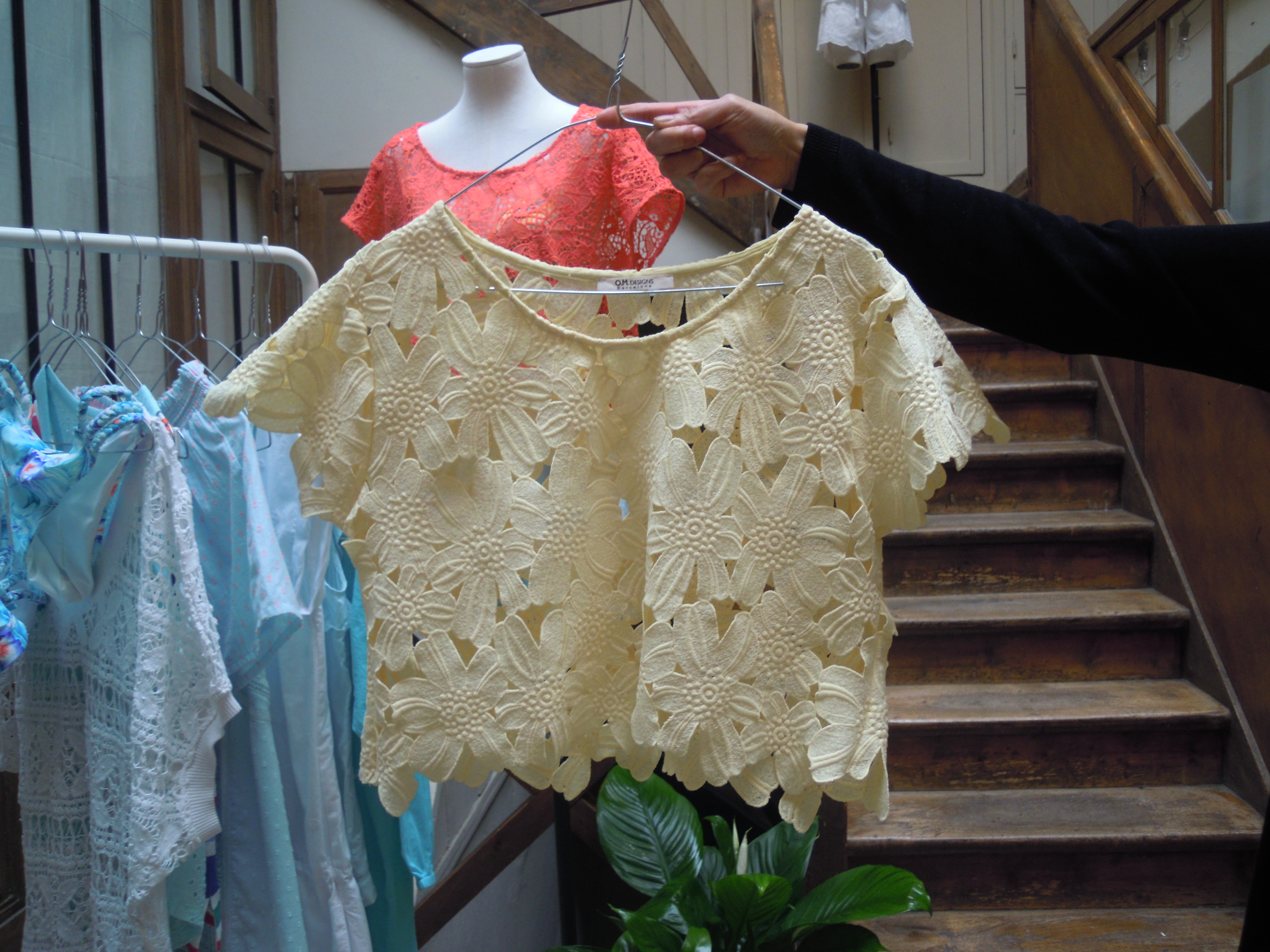 Côté chaussures, la tendance est à l’espadrille, que cela soit en baskets ou en forme classique. Les détails sont là encore très importants, avec ce travail de tissage et de broderie. Les couleurs sont d’un côté solaires, avec du jaune, du rose, du rouge et une touche de bleu, et de l’autre plus classiques, avec du bleu, du rouge et du blanc. Autre pièce phare, ce haut entièrement brodé très finement !