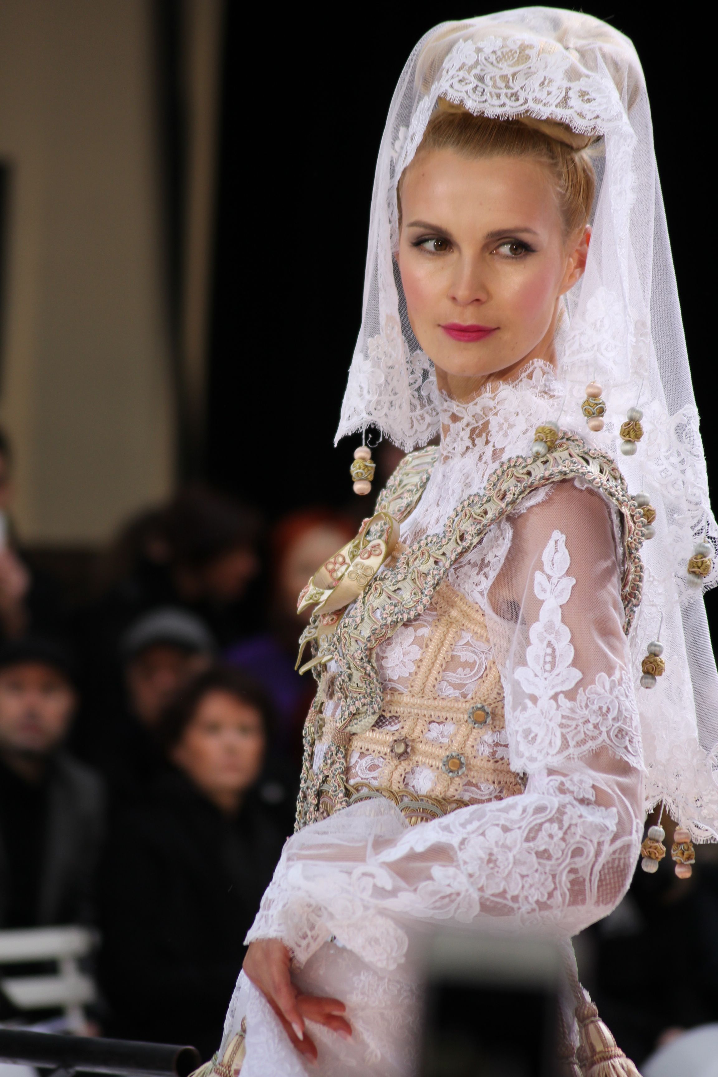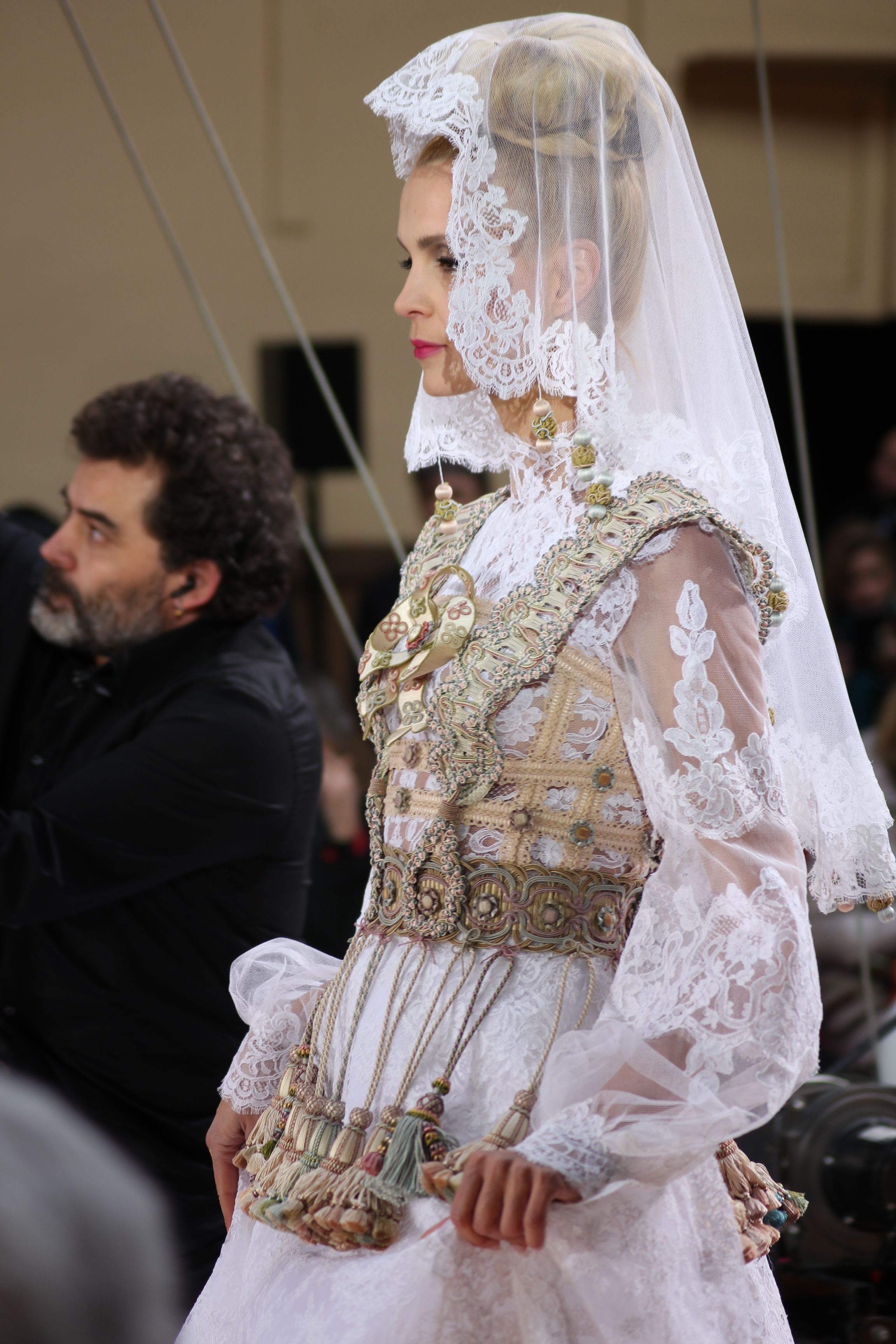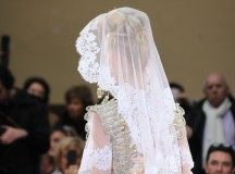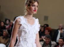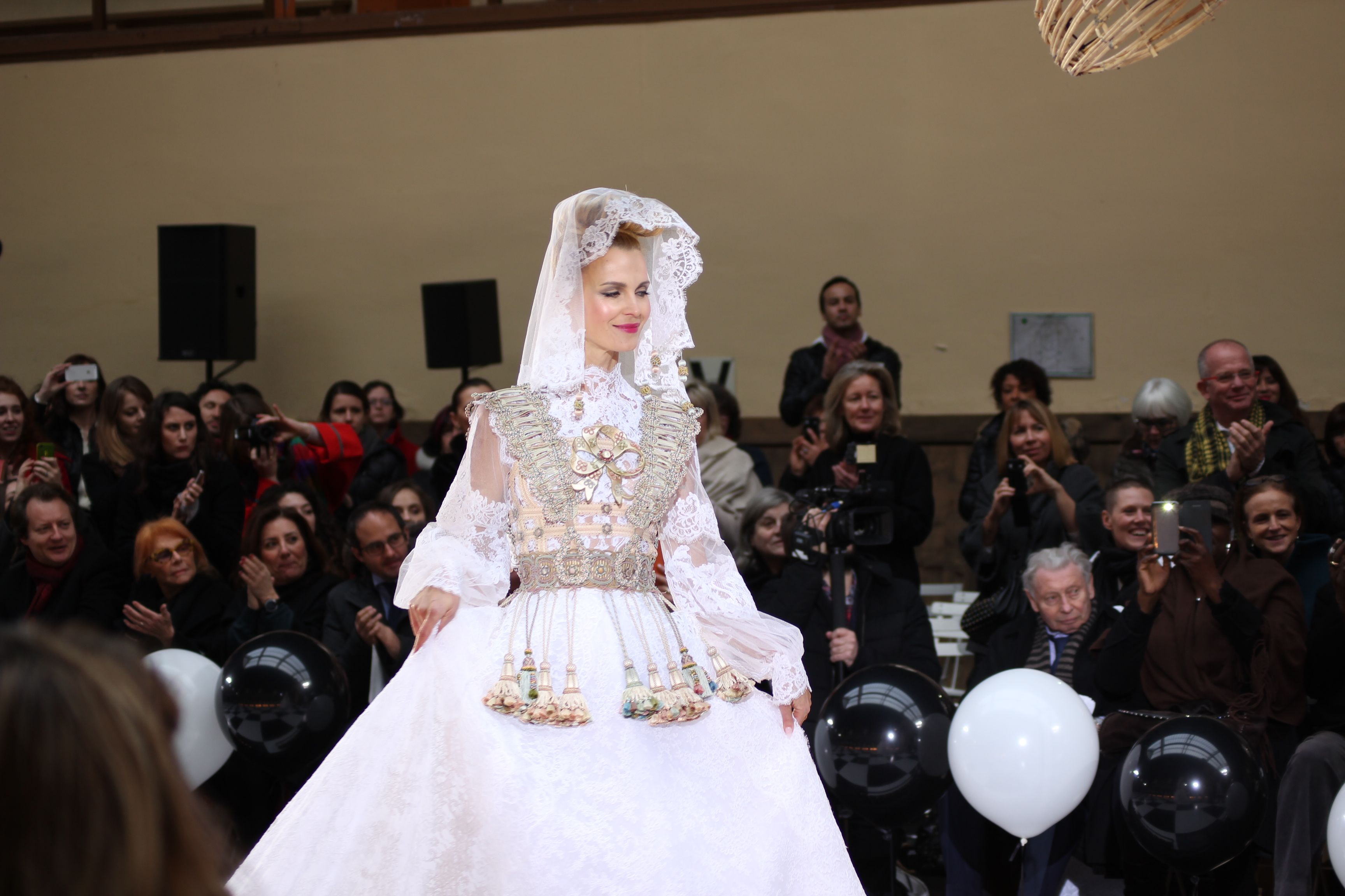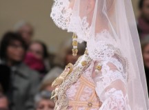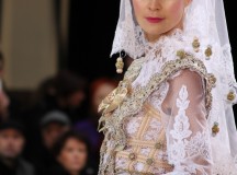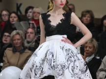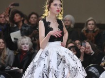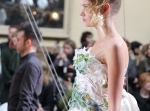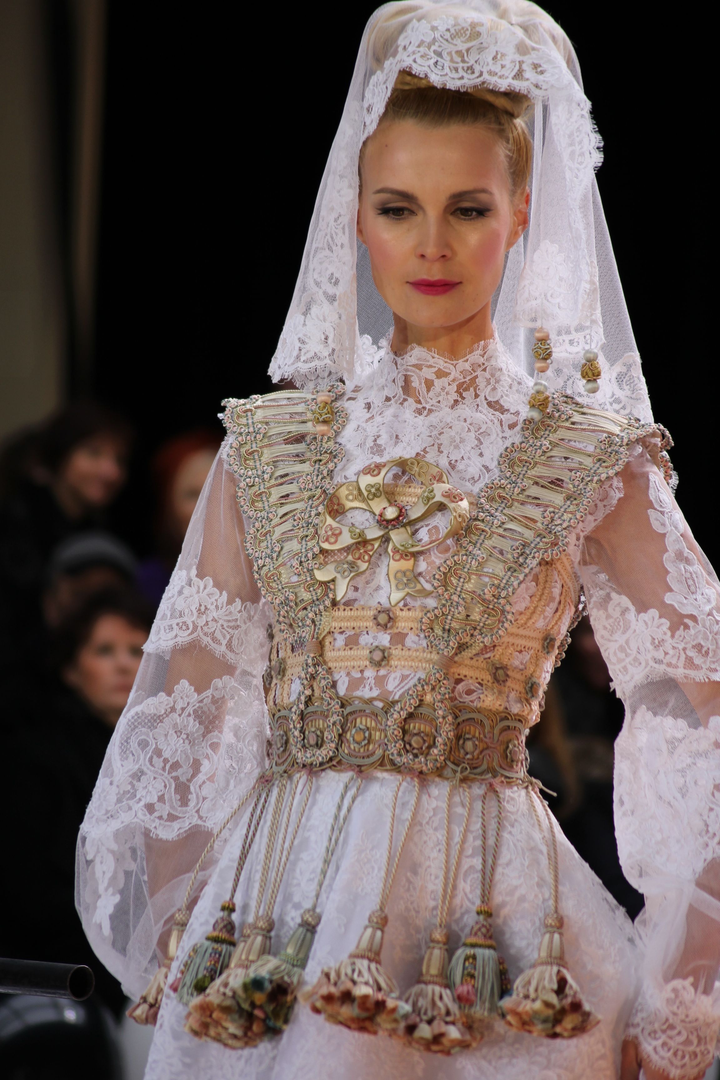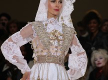 Pour finir « Russie des Contes », la Femme Franck Sorbier rentrée dans le corps d’une mariée russe revisitée, entièrement brodée de dentelle et de tulle, ornée avec sublimation, défile sous nos yeux admiratifs de cet art.