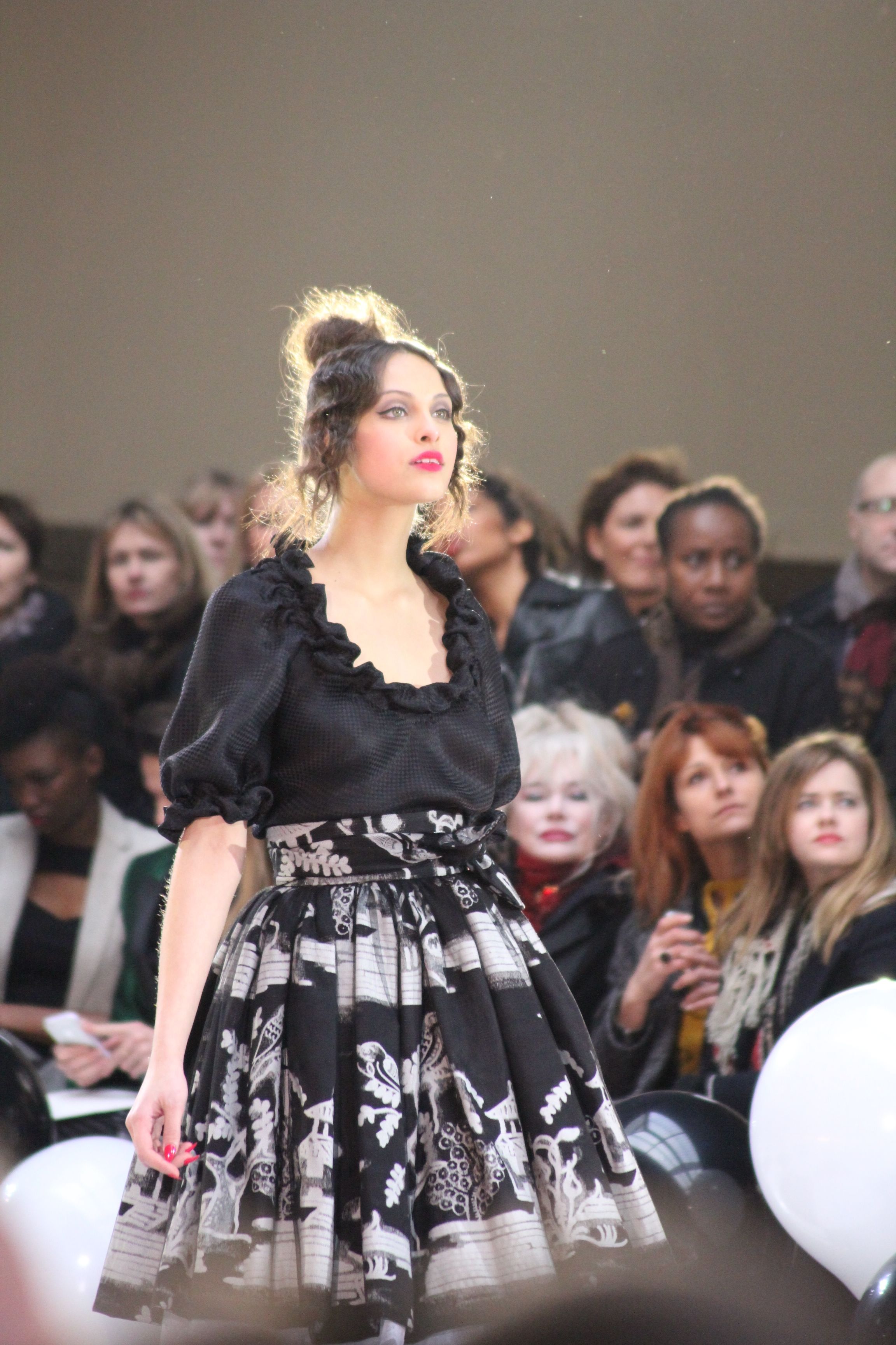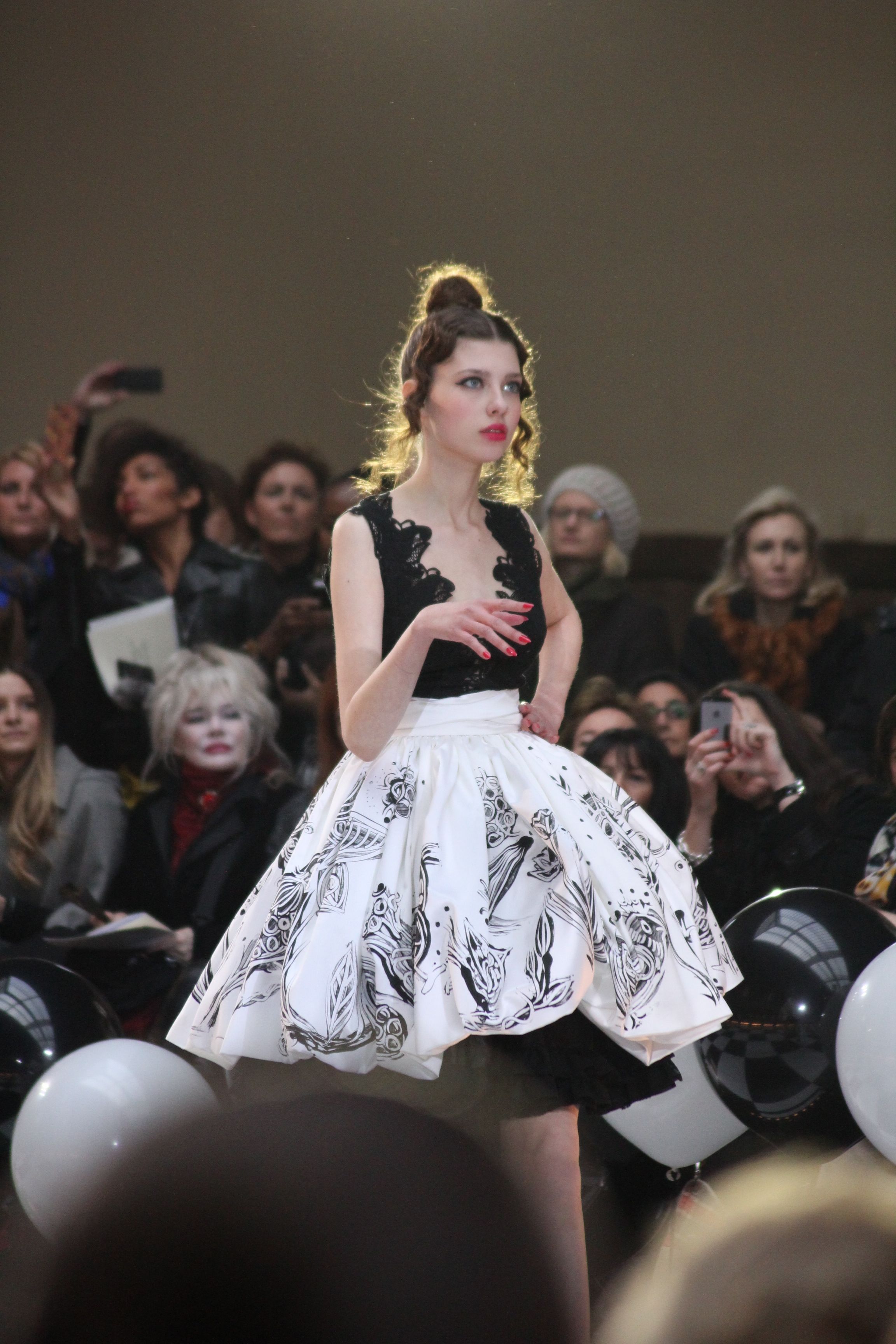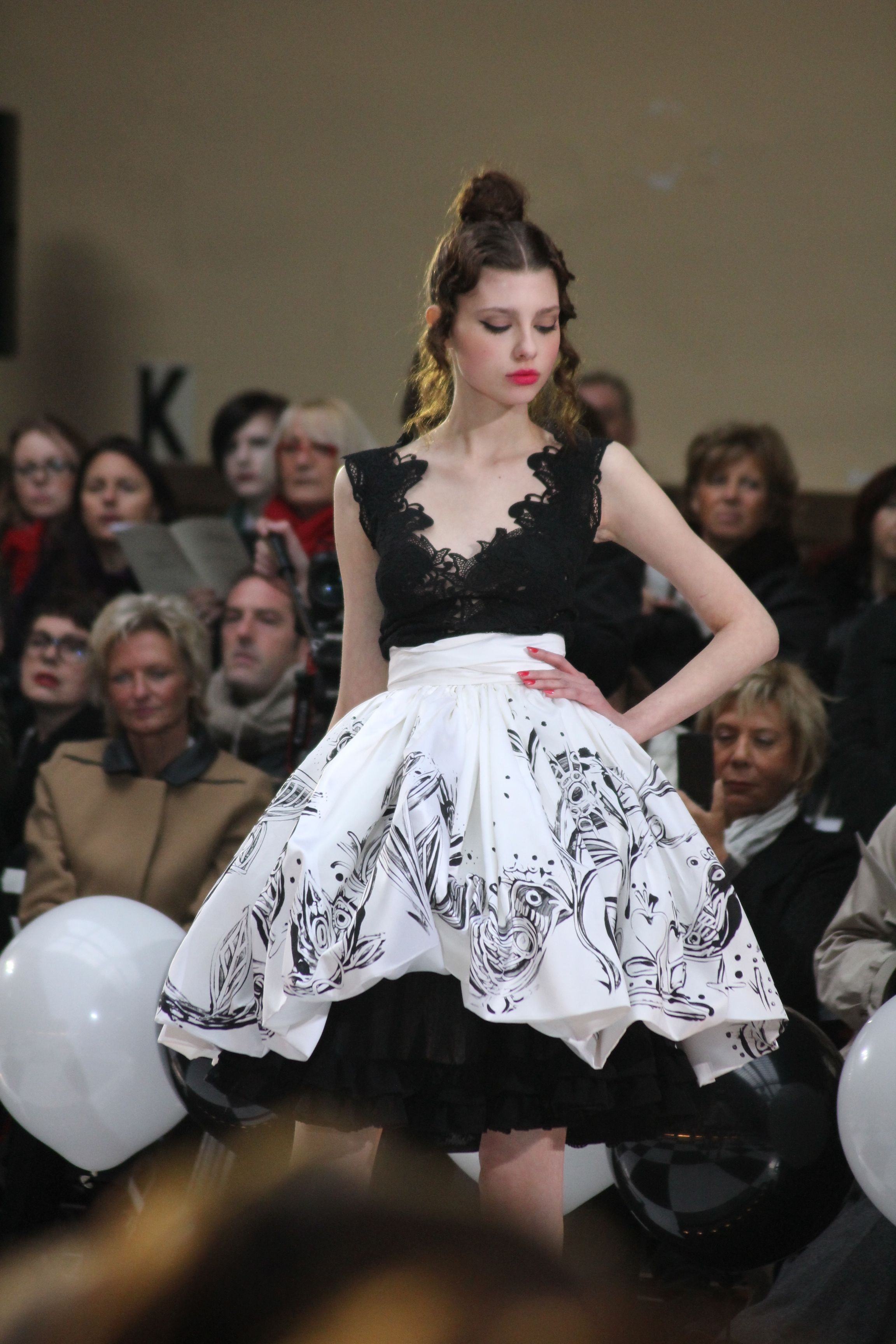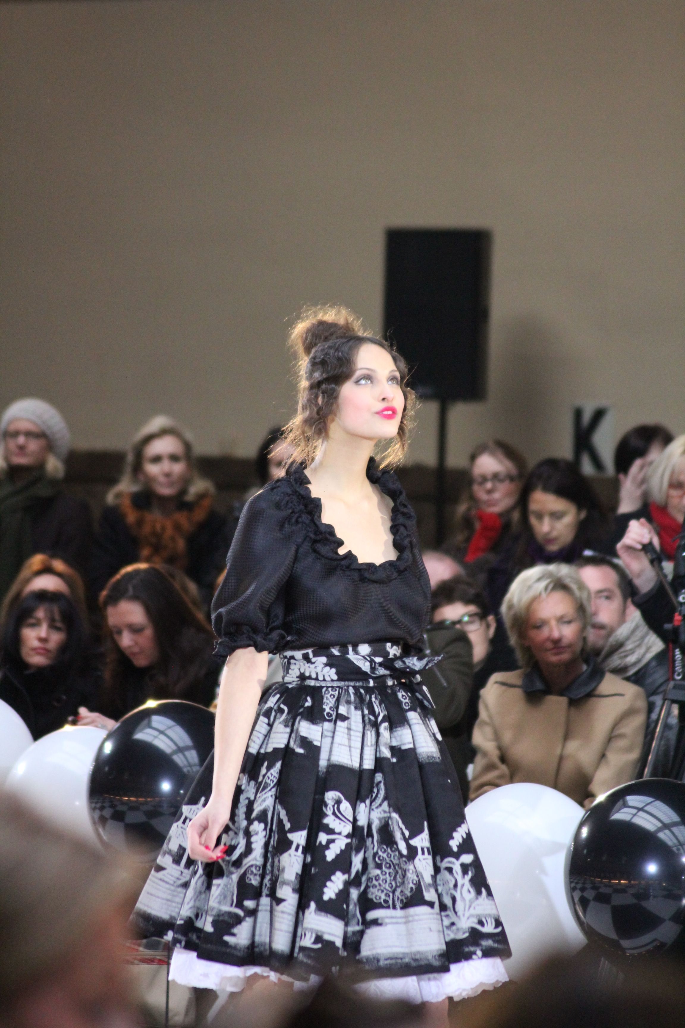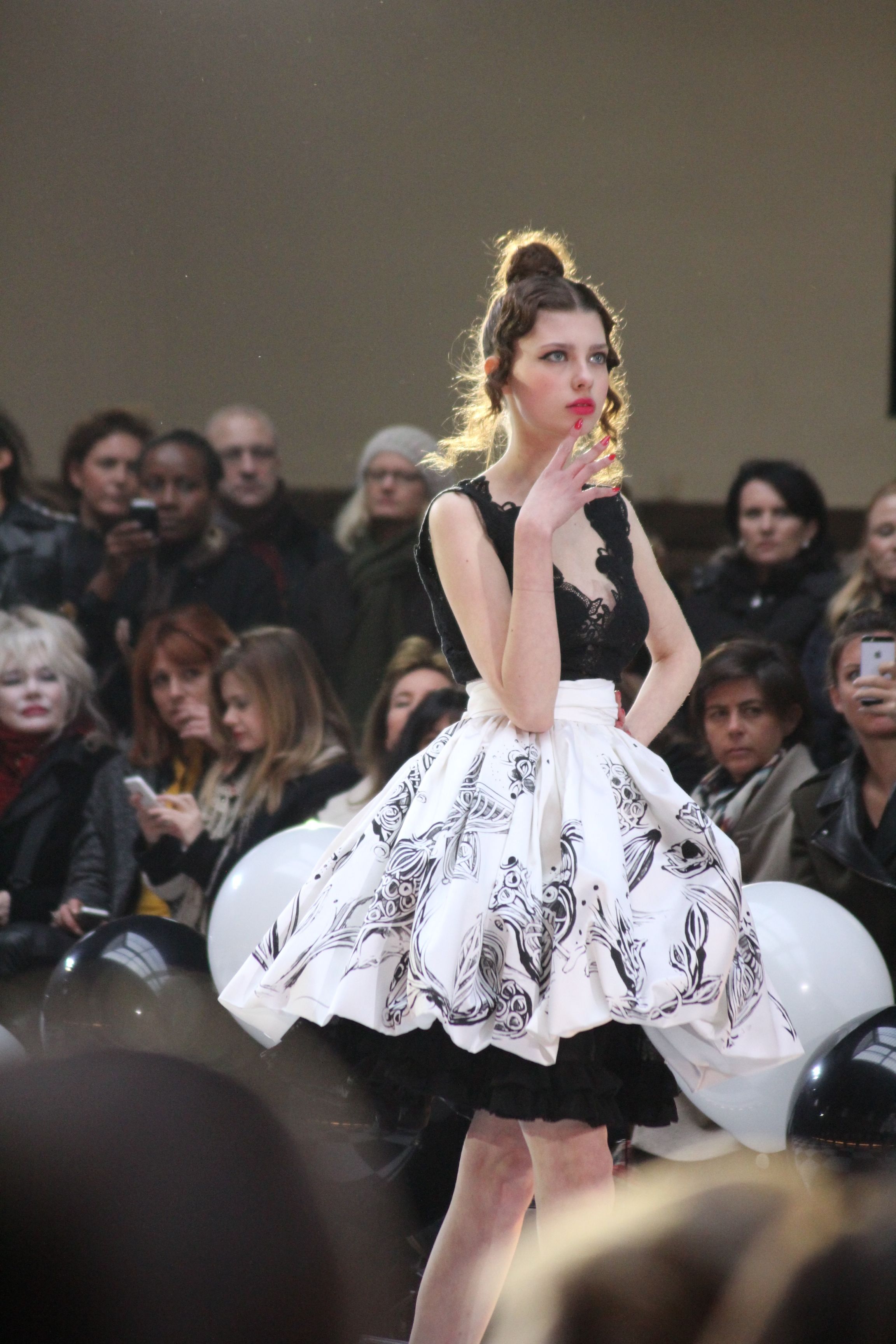 « Jolies pépées canailles » est un monde où le jacquard en noir et blanc est souverain, décliné, sur des jupes évasées ou froncées.