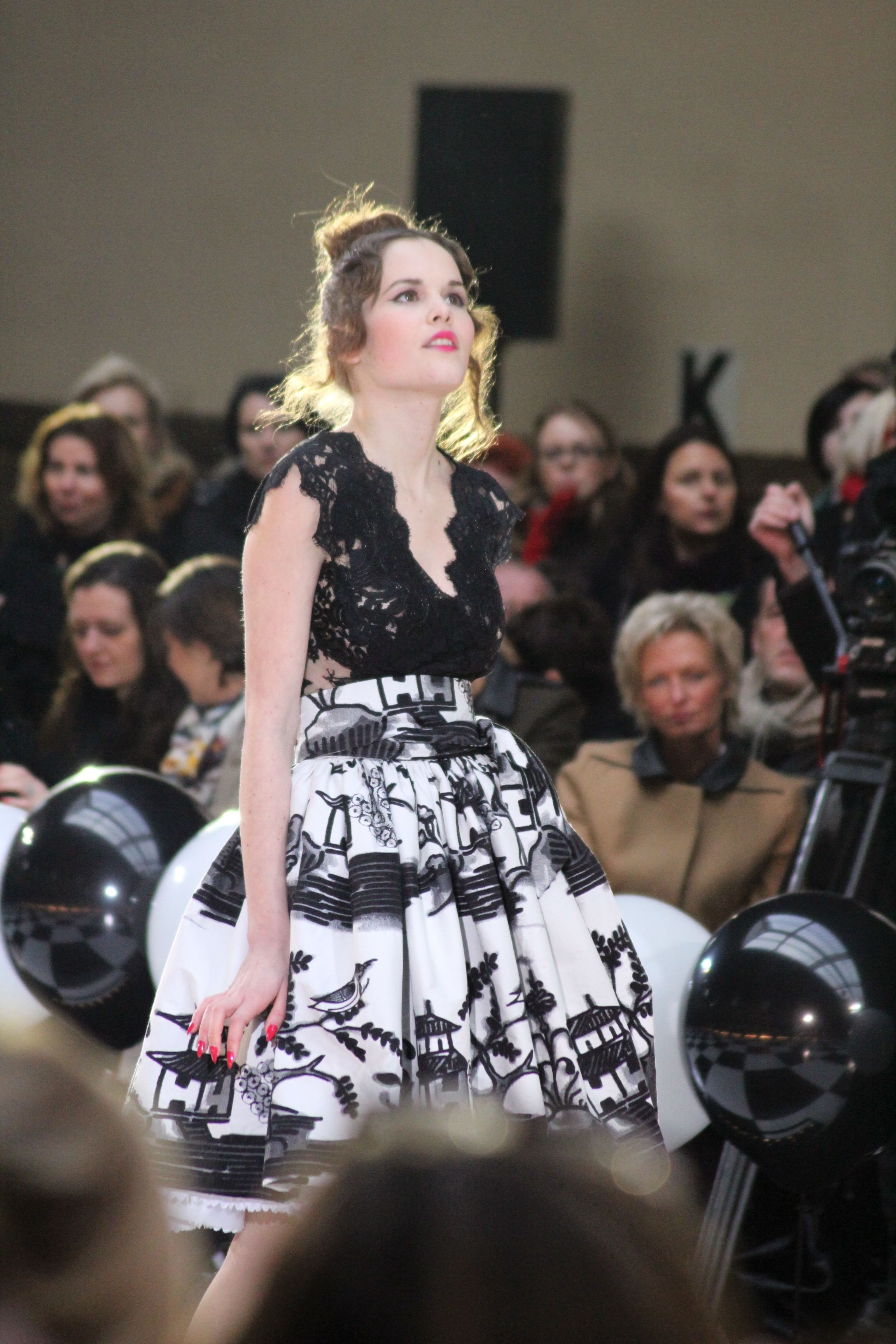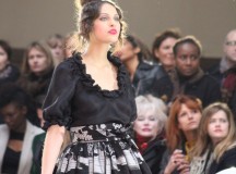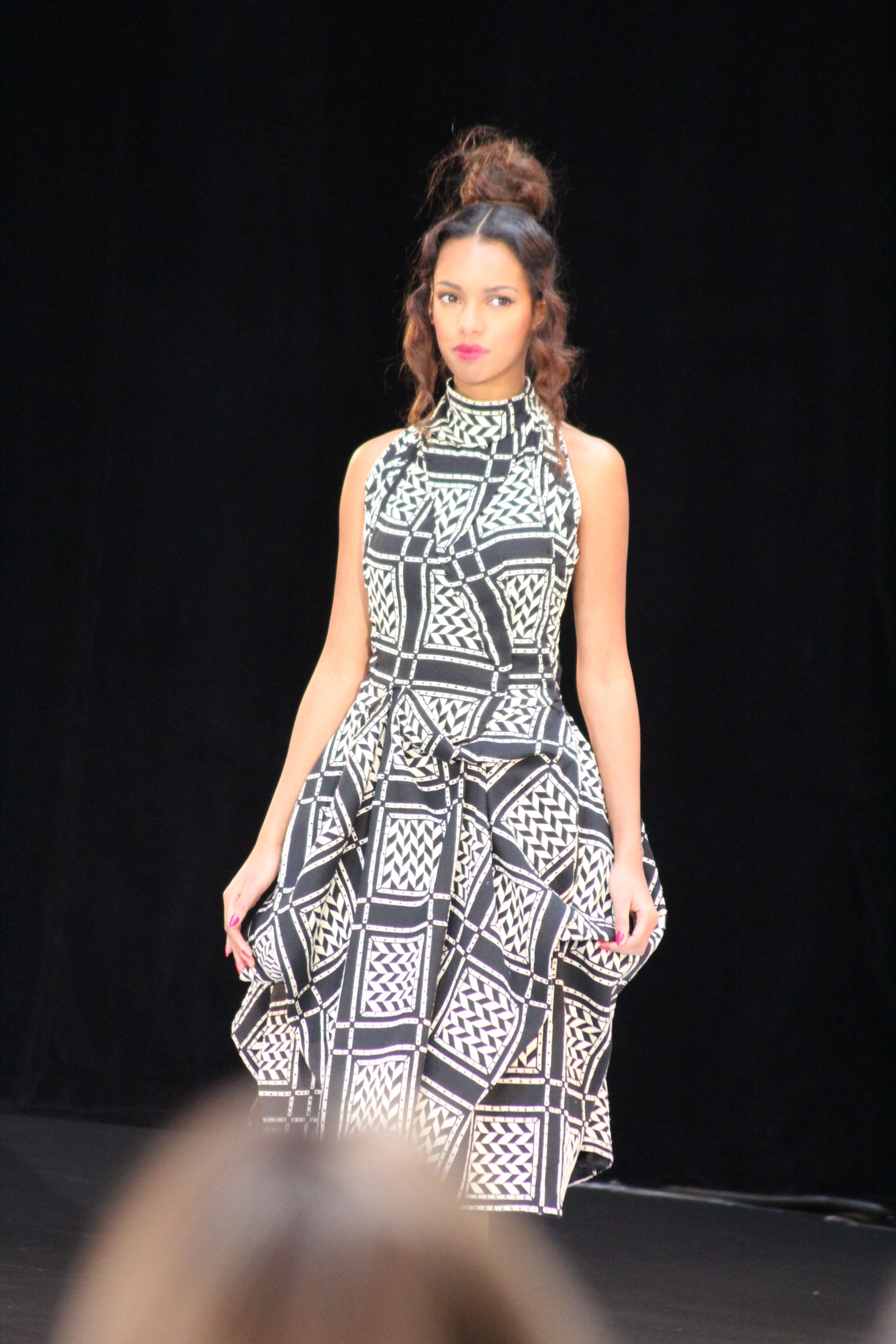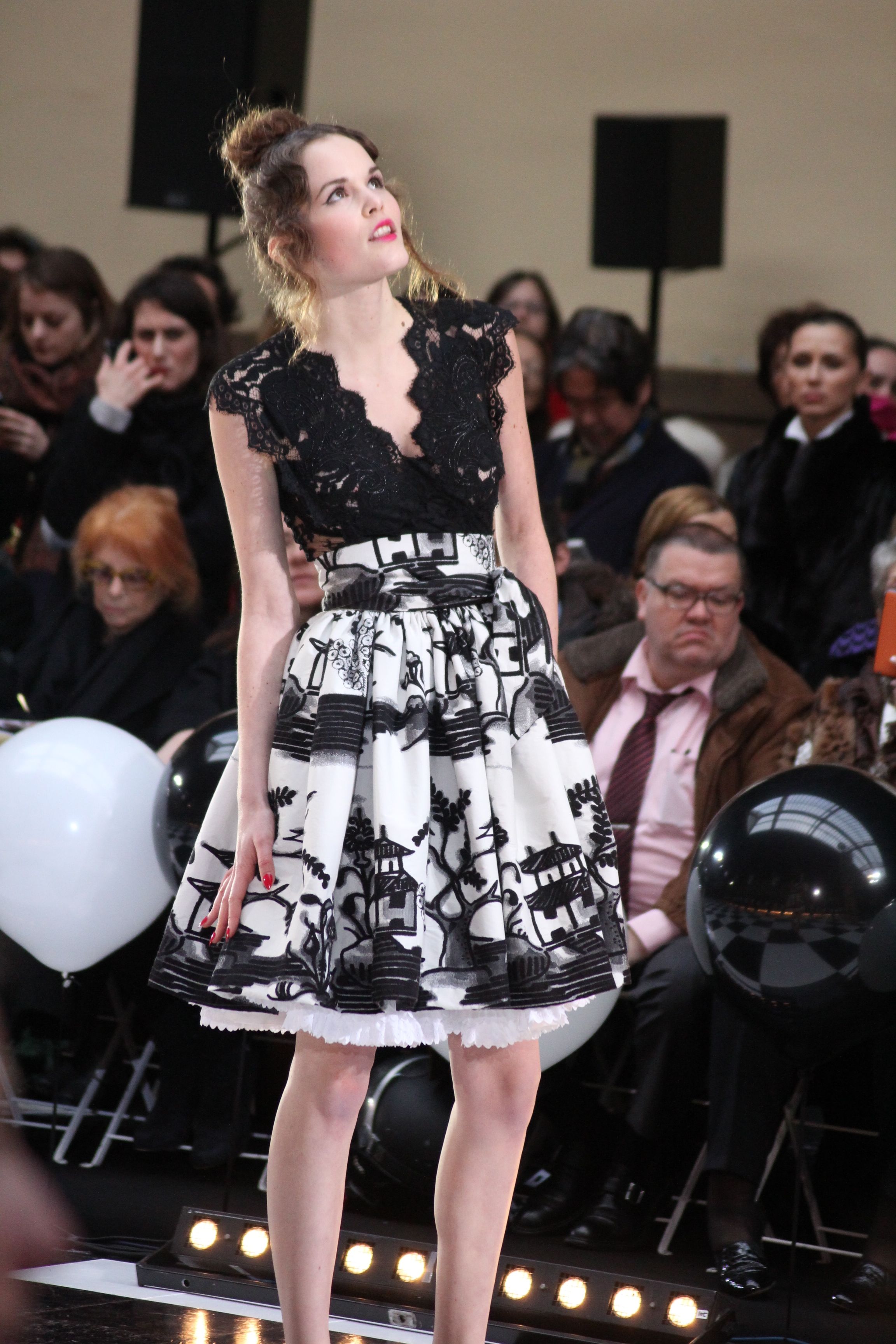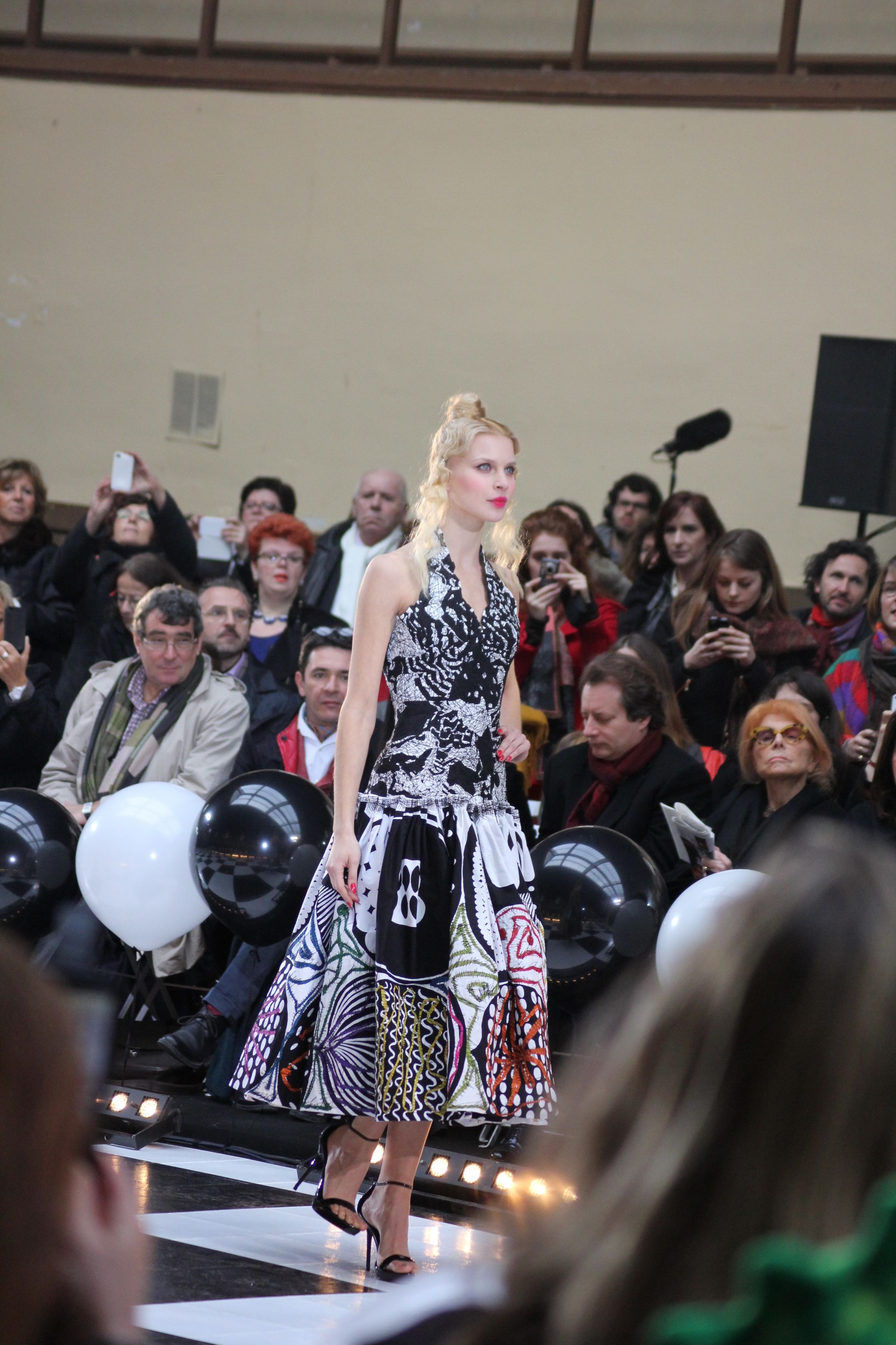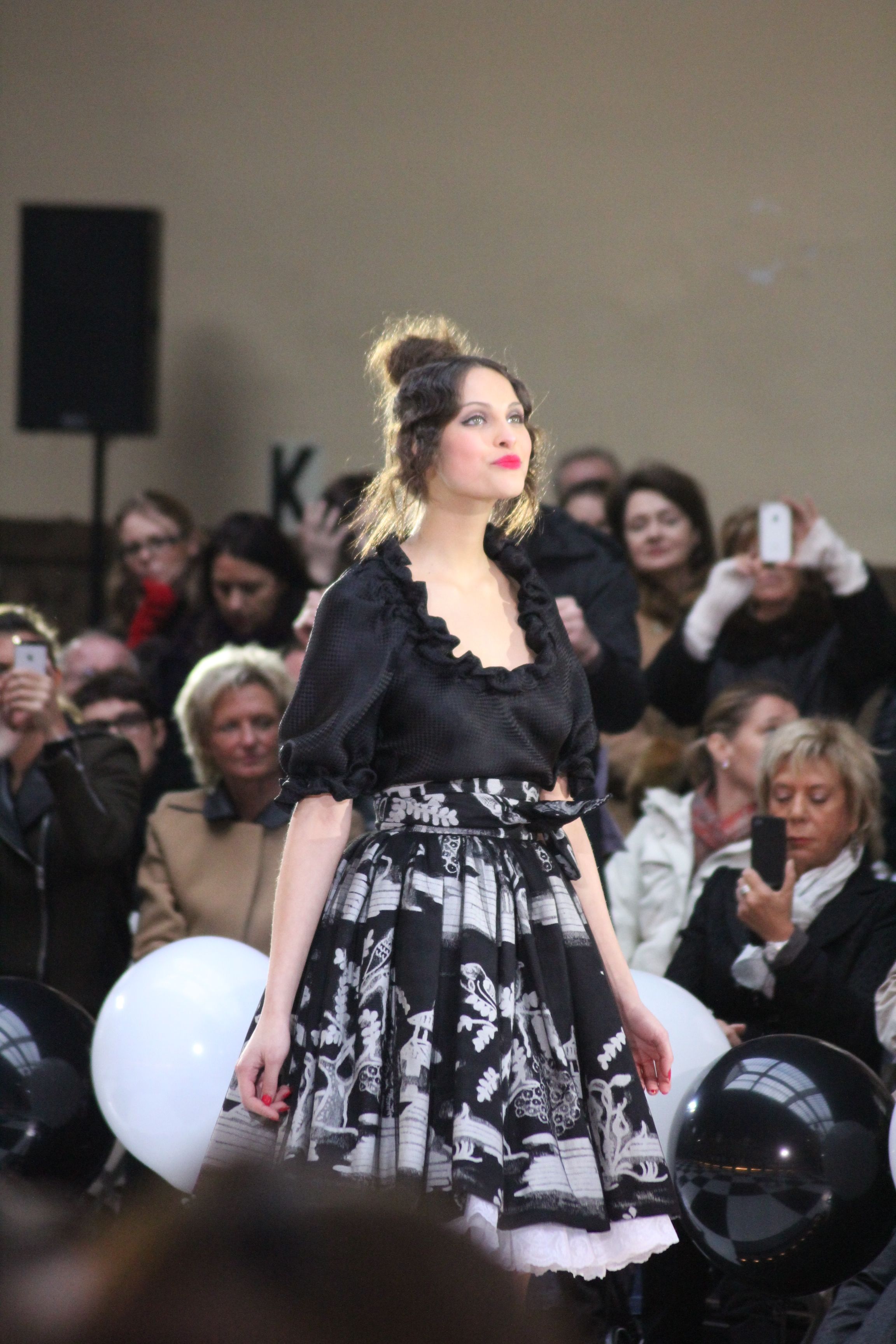 « Jolies pépées canailles » est un monde où le jacquard en noir et blanc est souverain, décliné, sur des jupes évasées ou froncées.