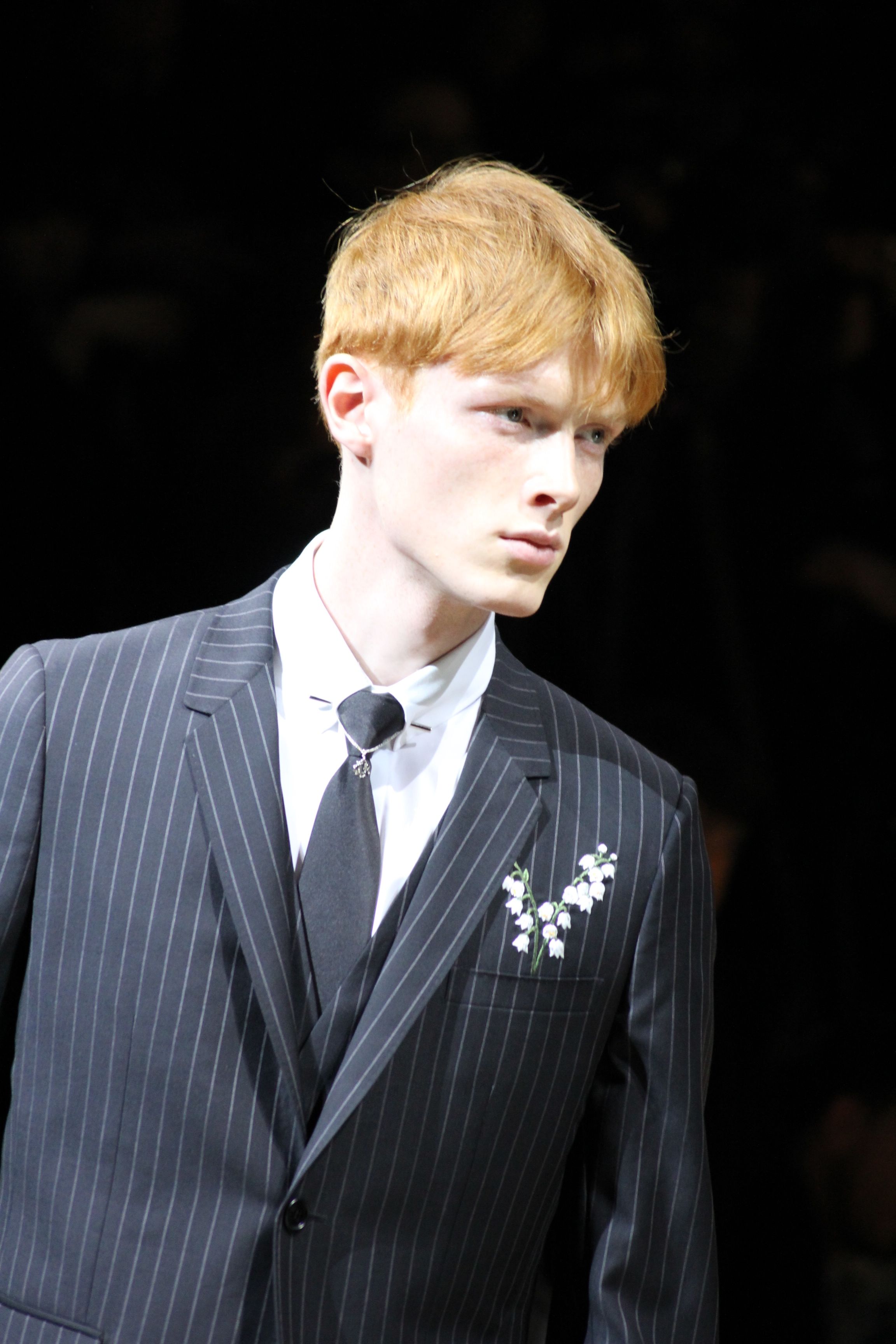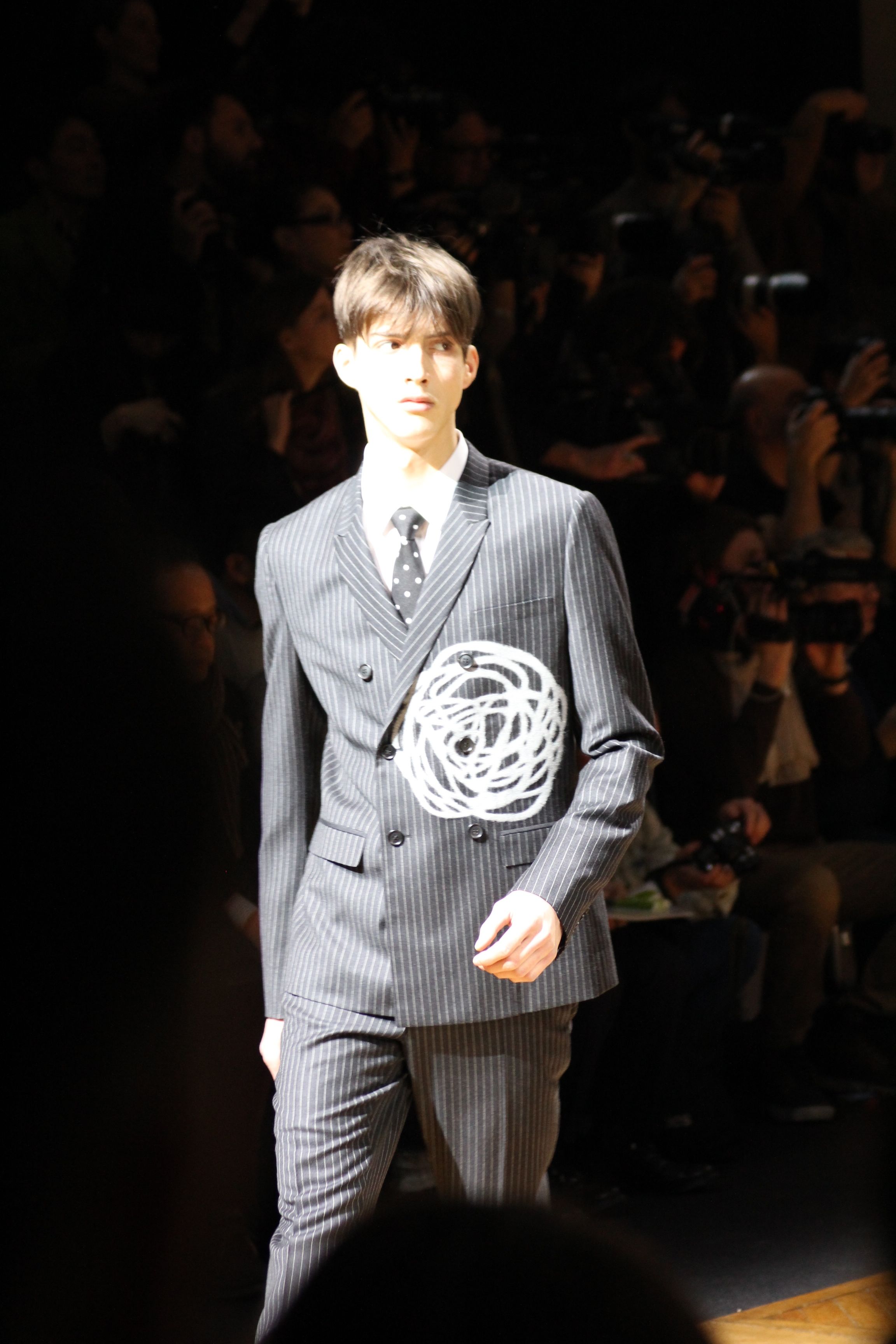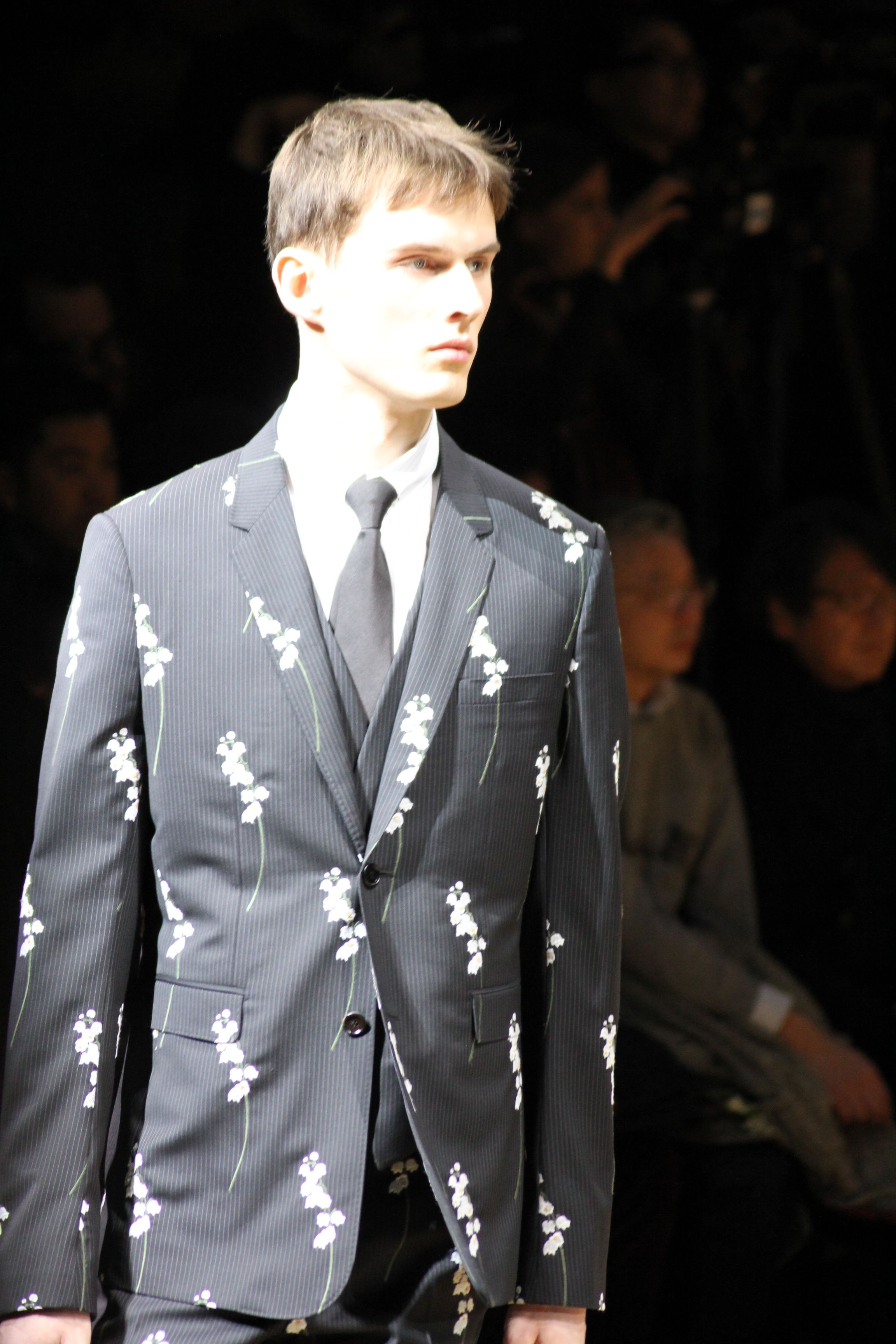 « Cette saison, j’ai voulu mettre en avant l’homme, l’individu, avant la marque : c’est une idée de l’homme dior que dévoile cette collection. » explique Kris van Assche, directeur artistique de Dior Homme. elle trouve sa force dans un dialogue entre le formalisme de savile row et les archives de moansieur dior, et dans la rencontre du haut-de-gamme traditionnel et du haut-de-gamme de la rue. Les archives et l’univers de monsieur dior tant masculin (en termes de tissus par exemple) que féminin (avec les broderies de la couture) sont mis en perspective et recontextualisés. ainsi, ses porte-bonheurs, qui sont autant de signes de reconnaissance de la maison – le muguet, l’étoile, le coeur, la pièce de monnaie –, se retrouvent en broderies, en imprimés, en maille mais aussi dans les propositions de joaillerie masculine, des épingles à cravates aux broches moins conventionnelles : une touche d’extravagance et un clin d’oeil à la chance. Ailleurs, les pois de la cravate traditionnelle se retrouvent brodés sur des silhouettes entières, sur des sacs ou des souliers : le formel devient non conventionnel. Ailleurs encore, une broderie de rose abstraite des archives haute couture de la maison, joue avec un costume à rayures tennis – vêtement iconique de monsieur dior lui-même – ou s’affiche comme motif d’un manteau à rayures tennis oversize, porté avec jean et baskets. Cette rencontre d’états d’esprit est au coeur de la collection. et comme la garde-robe masculine dérive d’un patrimoine utilitaire et militaire autant que de l’art du tailleur traditionnel, ici les jeans, les parkas et les blousons d’aviateurs en nylon japonais voisinent avec de classiques manteaux de laine.