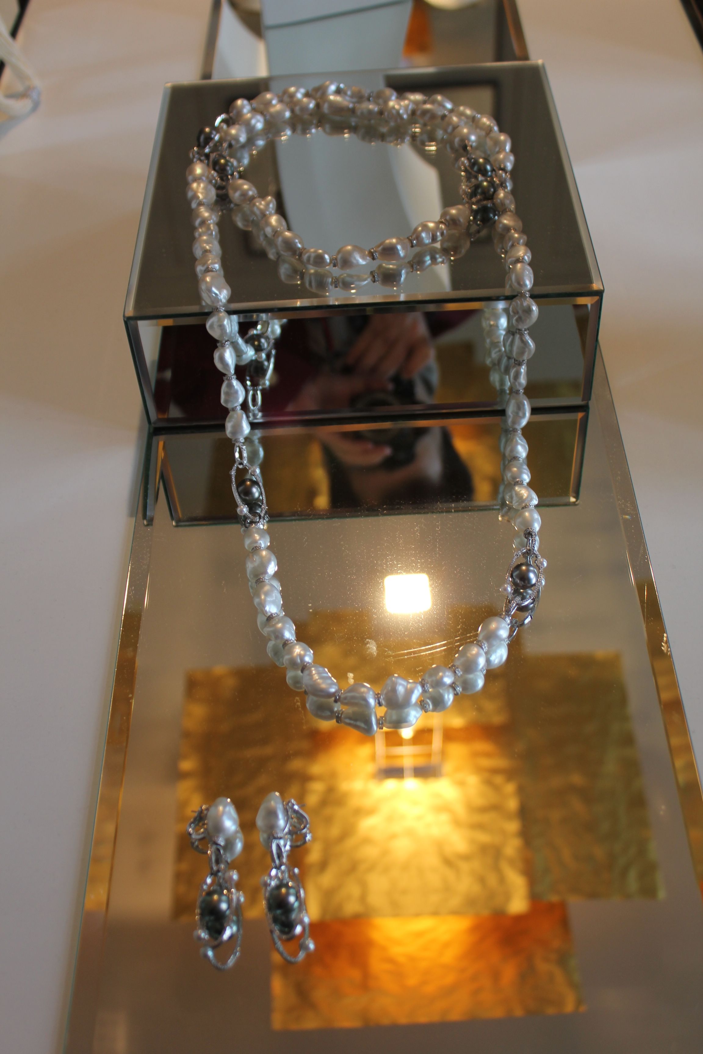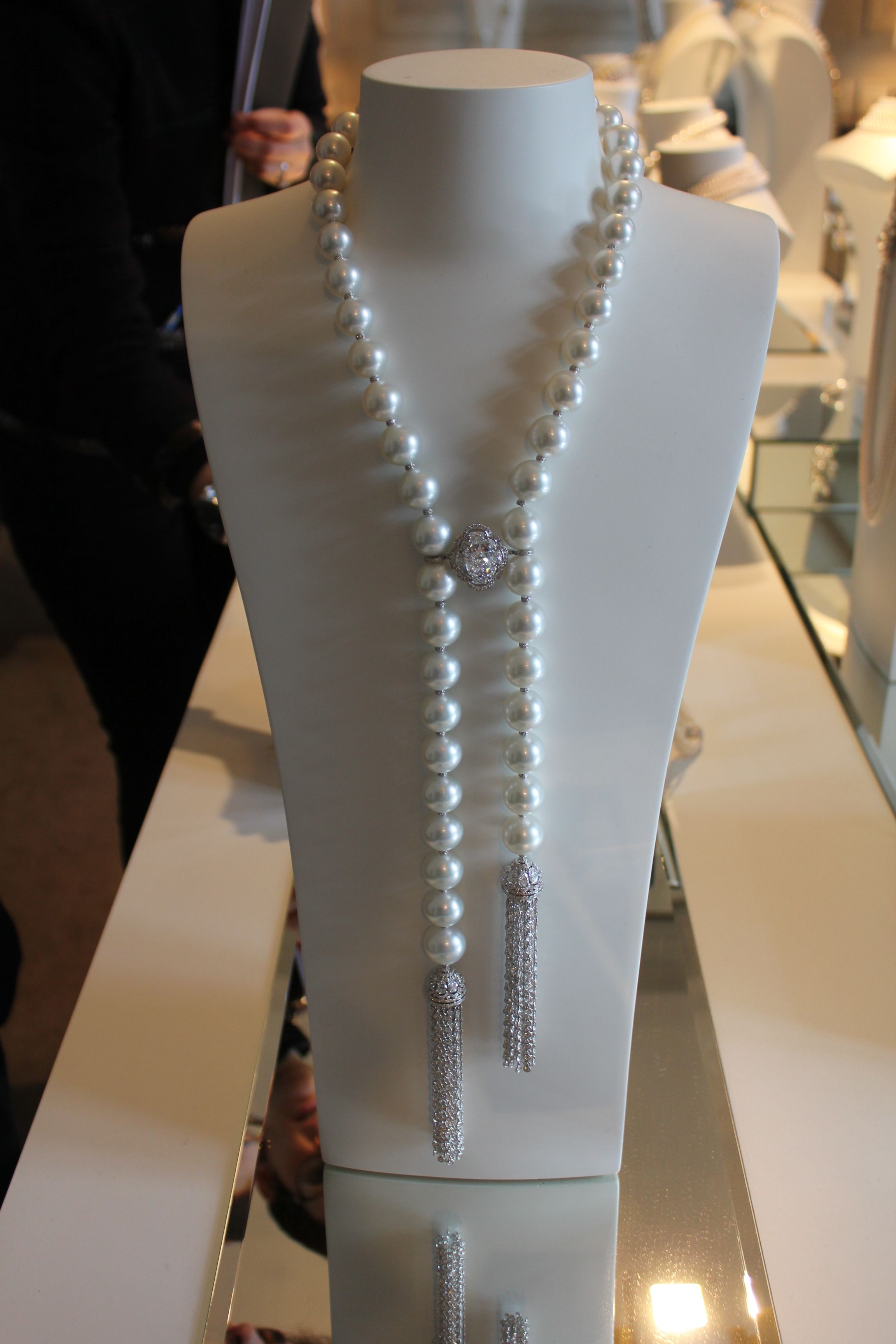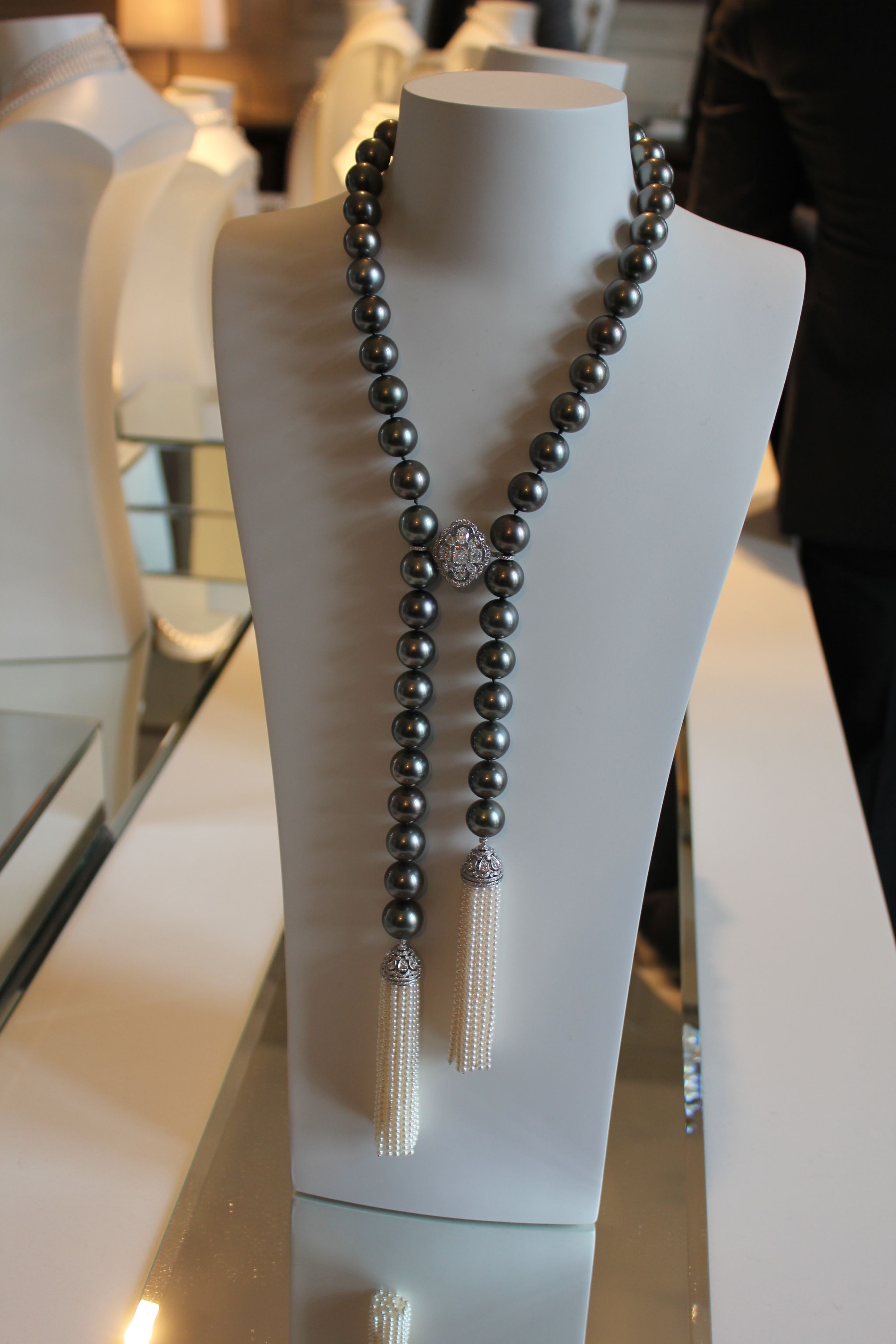 Le collier «Perles de Jour» est une étonnante chute de perles des Mers du Sud d’un diamètre spectaculaire somptueusement ponctuée d’un diamant de 8 carats… Le collier «Perles de Nuit» en est la magnifique réplique en perles grises de Tahiti.