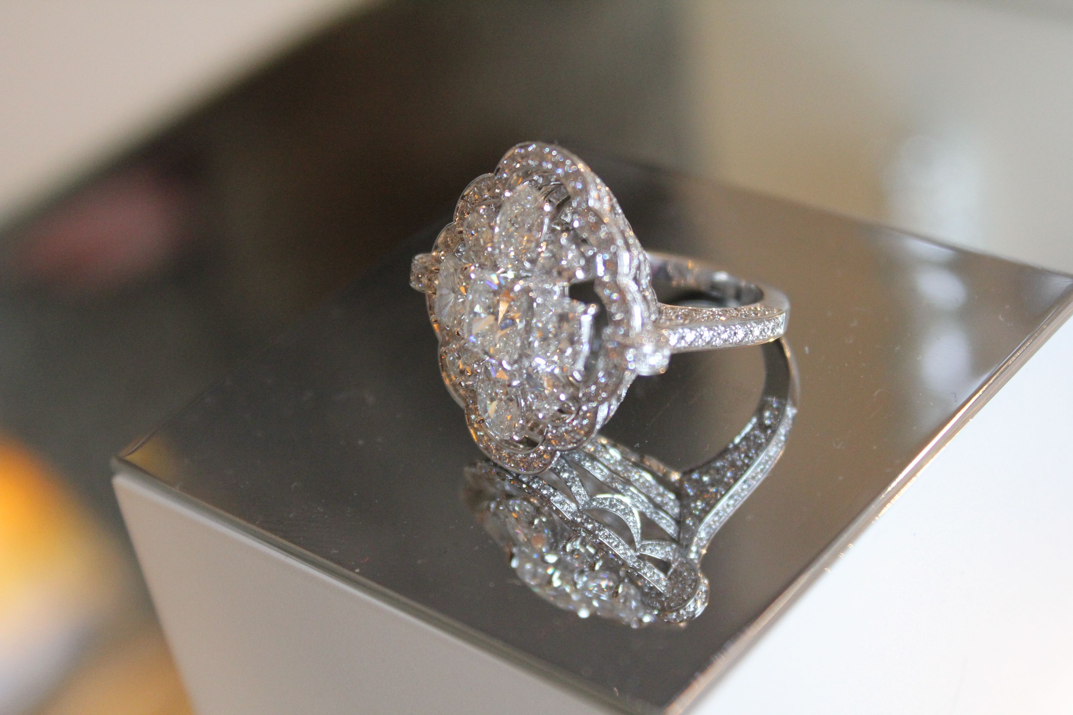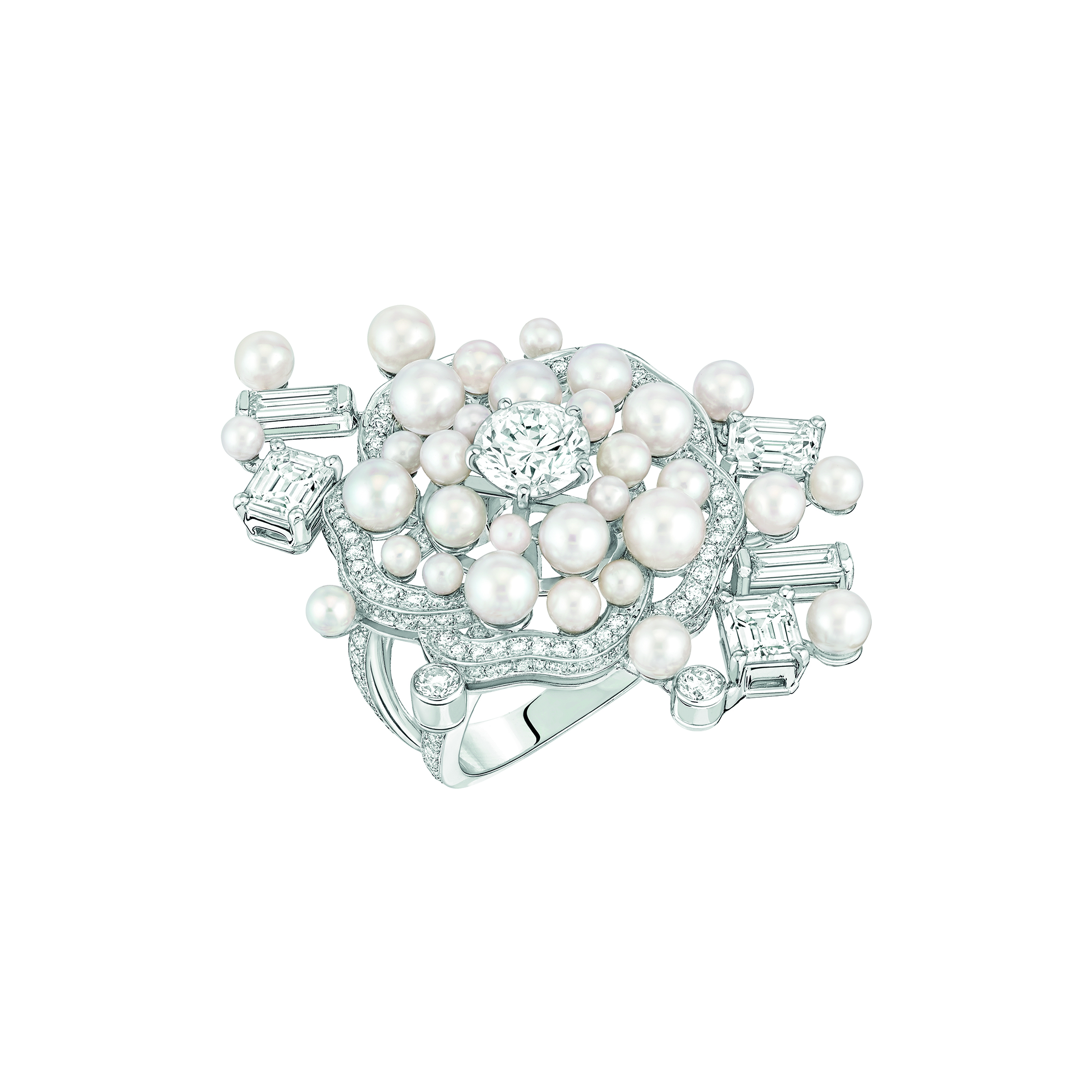 Bague « Pluie de Camélia » en or blanc 18 carats serti de 210 diamants taille brillant pour un poids total de 1,9 carat, 5 diamants taille émeraude pour un poids total de 1,8 carat et 32 perles de culture du Japon.