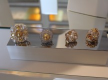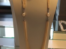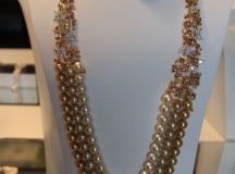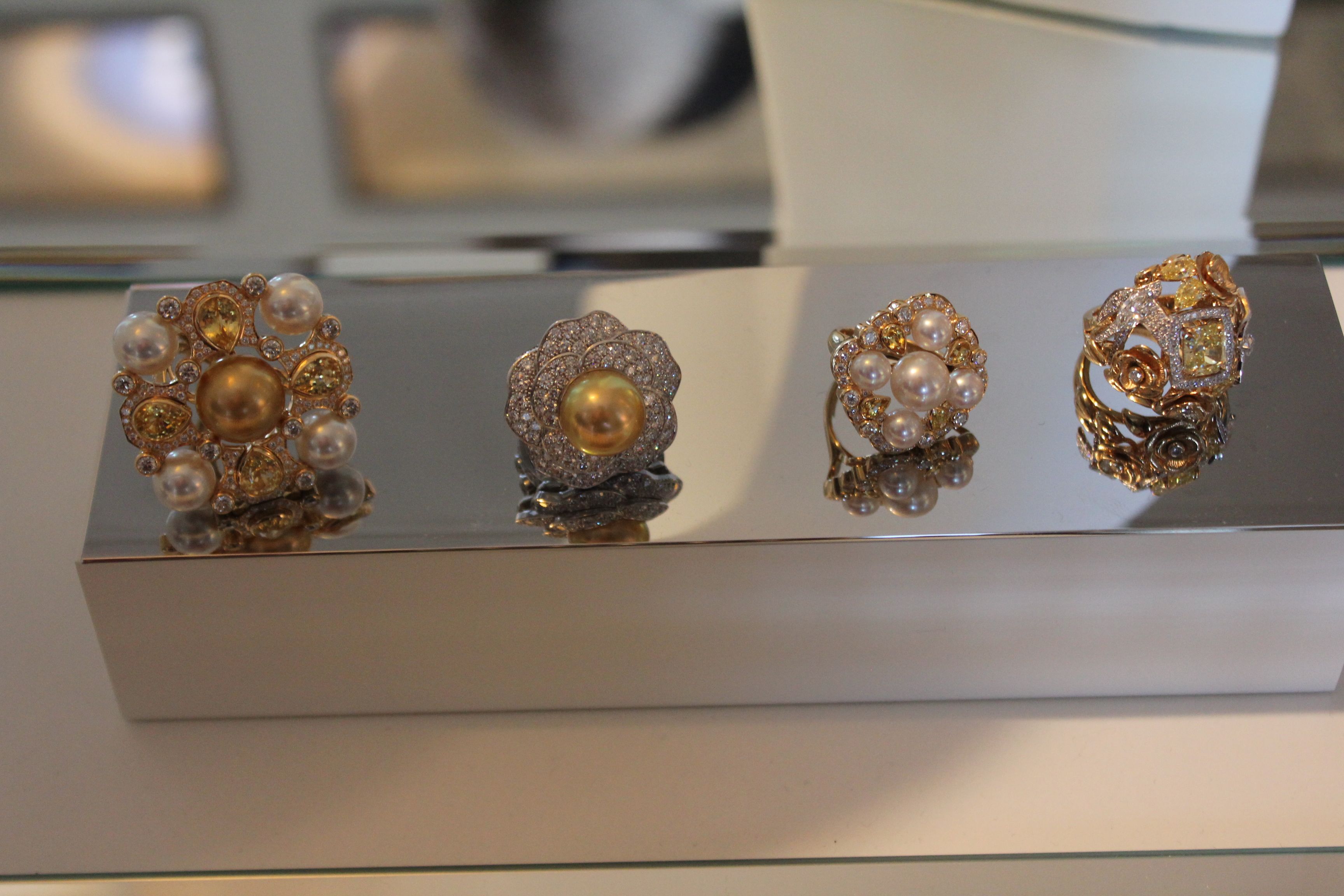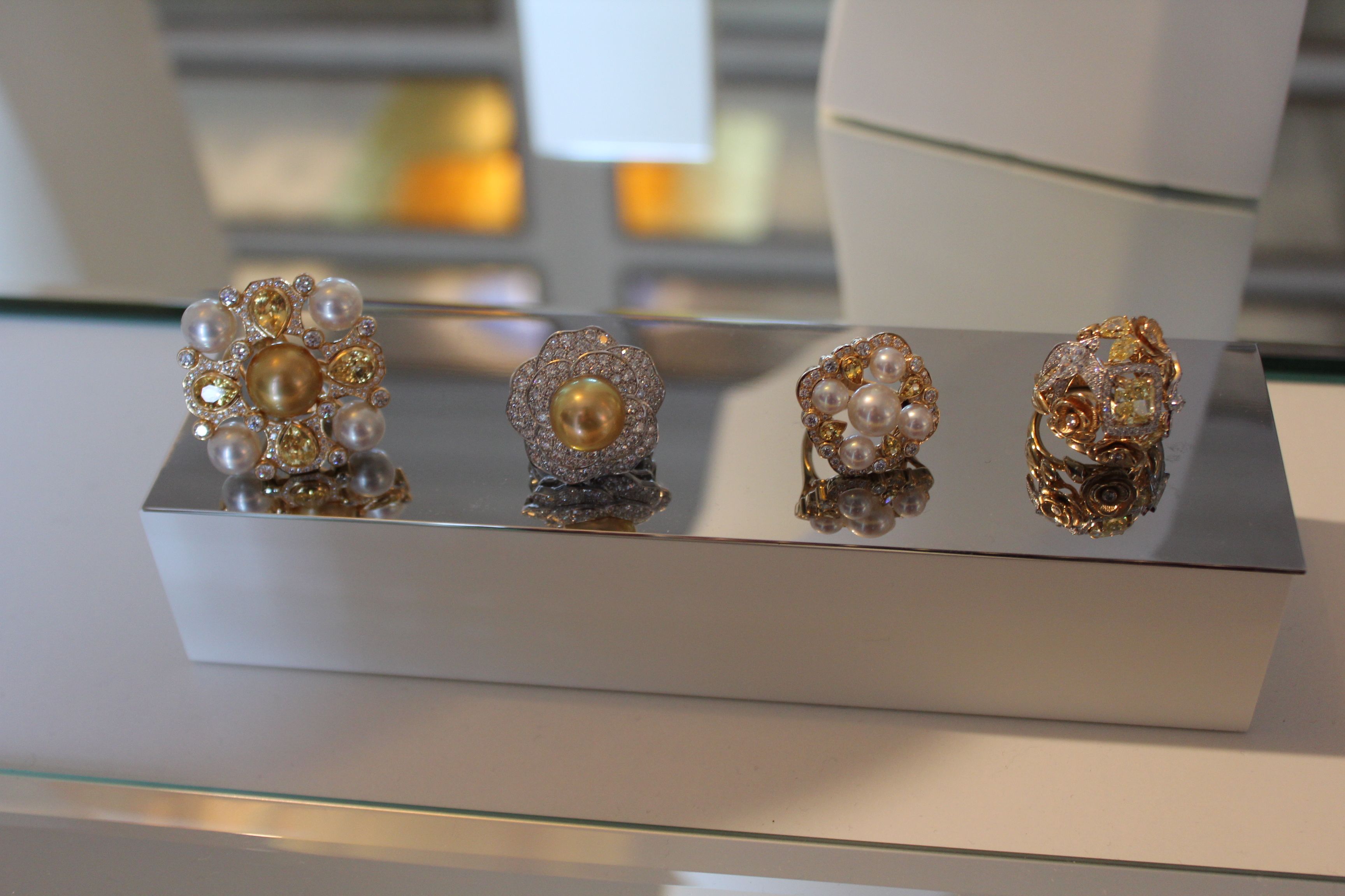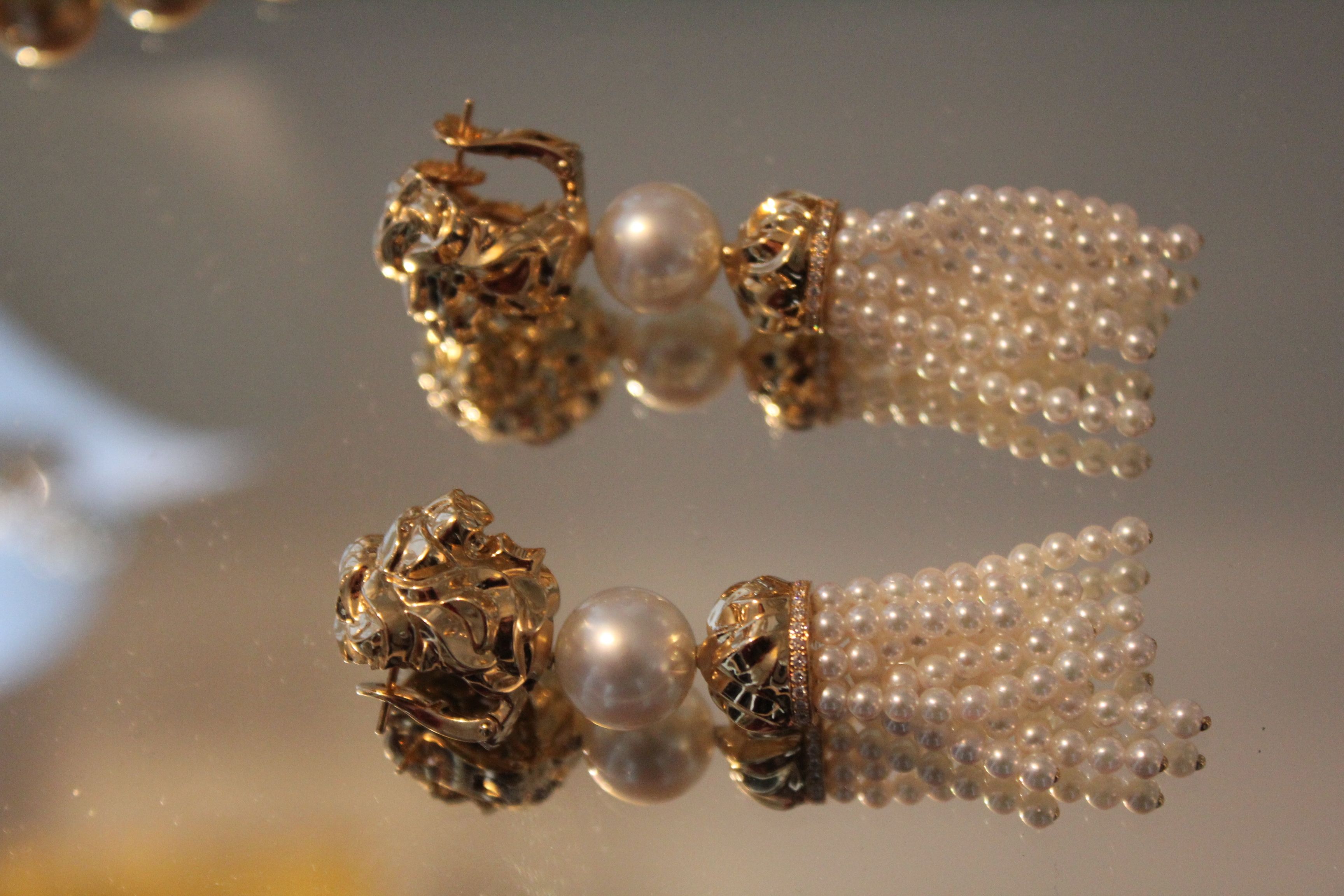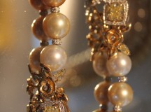 Perles blanches, noires ou gold aux nuances chaudes, perles rosées, s’associent à l’or jaune ou blanc. Diamants, diamants jaunes, saphirs, tourmalines, aigues marines, améthystes, viennent les sublimer dans de subtils jeux de camaïeux.