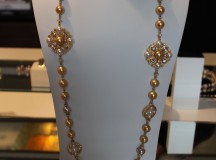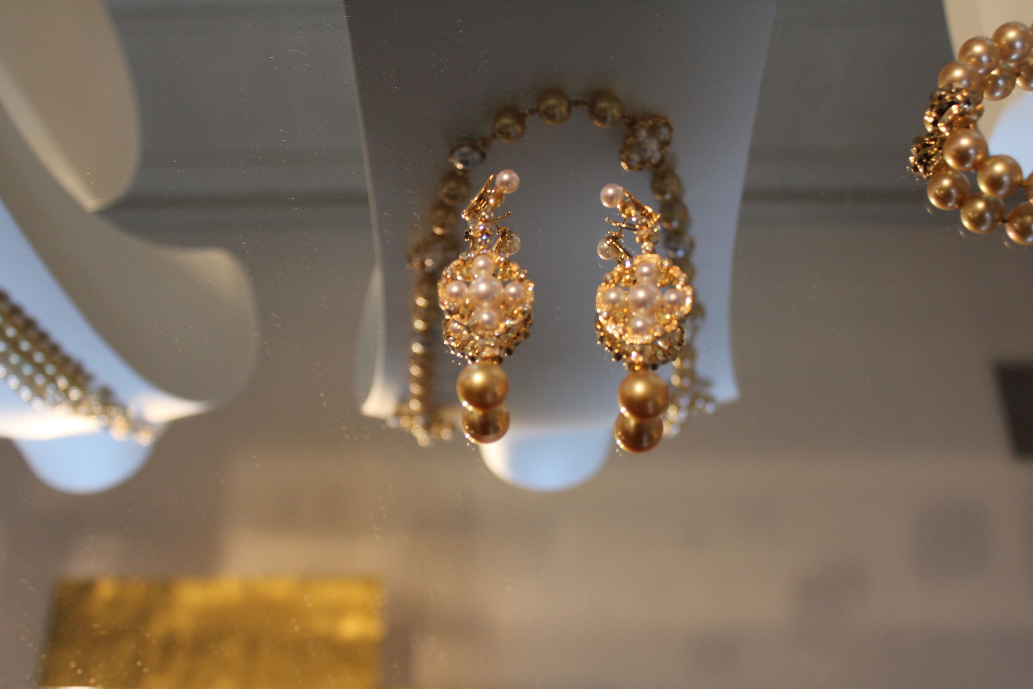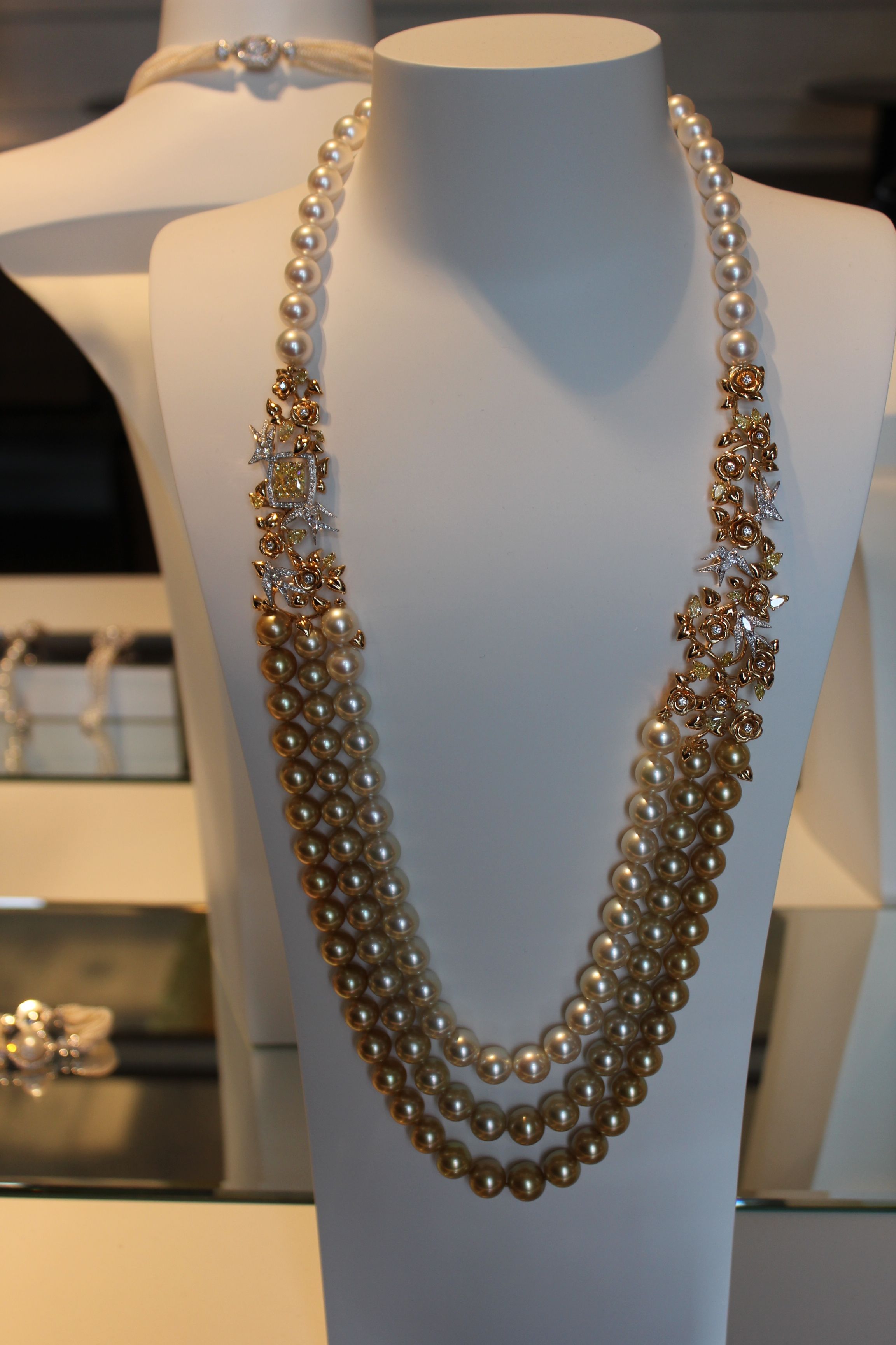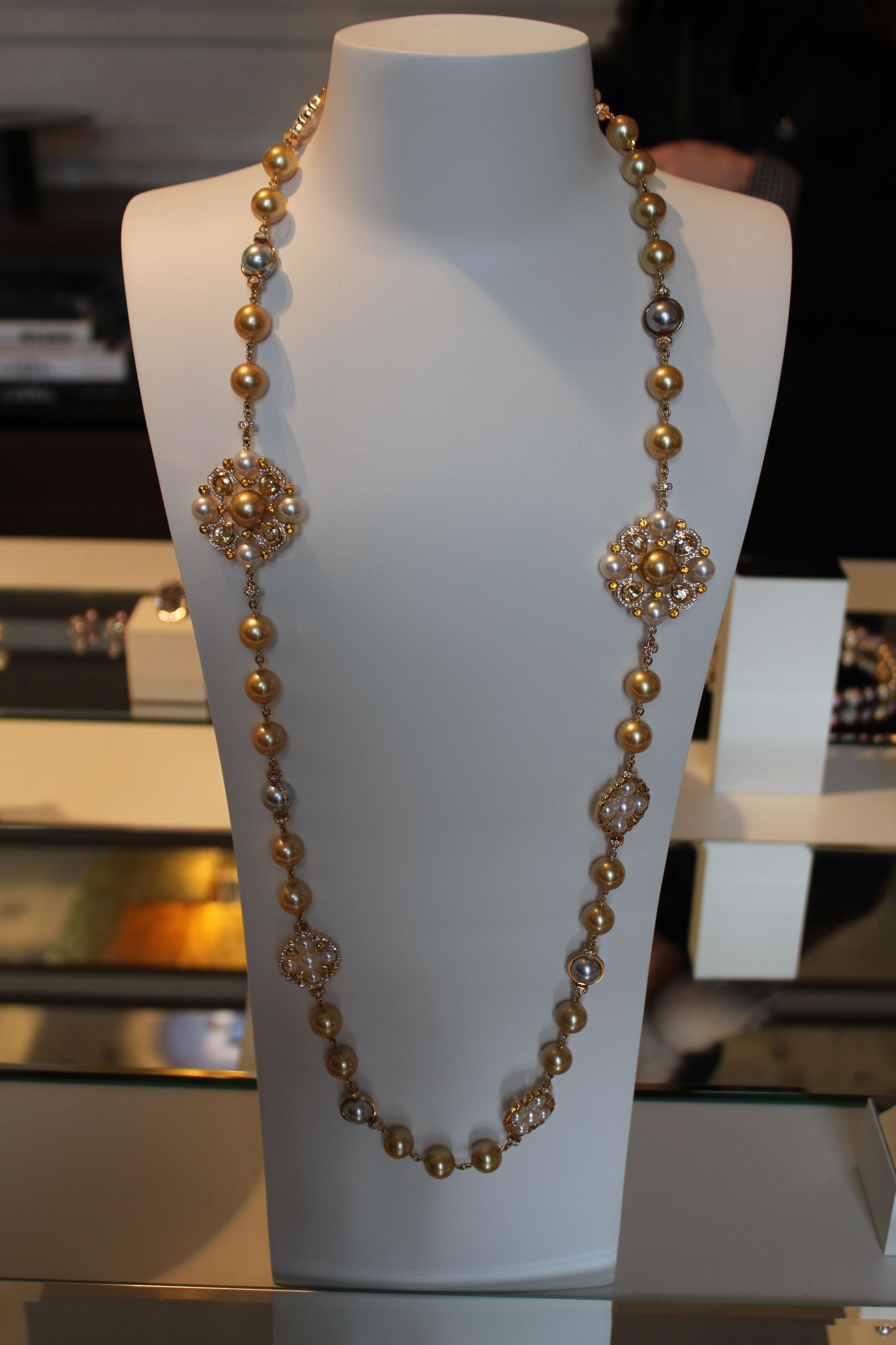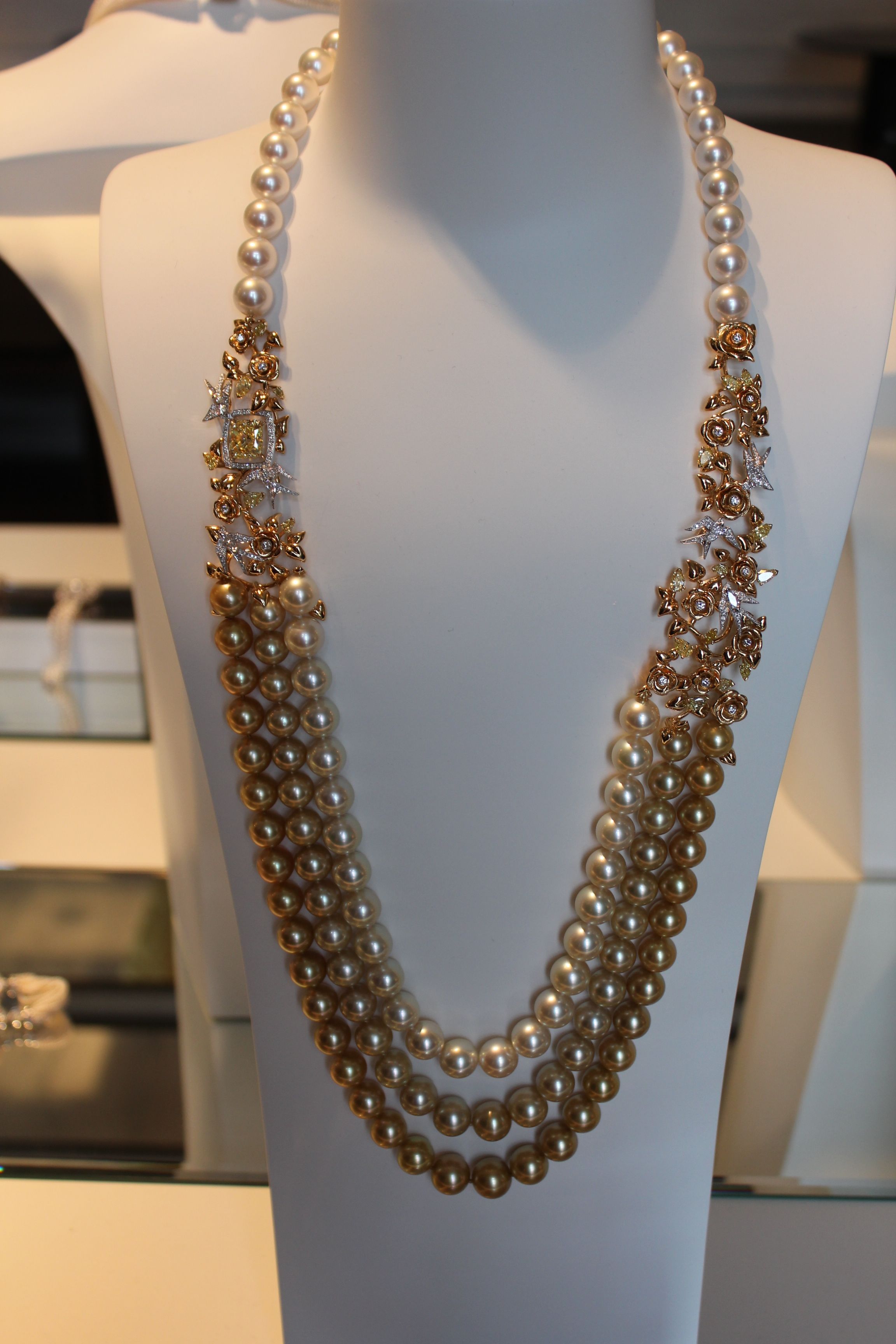 Le collier «Perles Royales» marie d’exceptionnelles perles gold à des diamants blancs et jaunes sur platine.