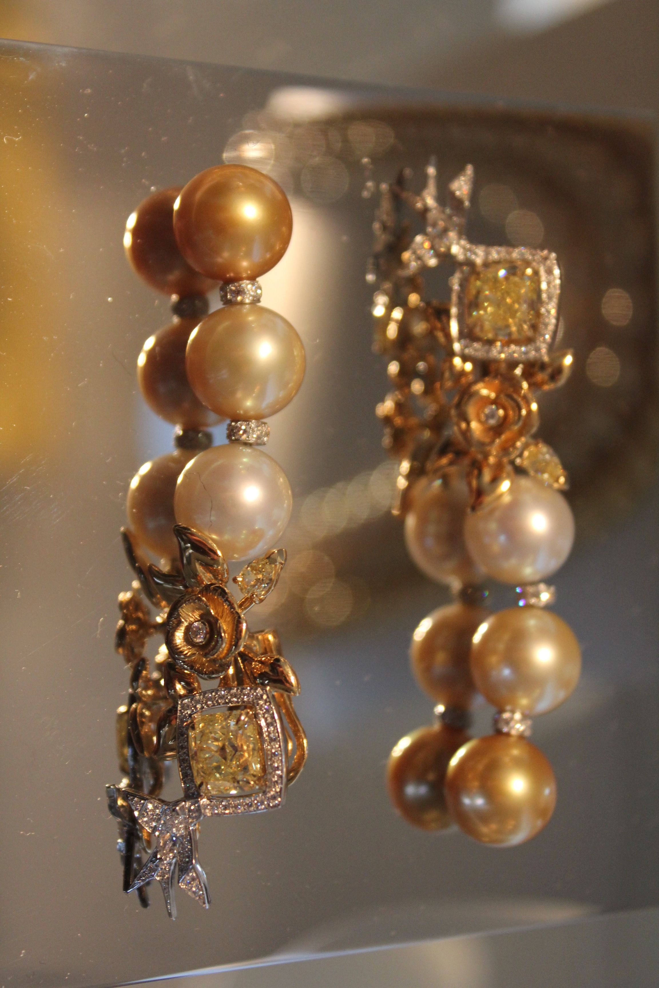 Boucles d’oreilles « San Marco » en or jaune 18 carats serti de 126 diamants taille brillant pour un poids total de 2 carats, 10 saphirs jaunes taille poire pour un poids total de 1,9 carat, 2 perles de culture des Mers du Sud de 12,4 mm de diamètre et 12 perles de culture du Japon.