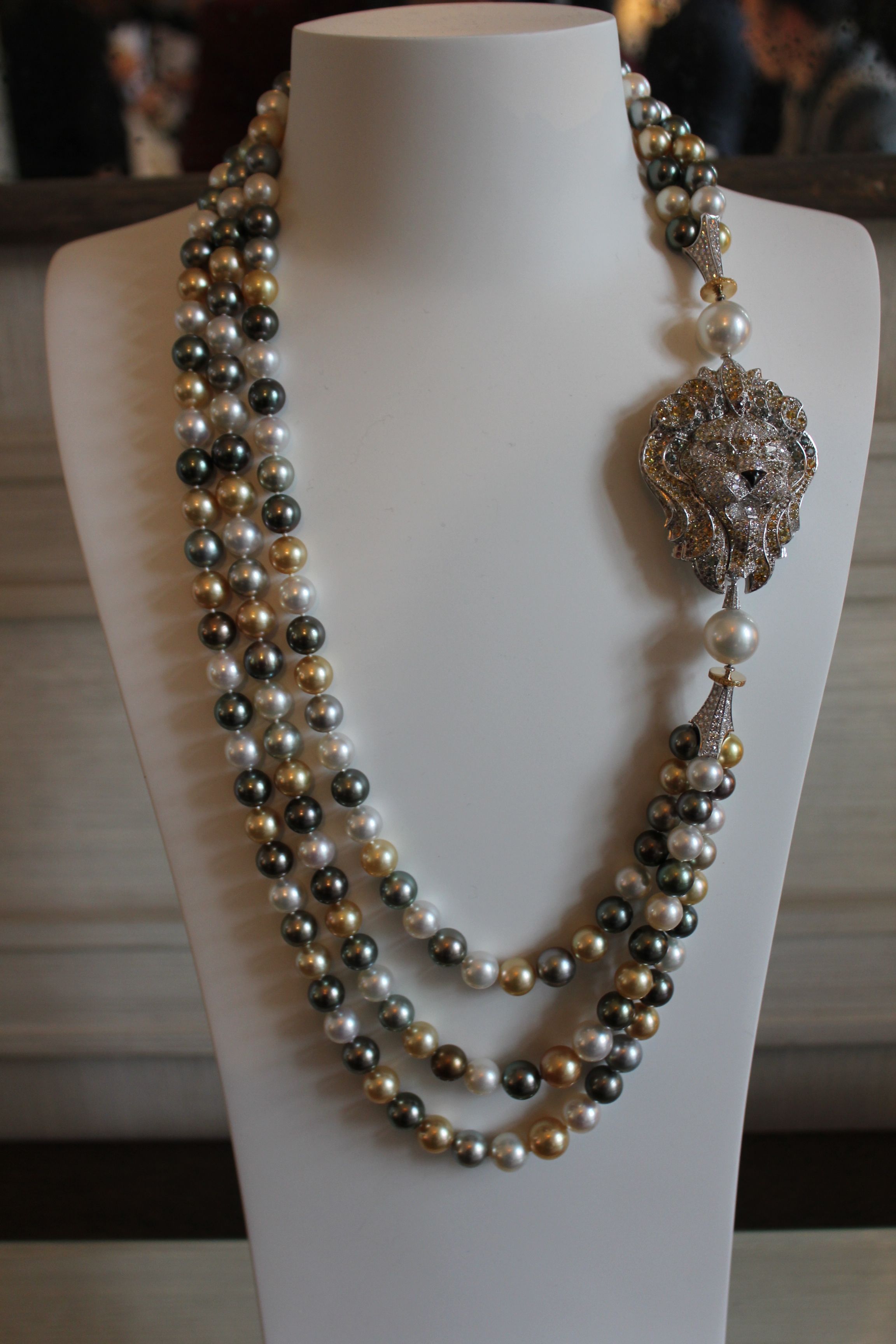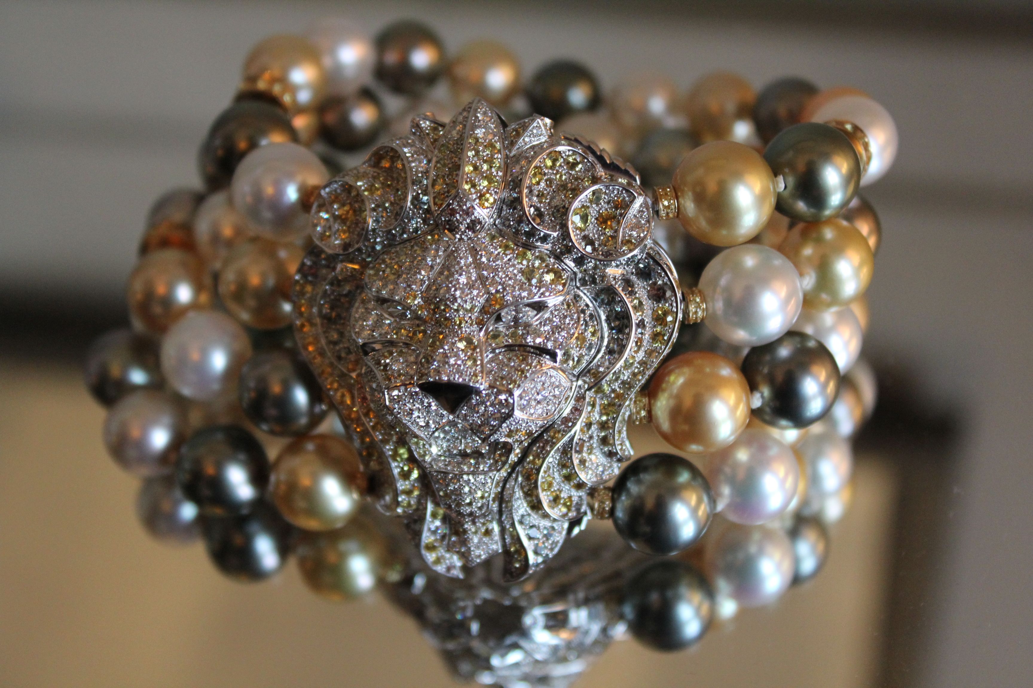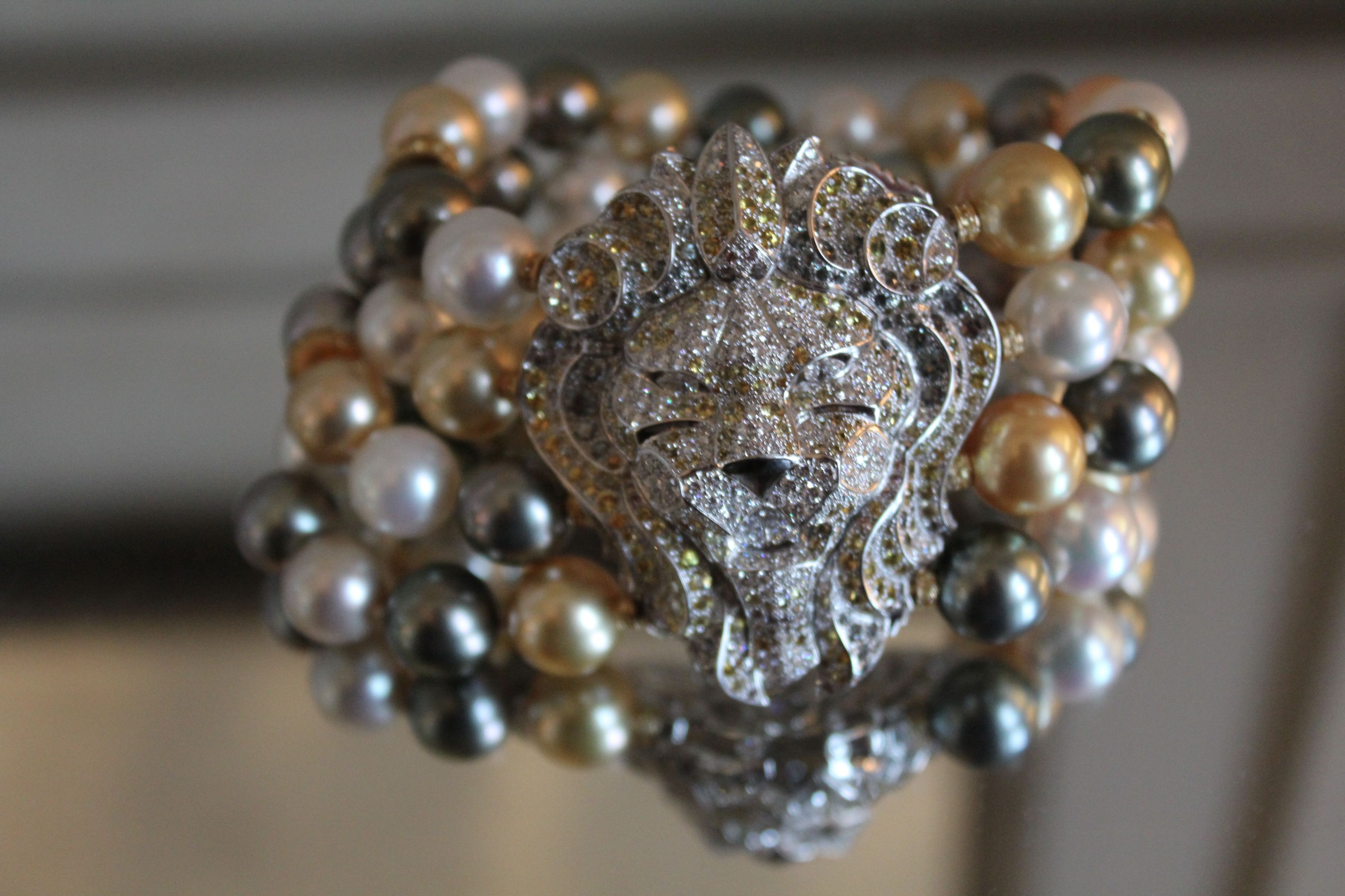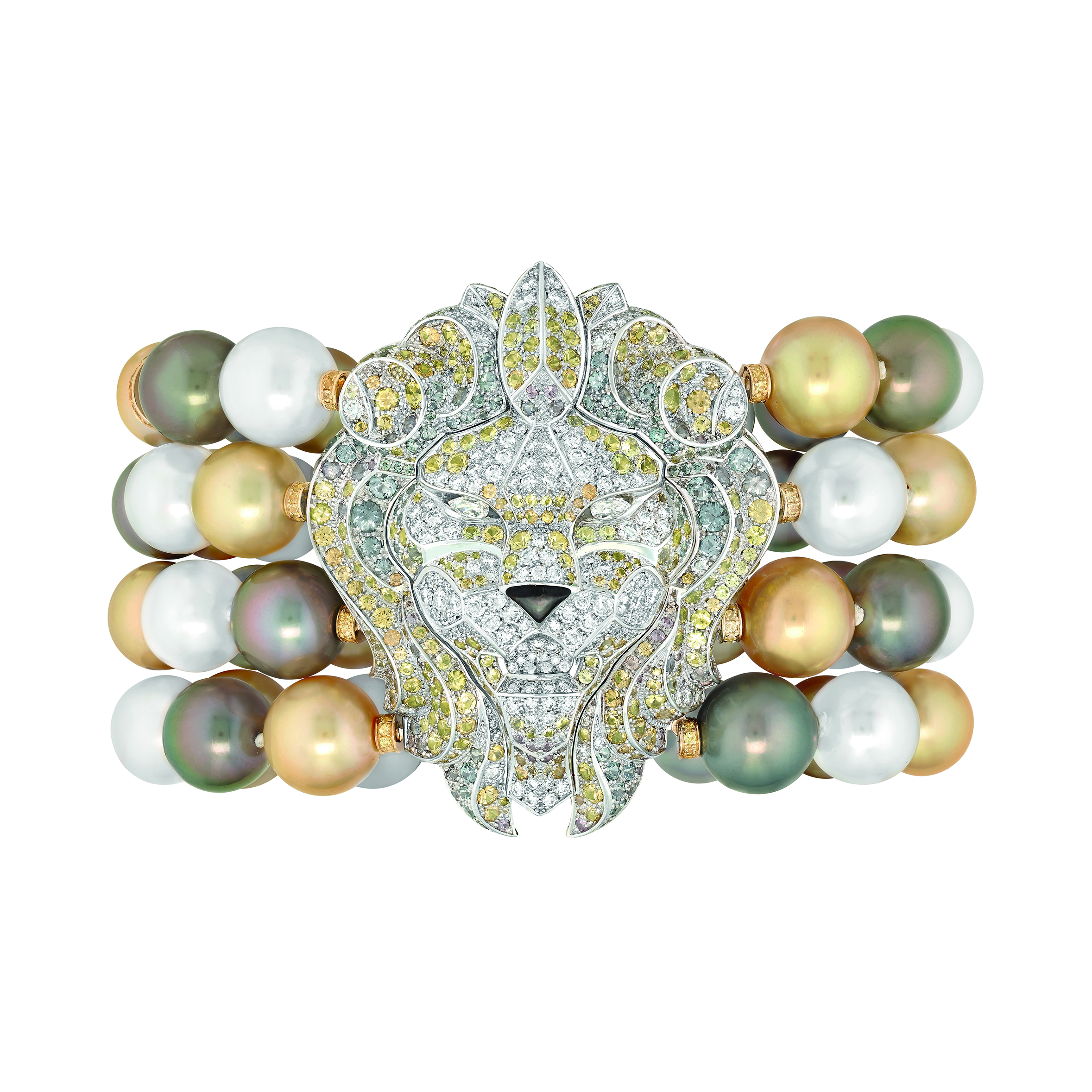 Bracelet « Lion Baroque » en or blanc et jaune 18 carats sertis de 219 diamants taille brillant pour un poids total de 4,2 carats, 2 diamants taille poire, 563 saphirs multicolores taille brillant pour un poids total de 12,8 carats, 62 perles de culture de Tahiti et des Mers du Sud de 10 à 11,4 mm de diamètre et nacre grise.