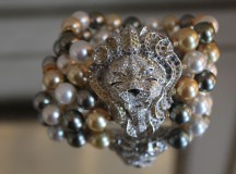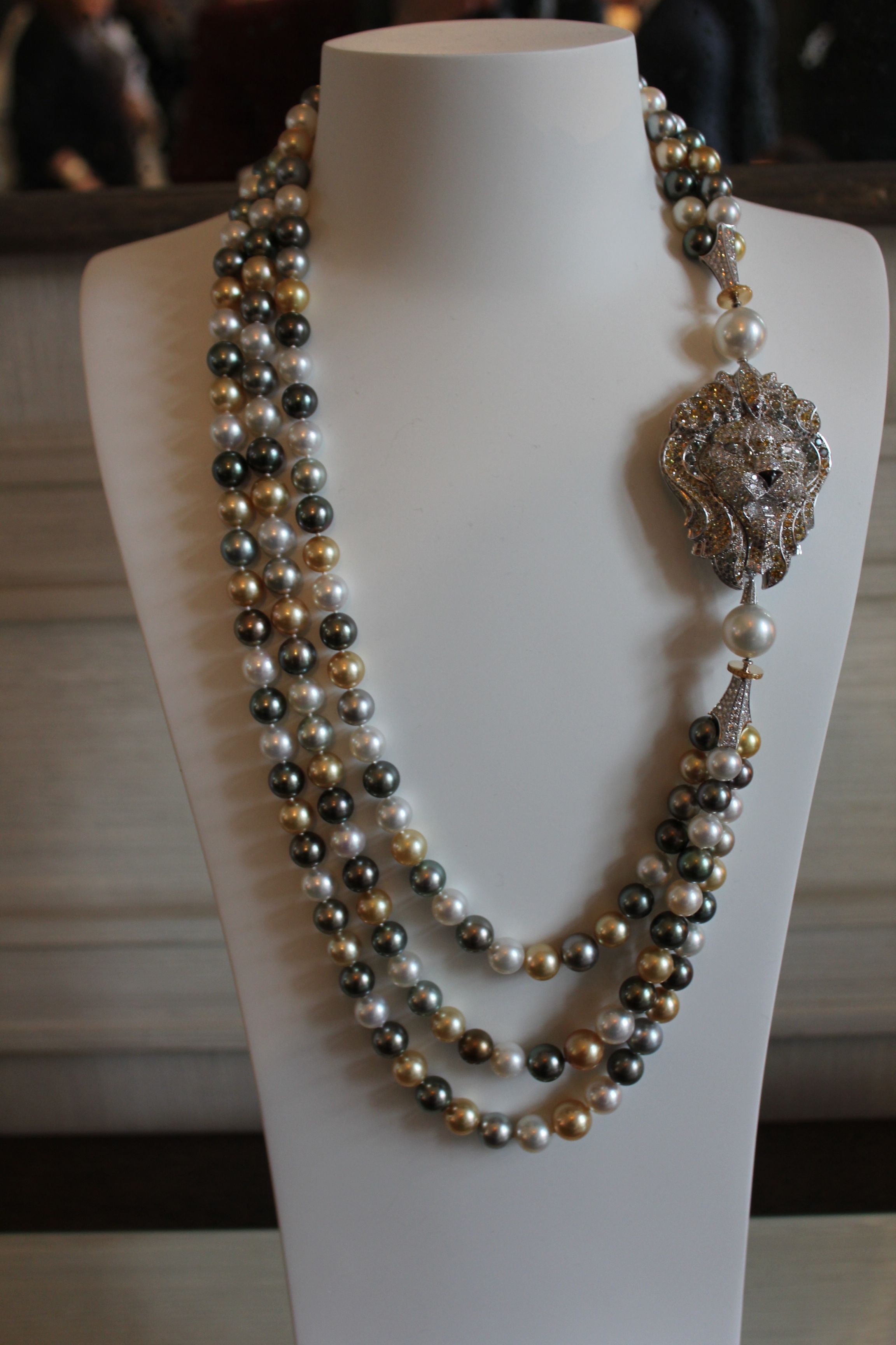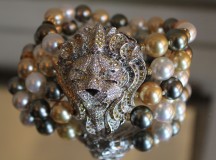Quant au sautoir «Lion Baroque», mêlant perles blanches, noires et gold, il est théâtralisé par une tête de lion dont le pavage de saphirs en dégradé s’harmonise à l’orient des perles.