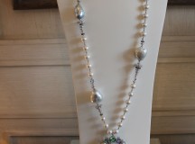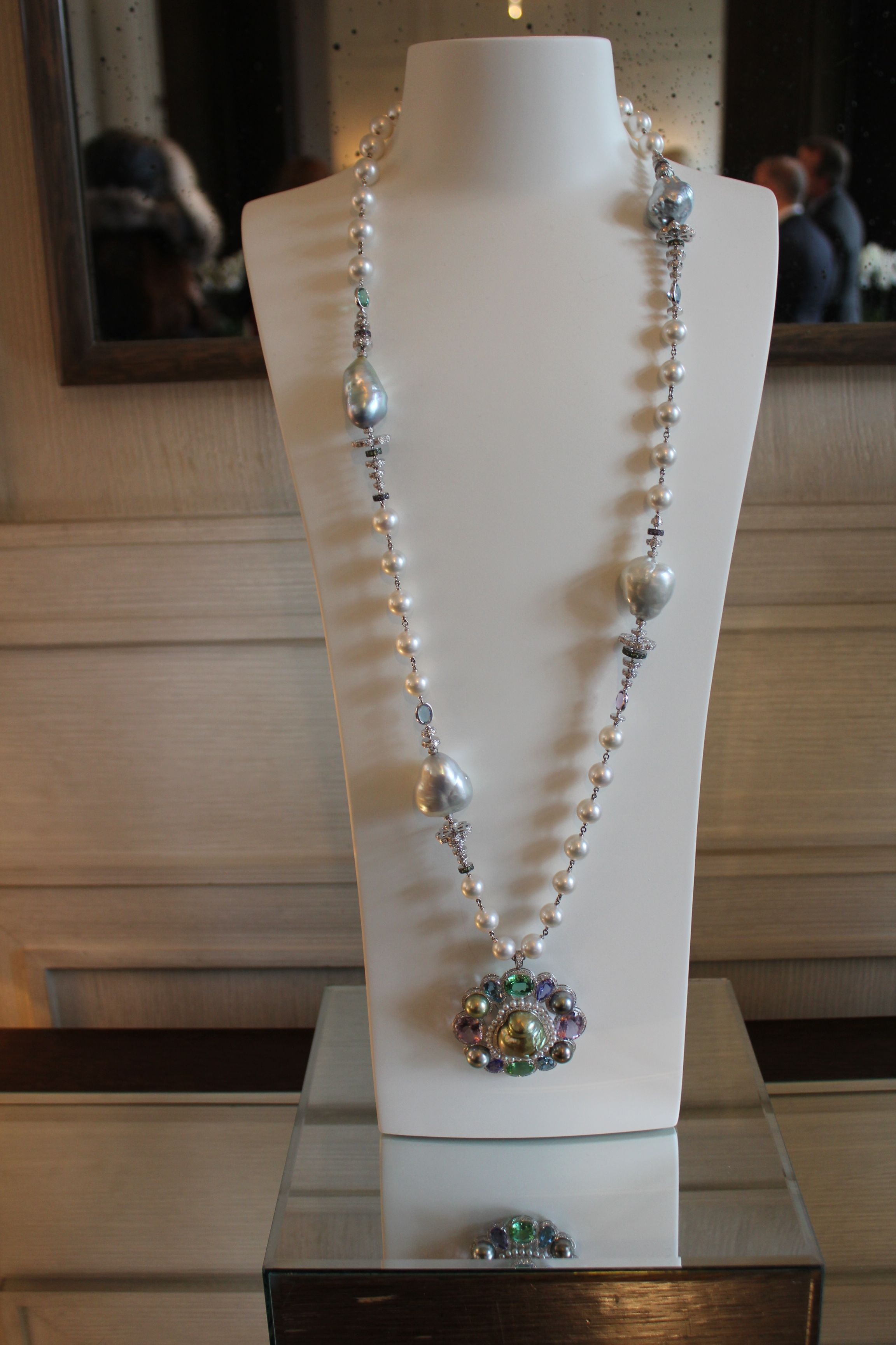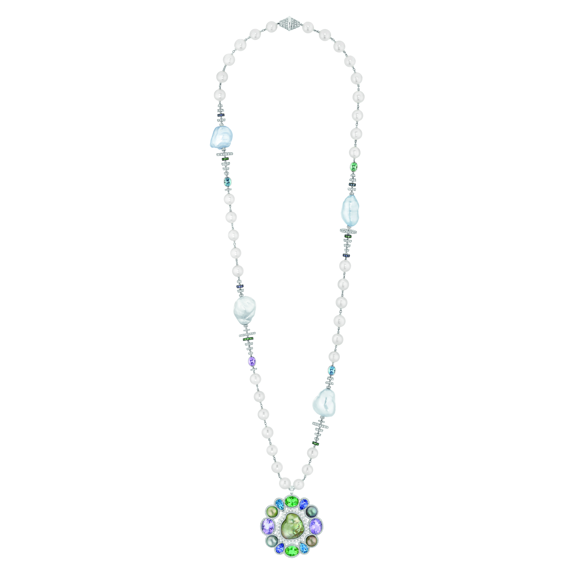 Collier « Perles Baroques » en or blanc 18 carats serti de 950 diamants taille brillant pour un poids total de 11,2 carats, 50 saphirs bleus et violets taille brillant pour un poids total de 1,2 carat, 3 améthystes taille ovale pour un poids total de 20,9 carats, 3 tourmalines bleu-vert et vertes taille ovale pour un poids total de 17 carats, 4 aigue-marines pour un poids total de 8,5 carats, 2 tanzanites bleues taille poire pour un poids total de 7 carats, 5 perles de culture baroques d’Australie, 35 perles de culture des mers du Sud de 11 à 12 mm de diamètre, 4 perles de culture de Tahiti de 11,5 à 11,8 mm de diamètre et 28 perles de culture du Japon. Pendentif amovible, peut être porté en broche.