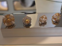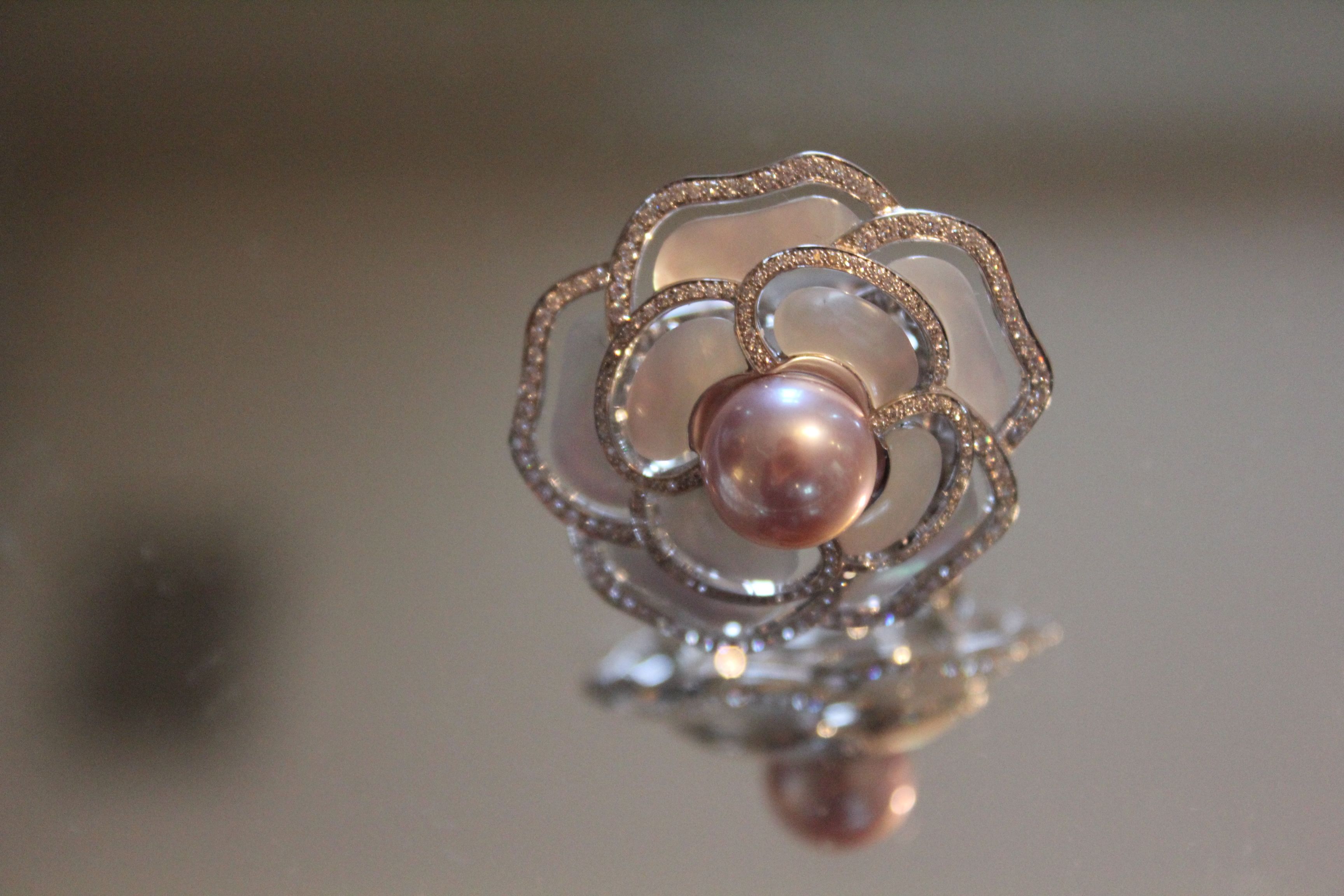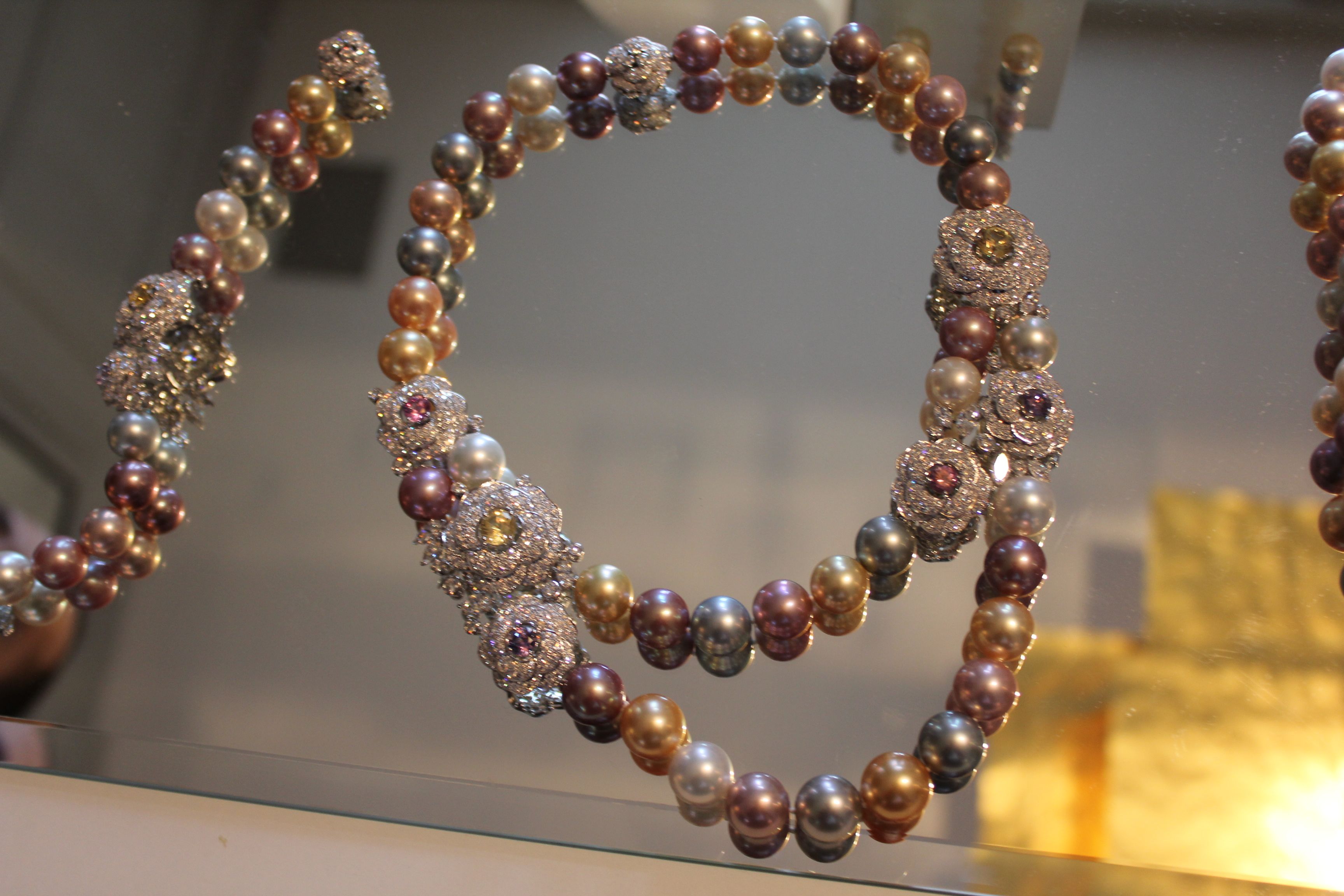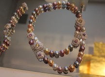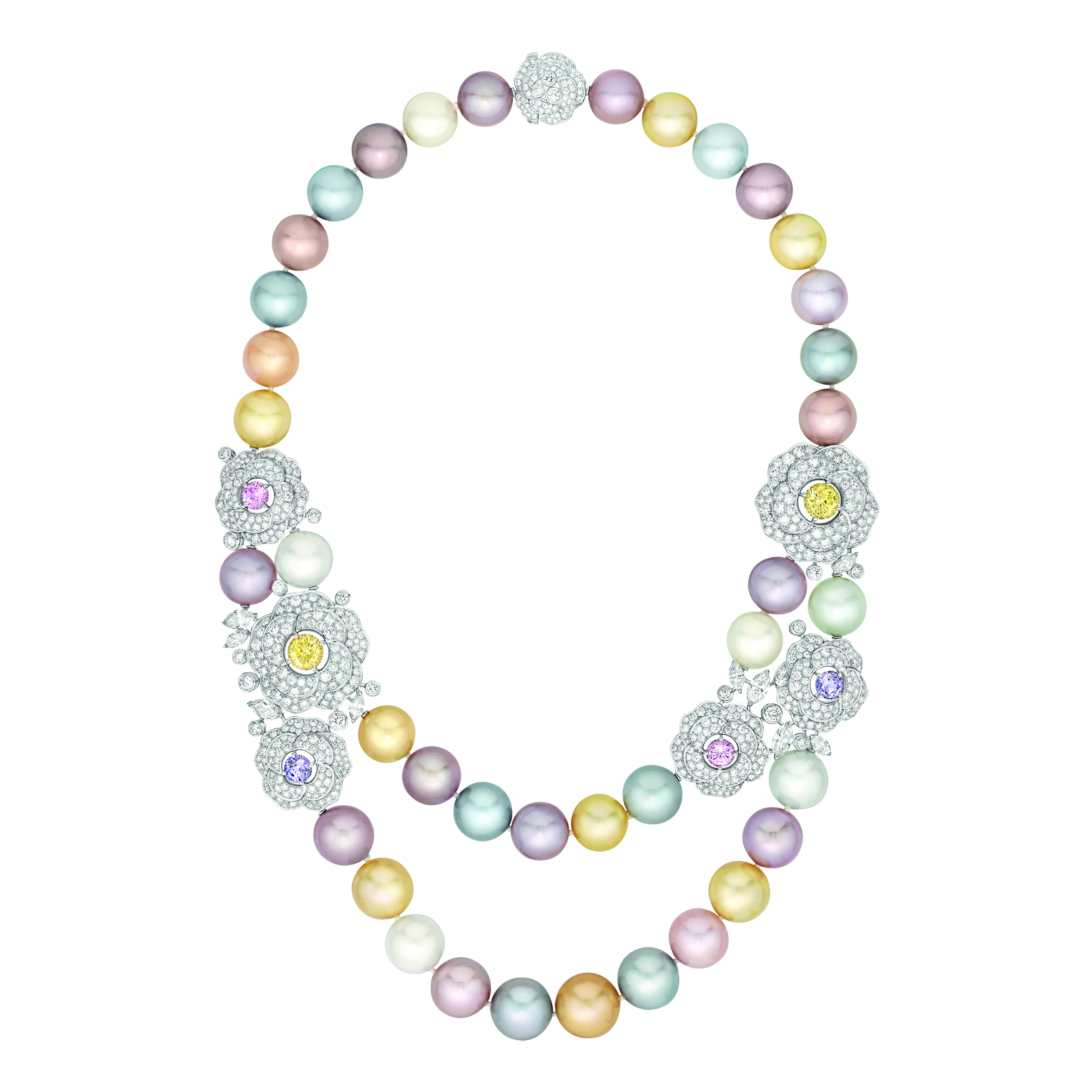 La parure «Printemps de Camélia», constituée de perles multicolores, fait fleurir des camélias de diamants dont le cœur de saphirs de couleurs reprend les tonalités délicates des perles.