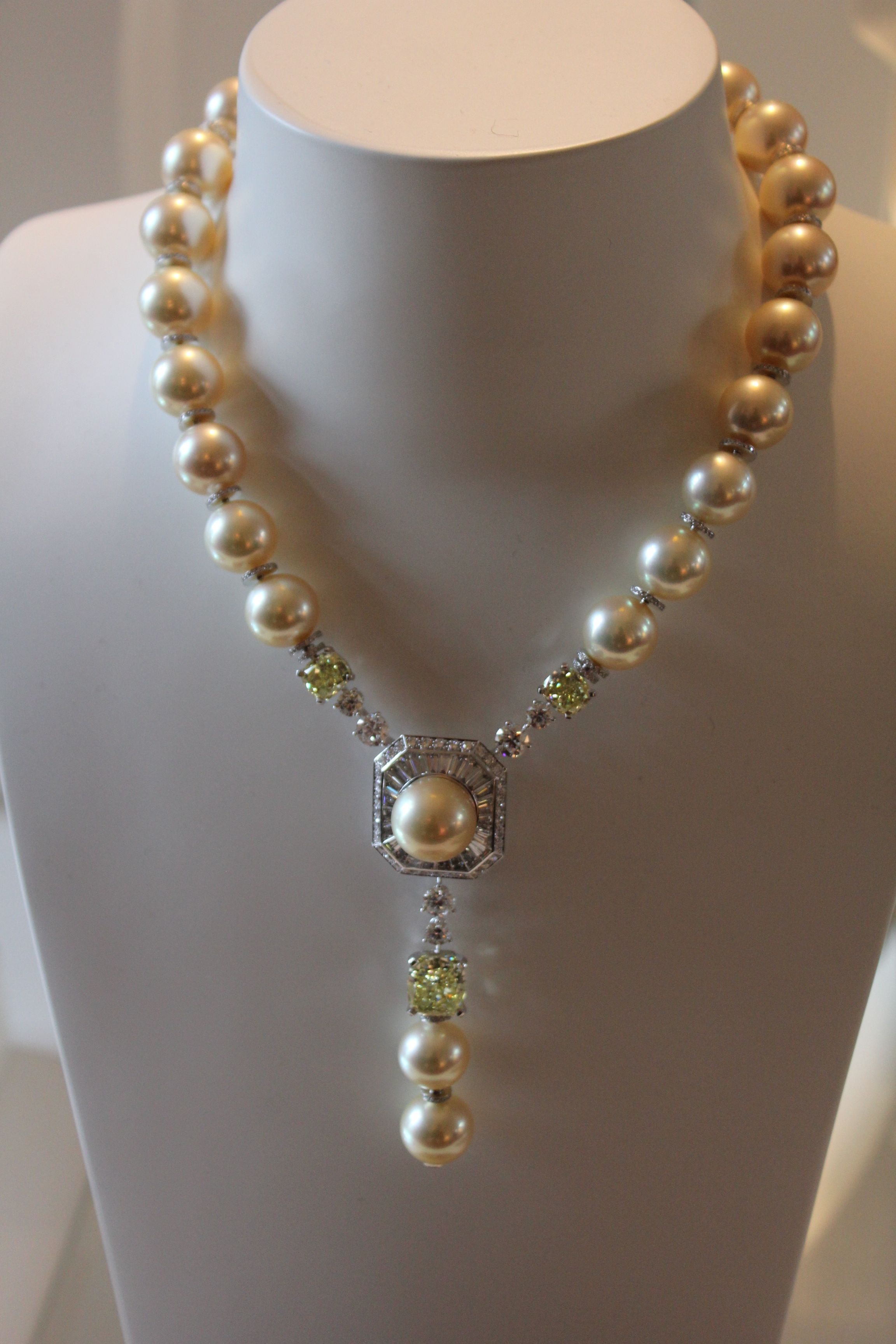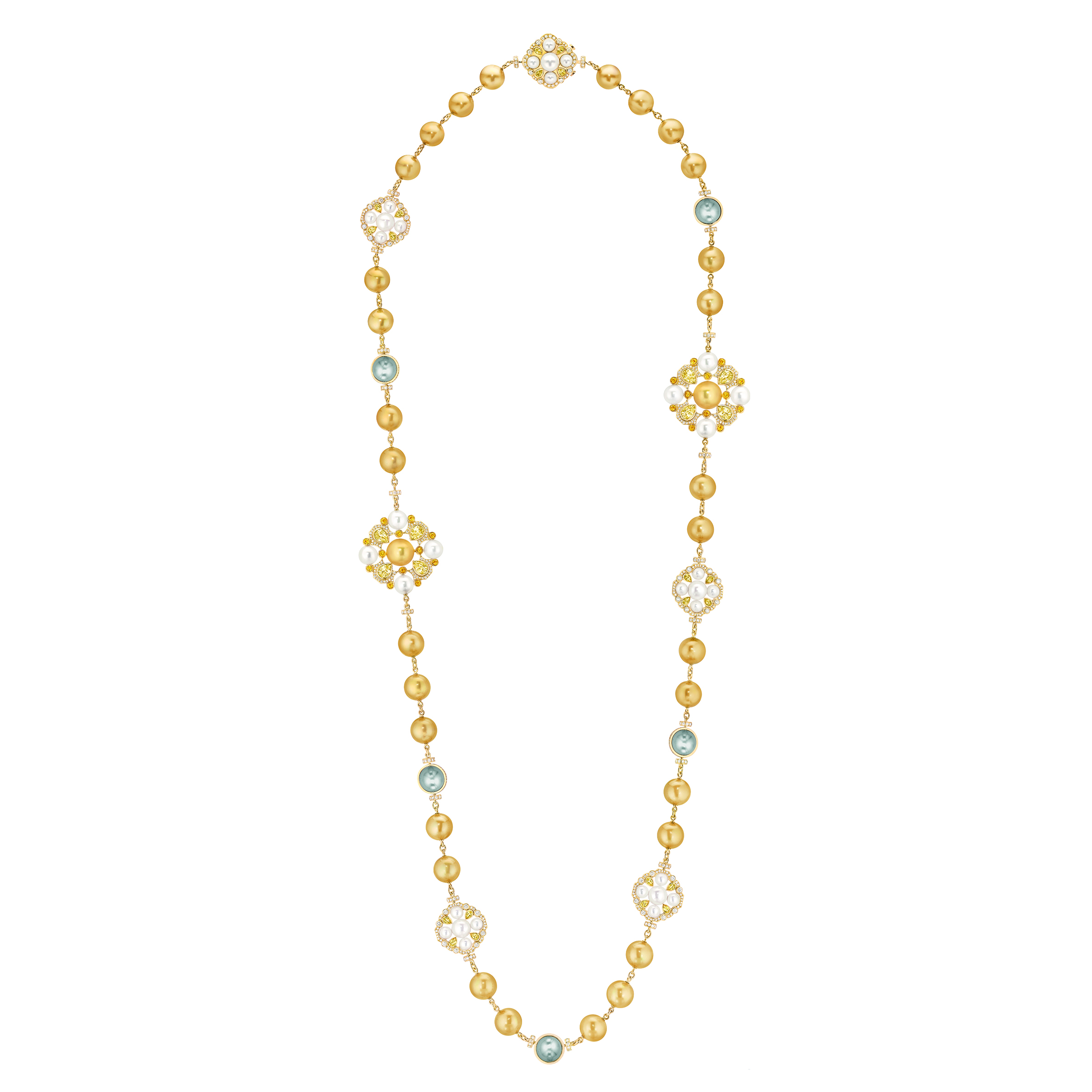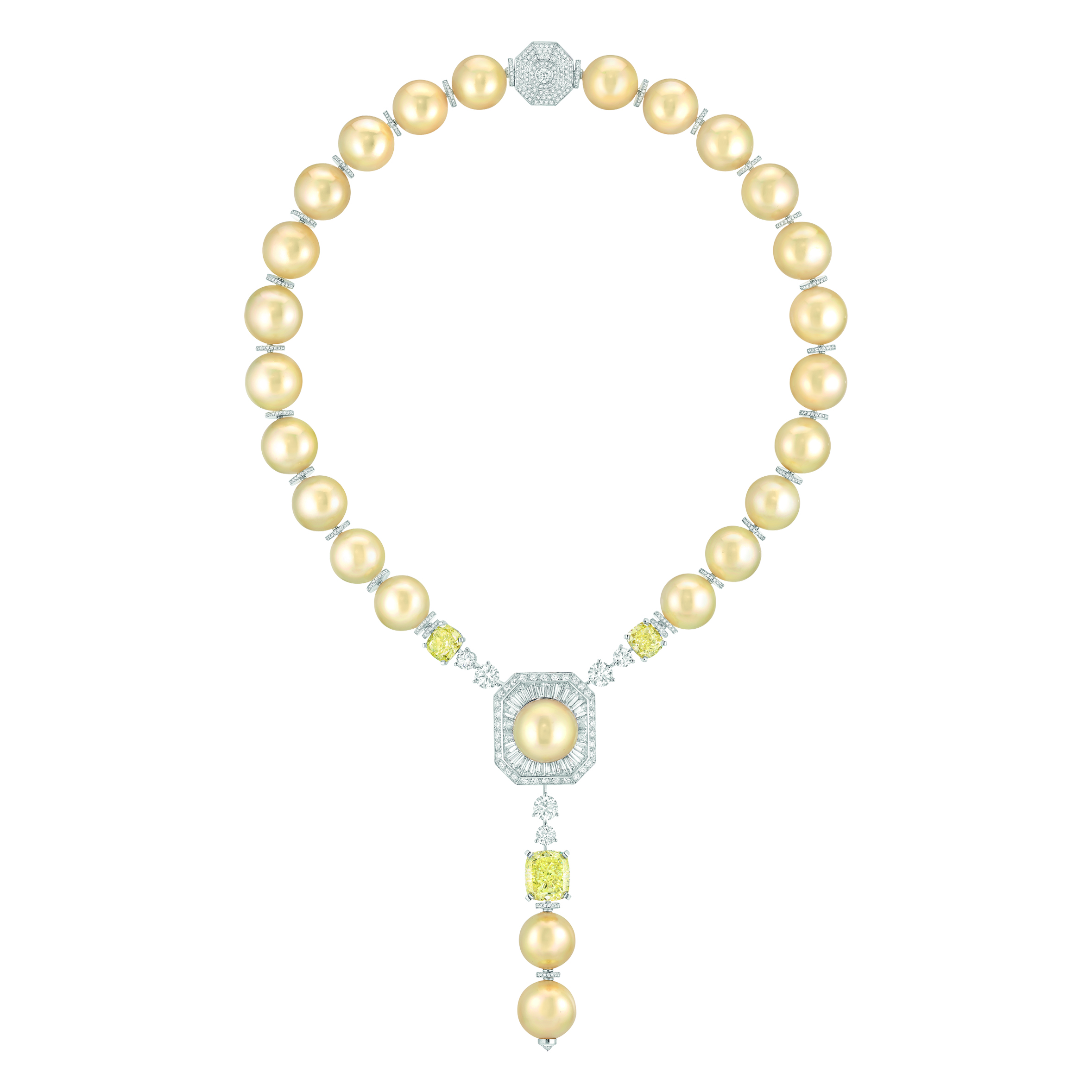 Collier «San Marco » en or jaune 18 carats serti de 736 diamants taille brillant pour un poids total de 8,7 carats, 28 saphirs jaunes taille poire pour un poids total de 17,3 carats, 40 perles de culture des Mers du Sud de 9,3 à 14 mm de diamètre, 5 perles de culture de Tahiti de 12 mm de diamètre et 25 perles de culture du Japon.