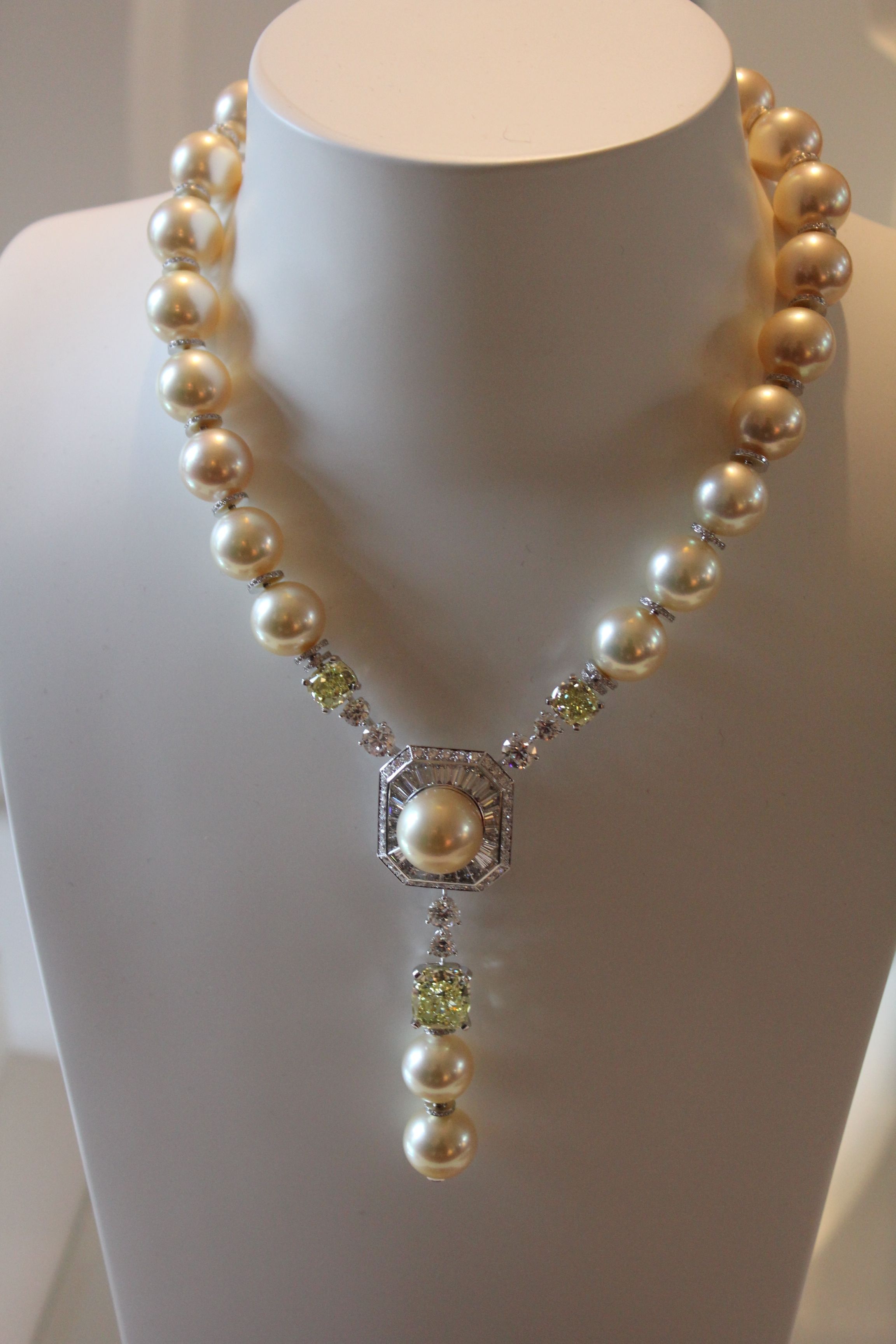 Collier « Perles Royales » en or blanc 18 carats et platine sertis de 3 diamants jaunes taille coussin de 3,6 et 3,4 et 10 carats, 1025 diamants taille brillant pour un poids total de 11,2 carats, 24 diamants taille baguette pour un poids total de 4,8 carats et 25 perles de culture des Mers du Sud de 14 à 16,2 mm de diamètre.