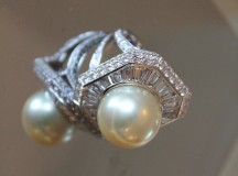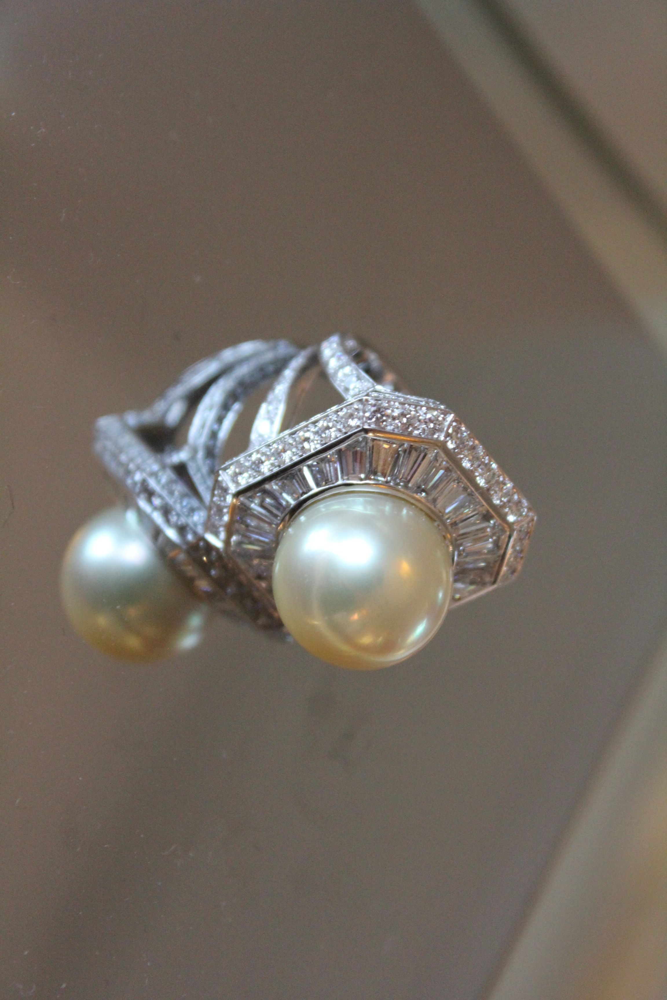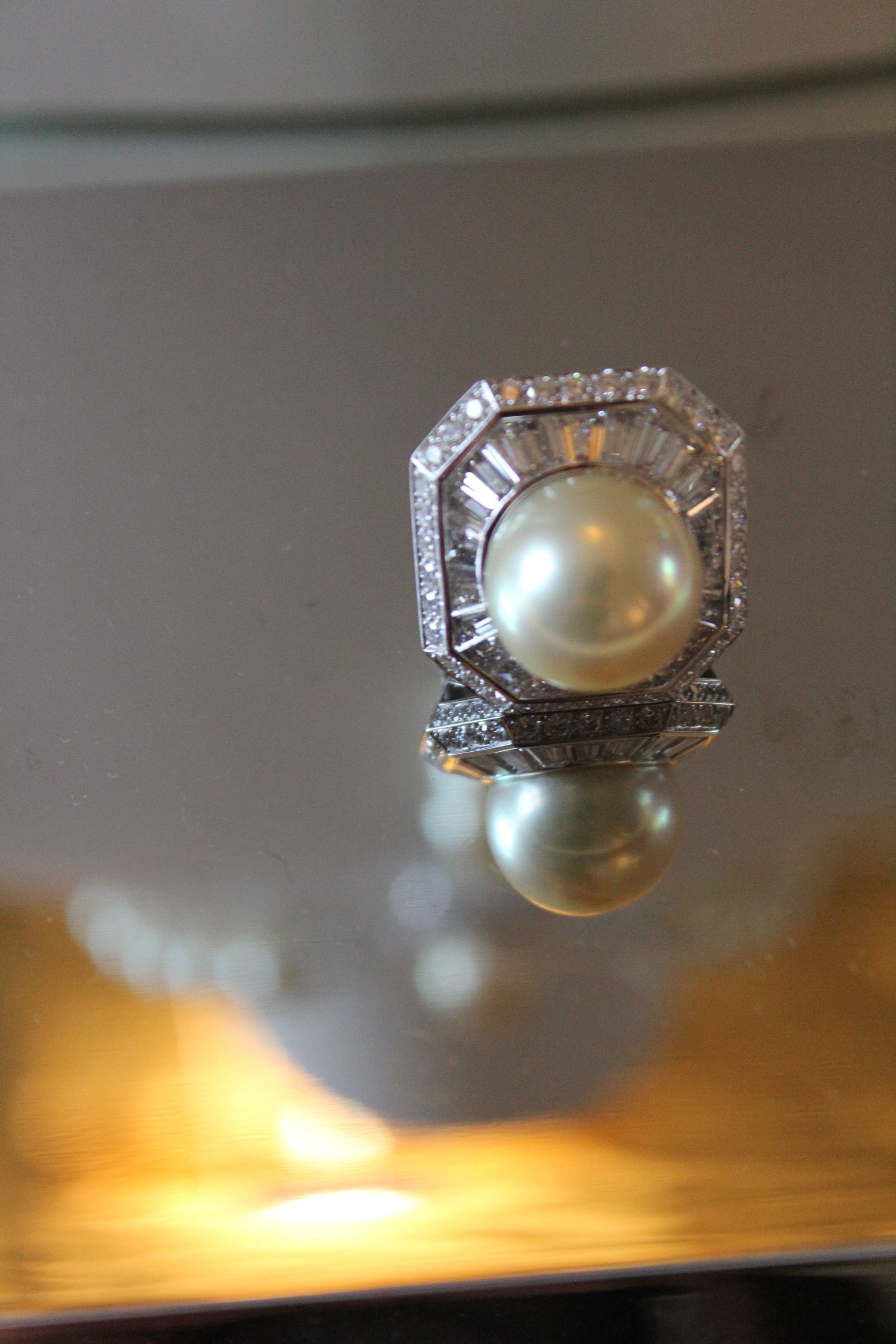 Bague « Perles de Couture» en or blanc 18 carats serti de 205 diamants taille brillant pour un poids total de 3,2 carats, 1 perle de culture des Mers du Sud de 13,7 mm de diamètre et 24 perles de culture du Japon.